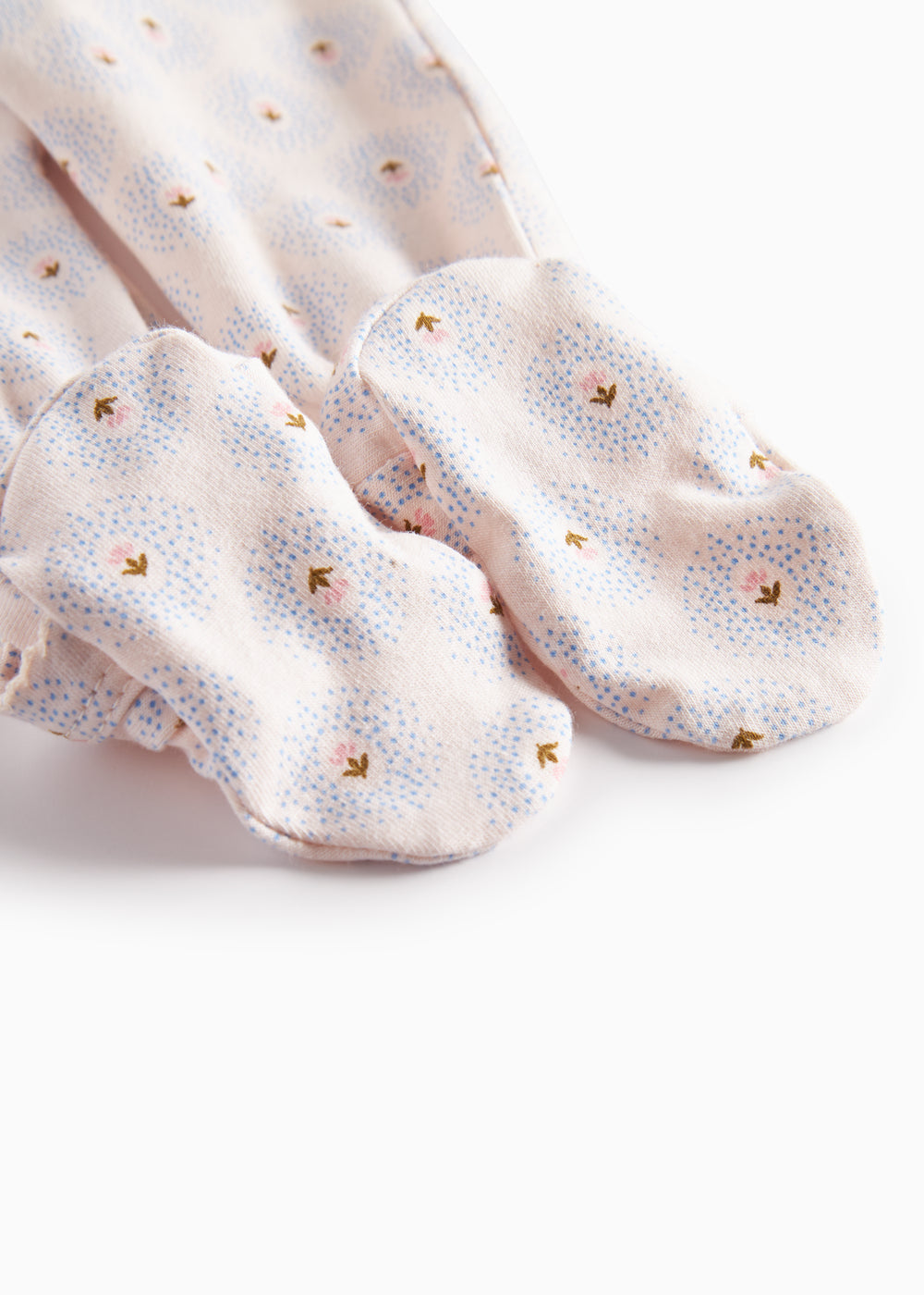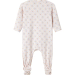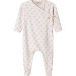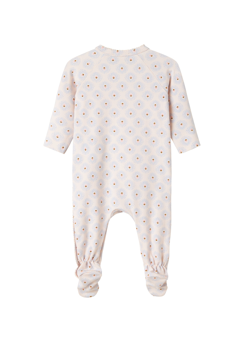 Long-sleeved jumpsuit with feet for newborns. The jumpsuit has a wrap-around closure and closes with snaps and ties from the neck down one leg. The jumpsuit has a nice print and is both soft, stretchy and comfortable to wear.