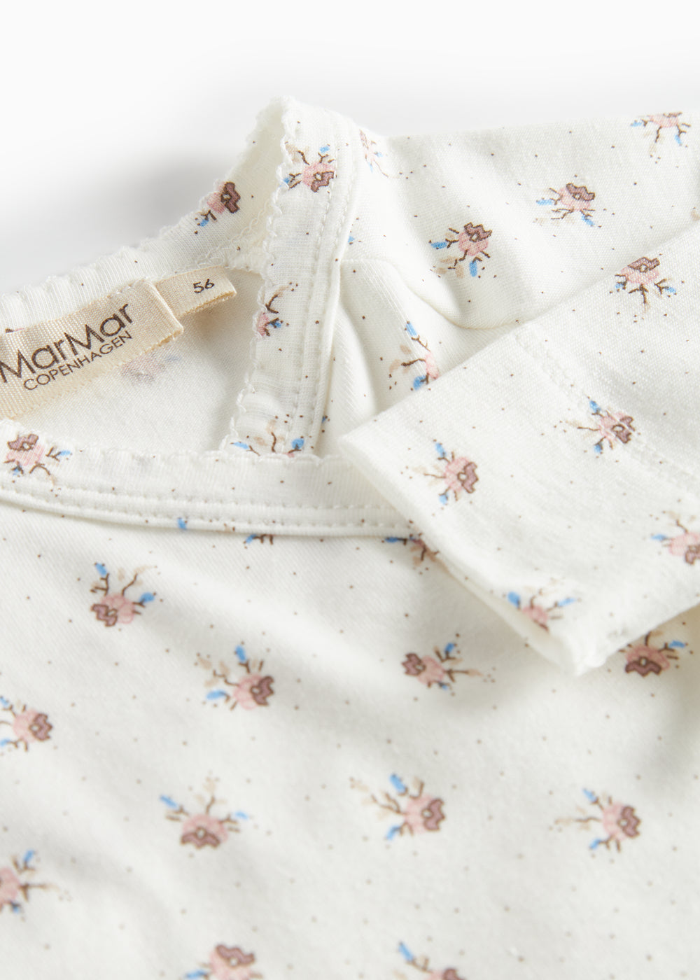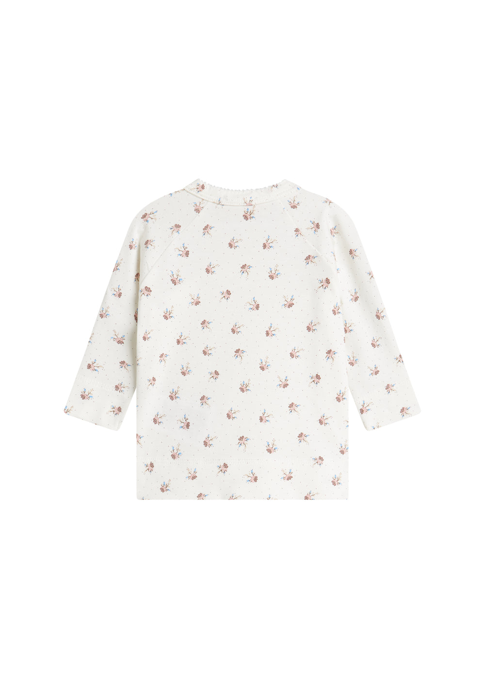 Long-sleeved blouse for newborns with a wrap-around closure. The blouse closes with snaps and ties and has a nice print and is both soft, stretchy and comfortable to wear.
