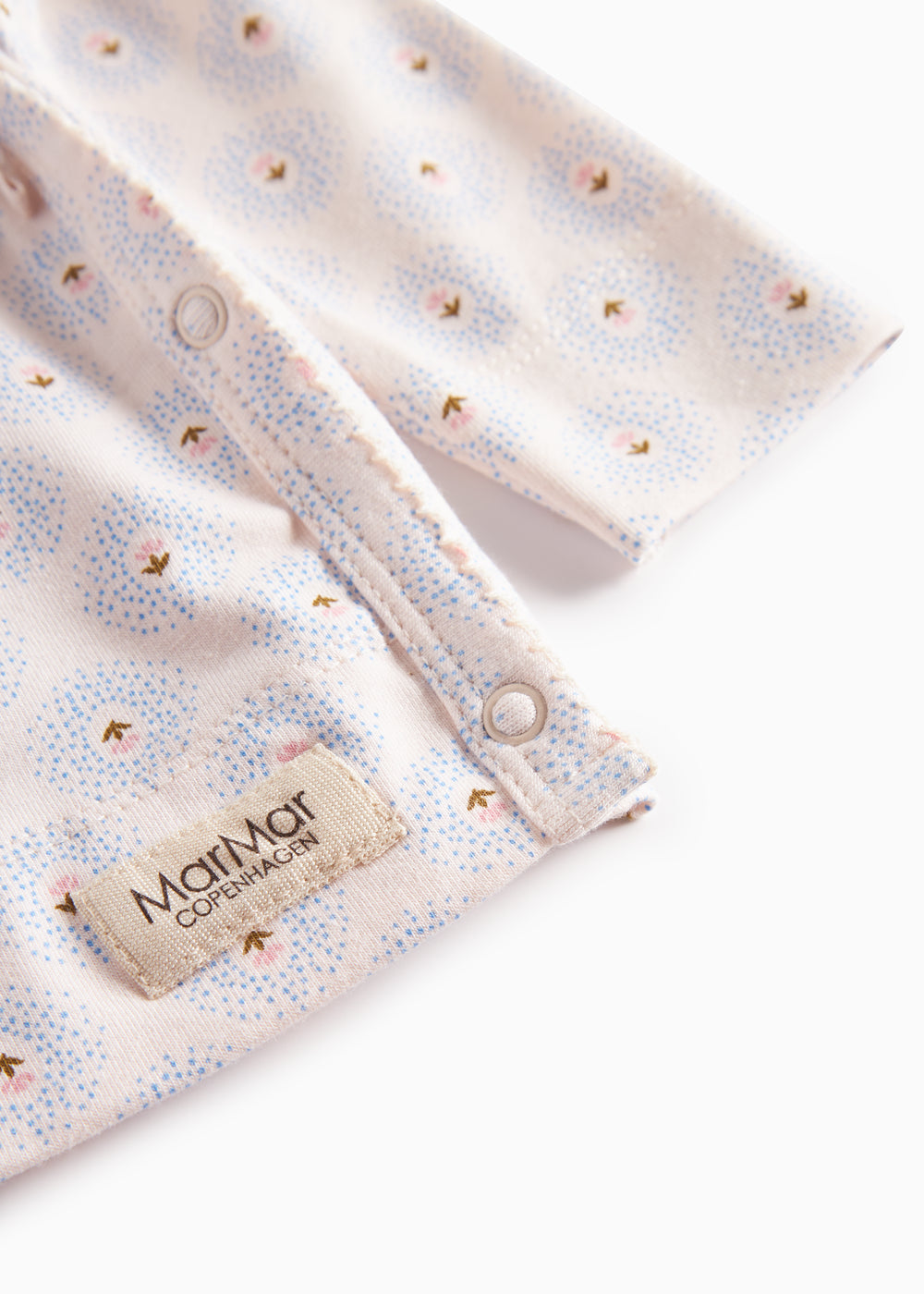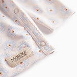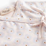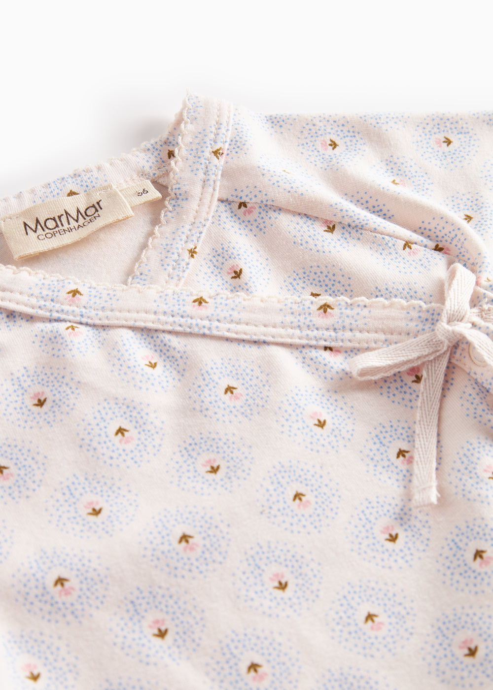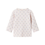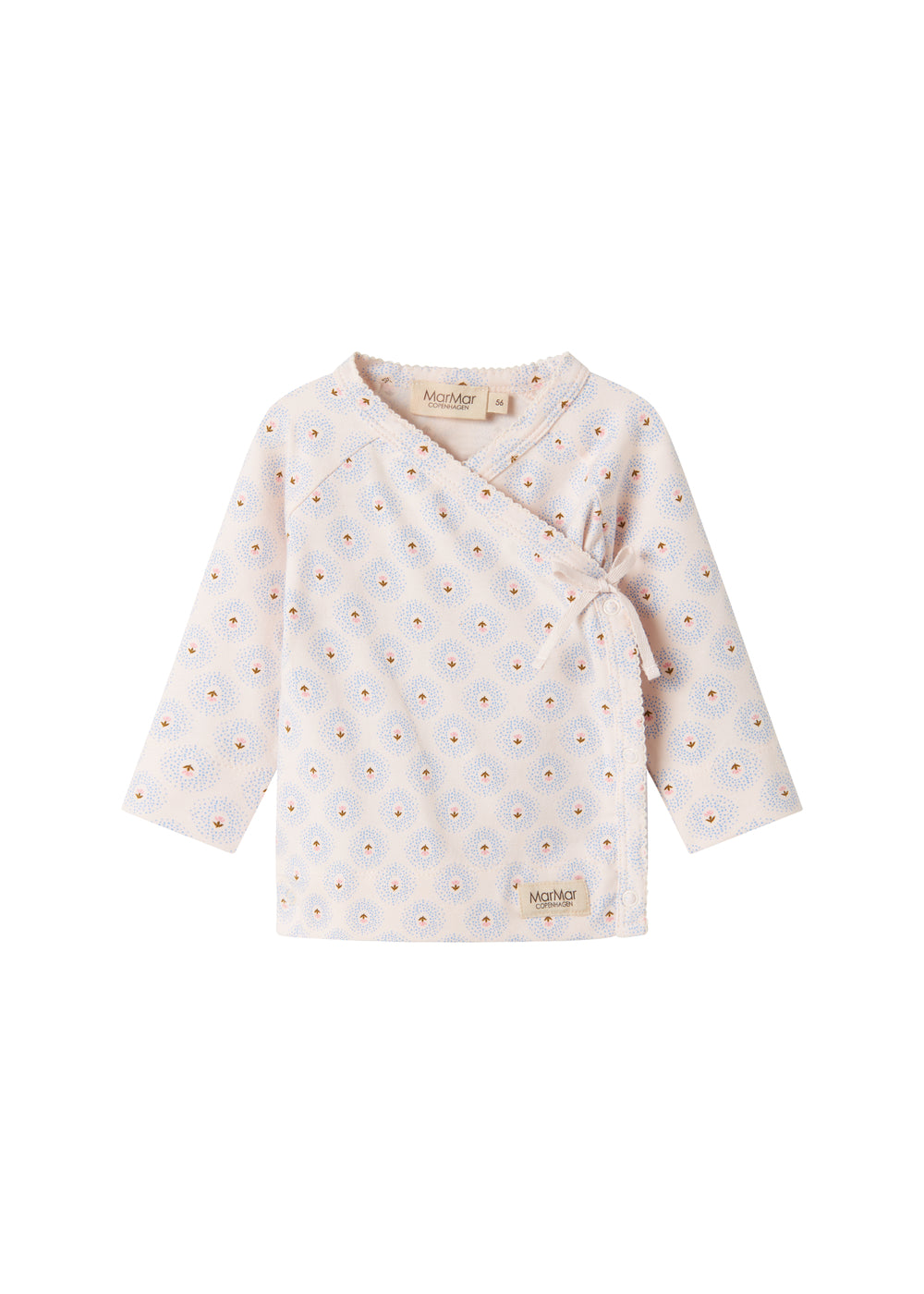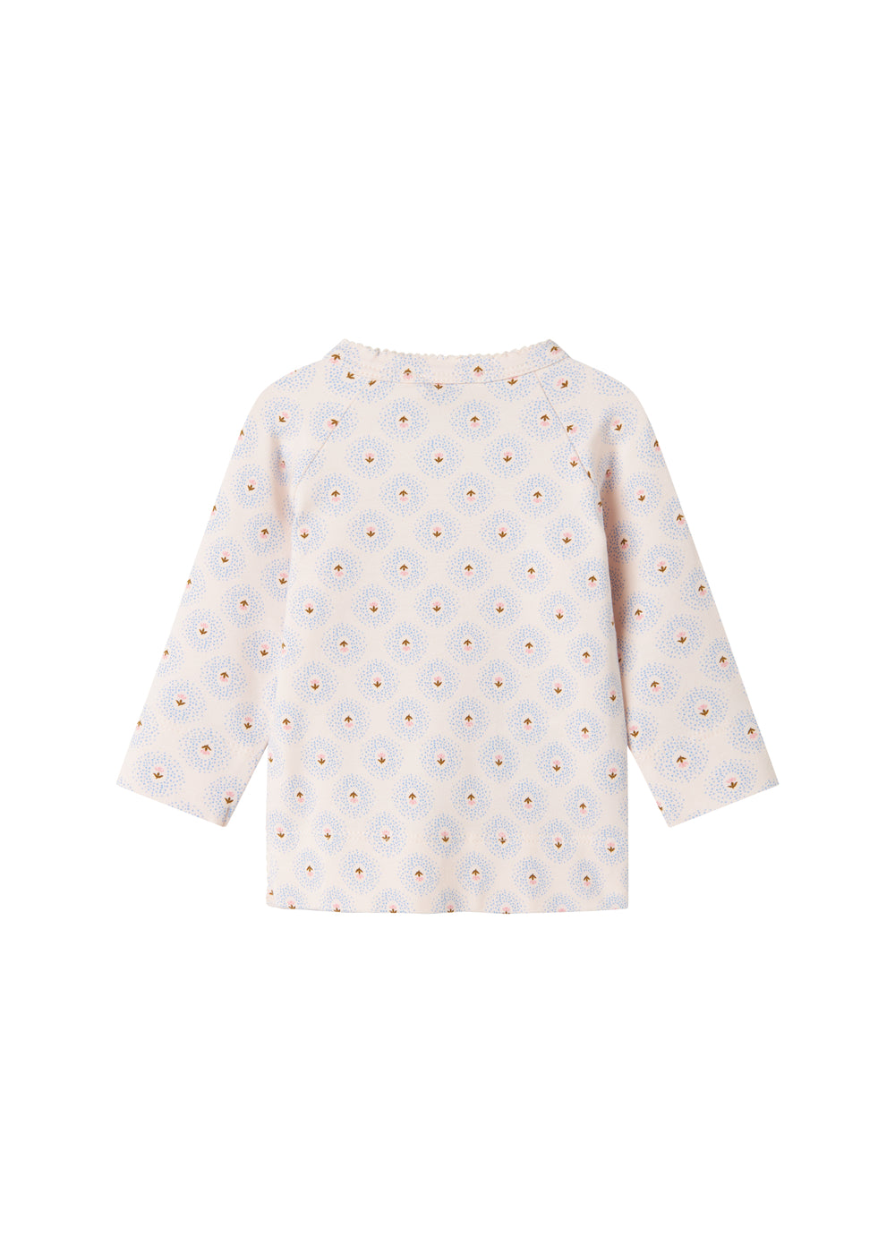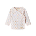 Long-sleeved blouse for newborns with a wrap-around closure. The blouse closes with snaps and ties and has a nice print and is both soft, stretchy and comfortable to wear.