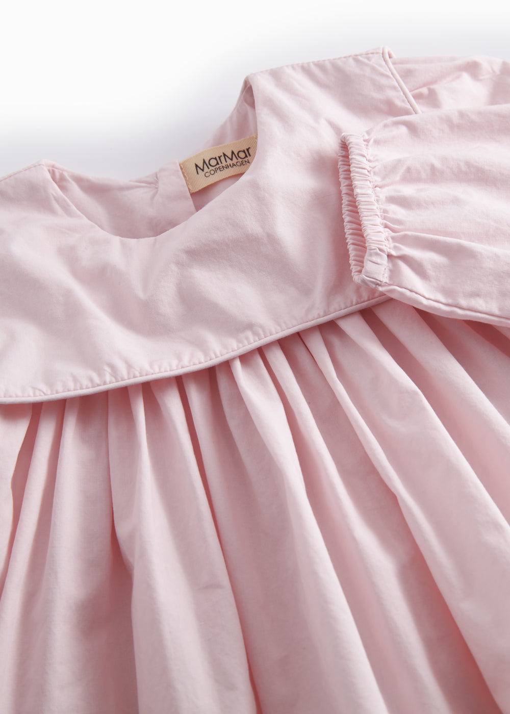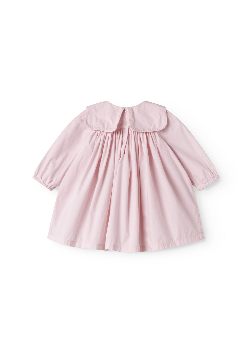 Long-sleeved baby dress with a loose fit and a nice large decorative collar. The dress has two pockets in the front and a button closure at the back. The length of the dress goes above the knee. The dress is made of a light and crispy cotton quality, which makes it comfortable to wear.