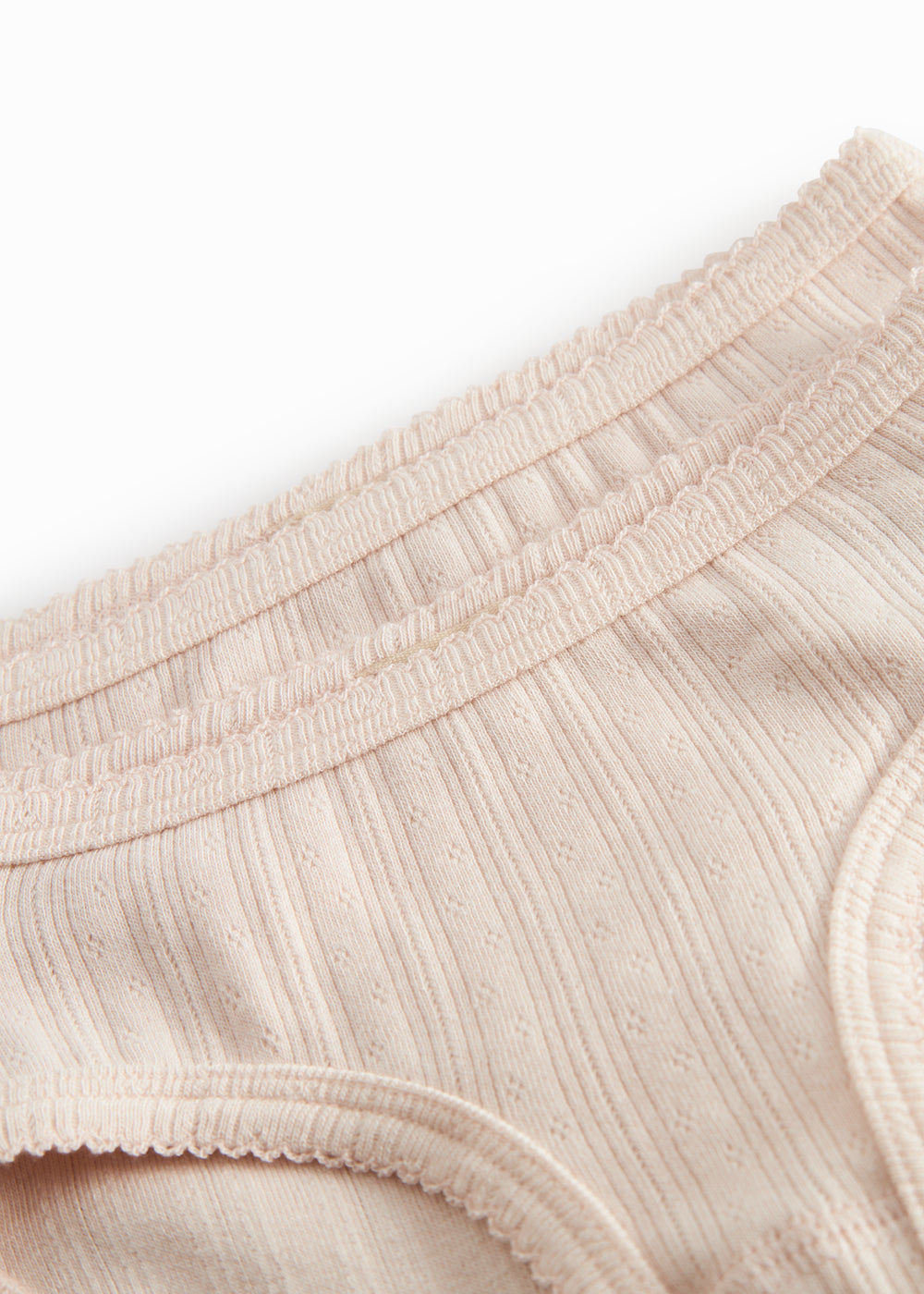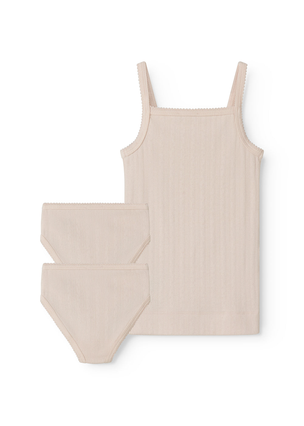 Children's undershirt with pointelle details and thin straps, with 2 pairs of underpants. The set is soft, stretchy and comfortable to wear.