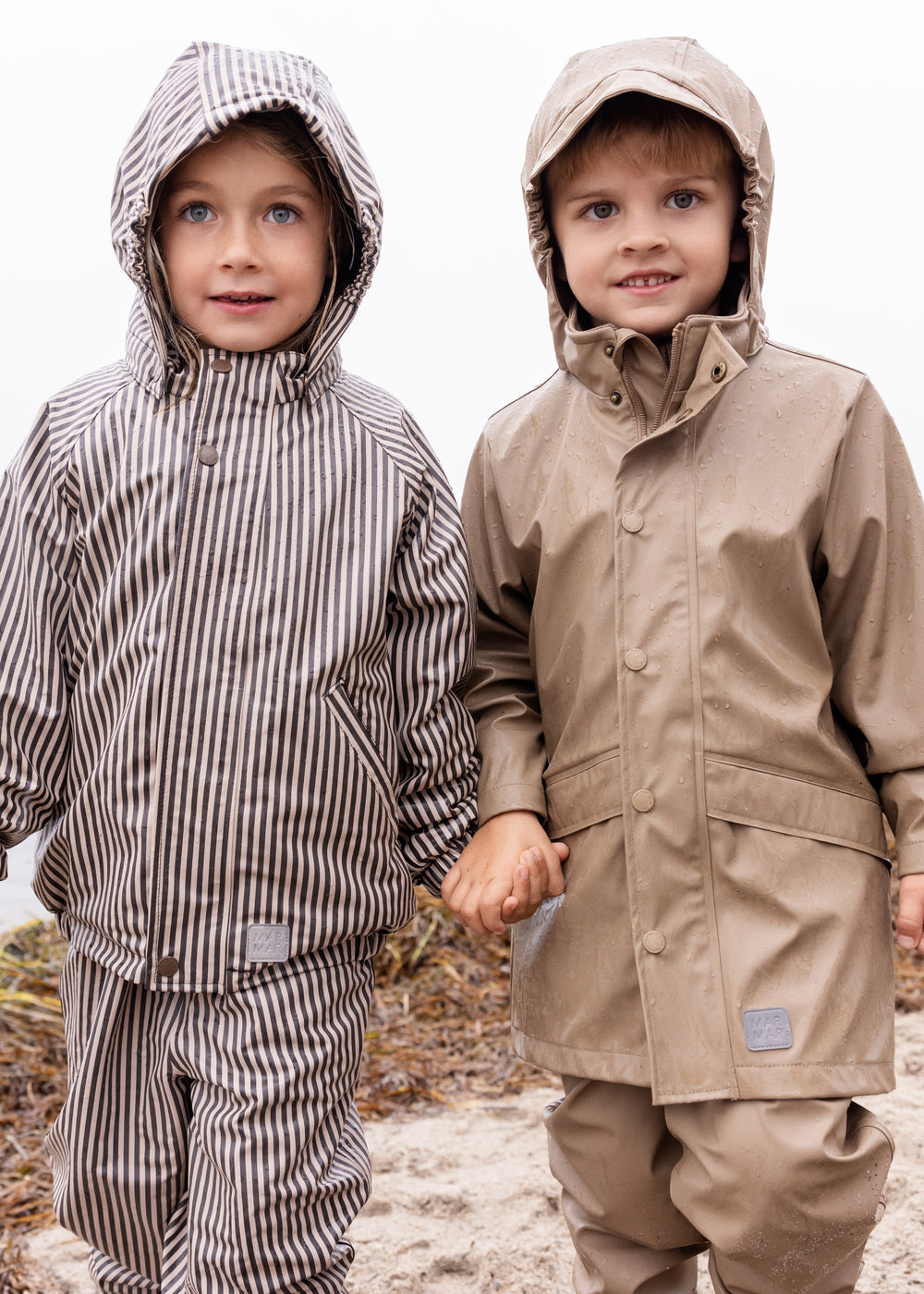 To børn iført regntøj på stranden, det ene barn i beige regnjakke og bukser
