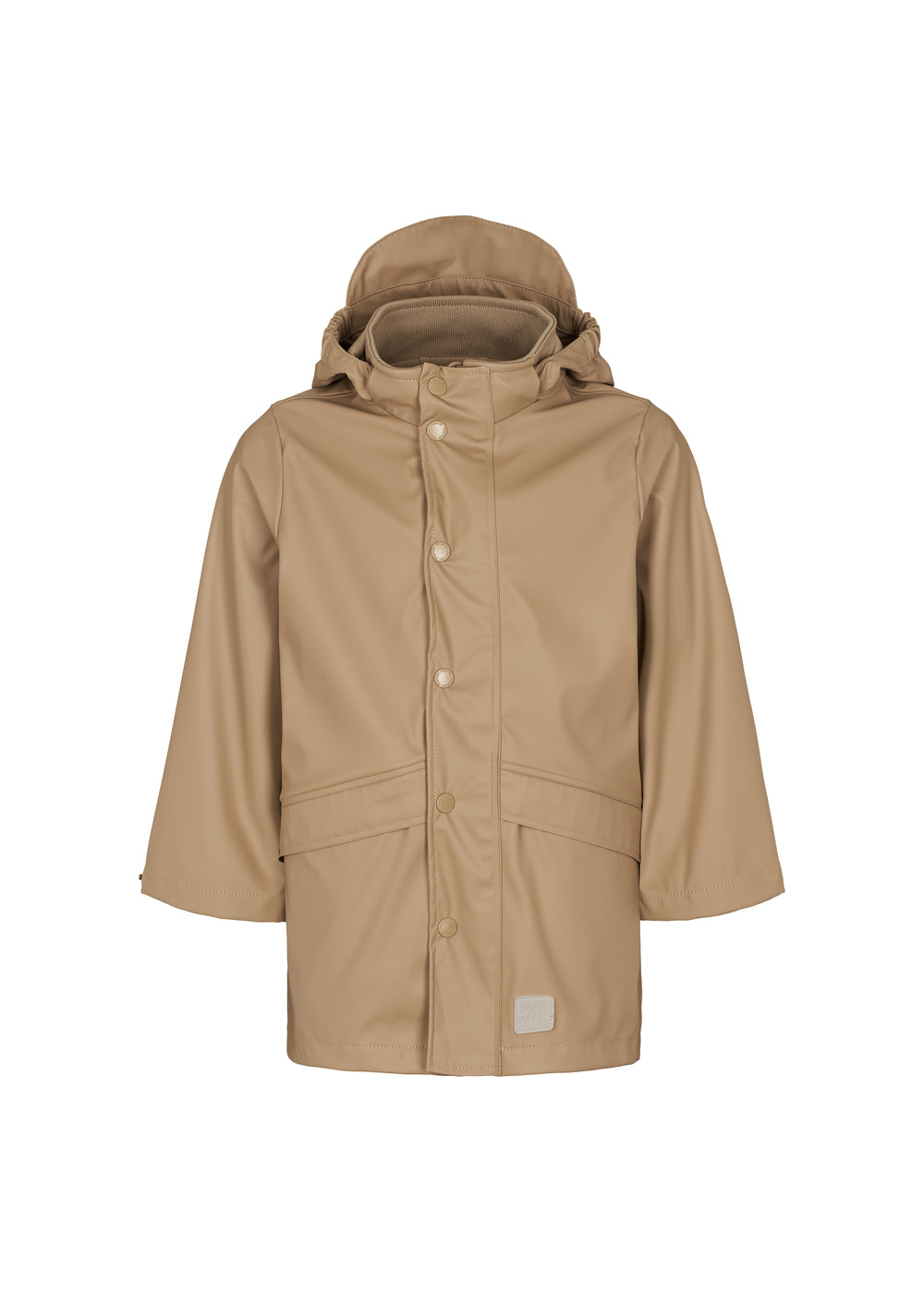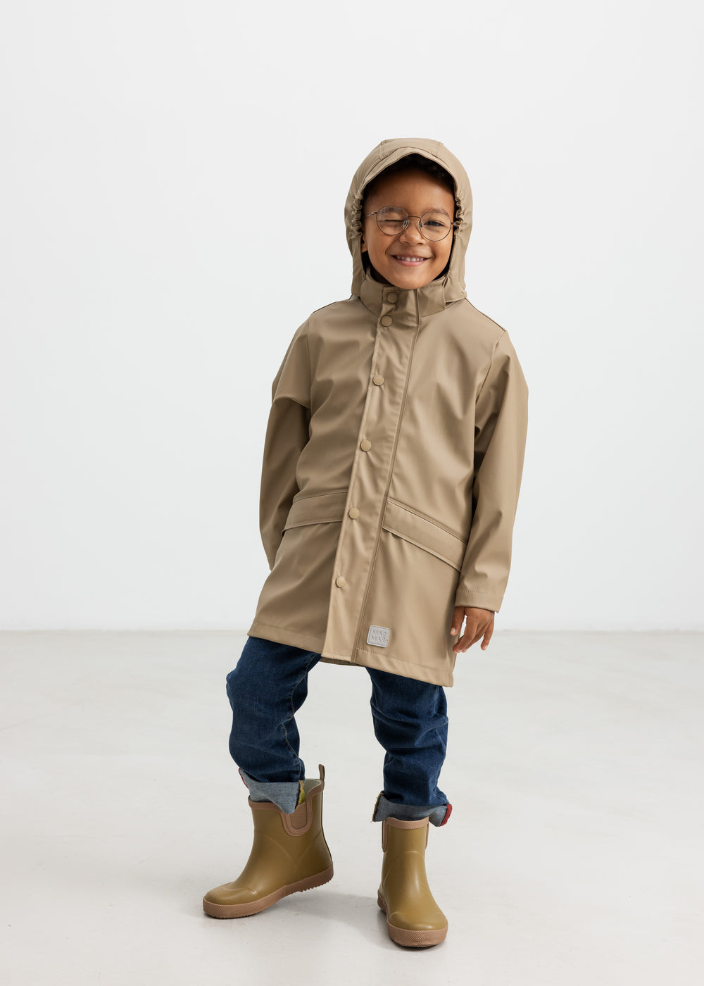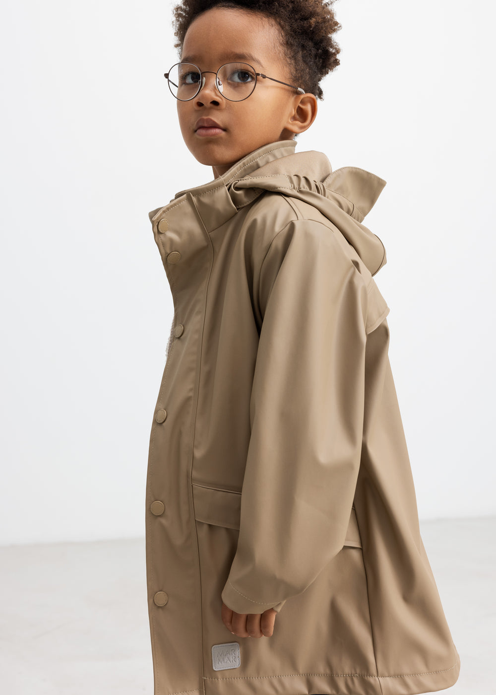 beige regnjakke til børn med knaplukning og aftagelig hætte