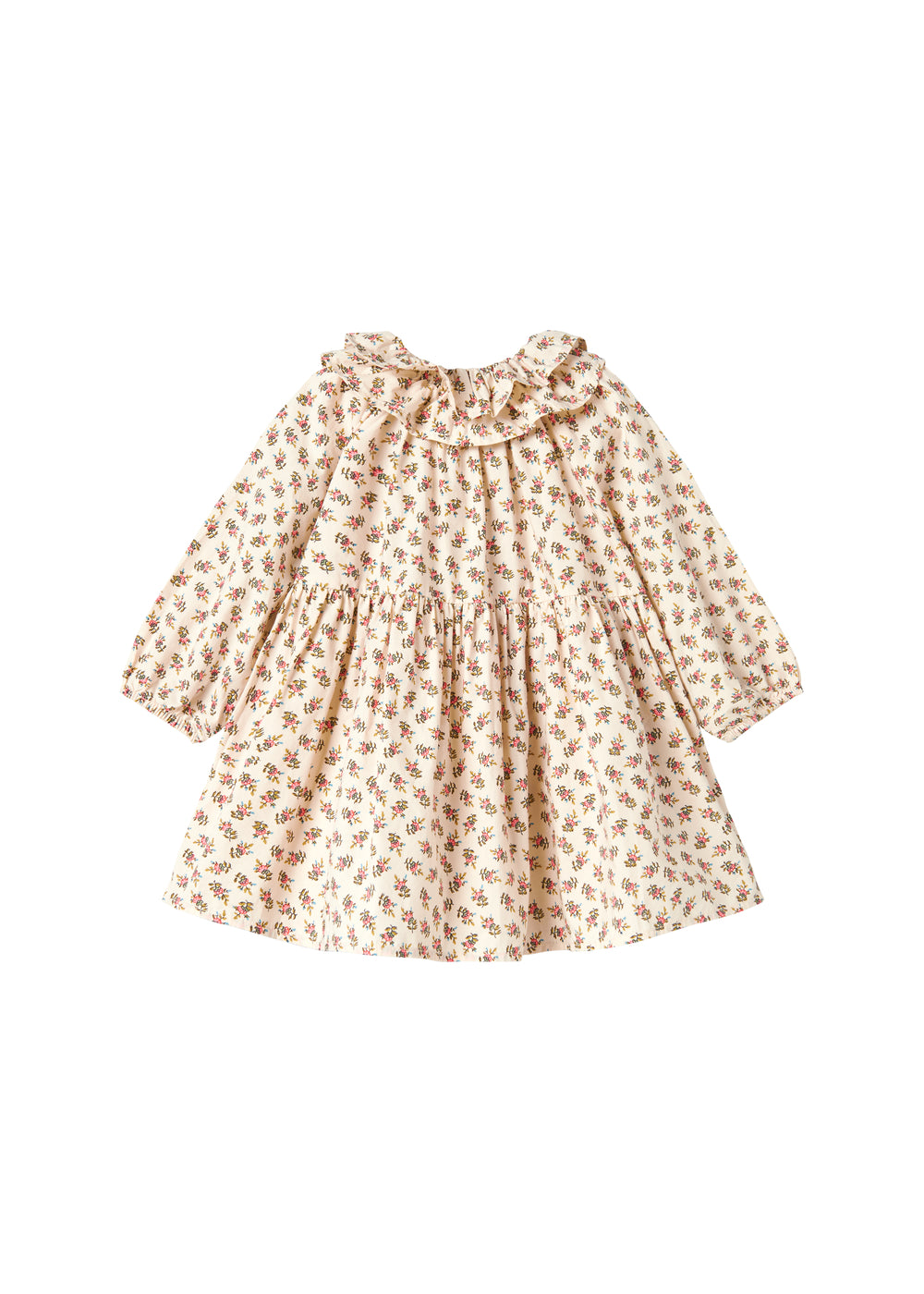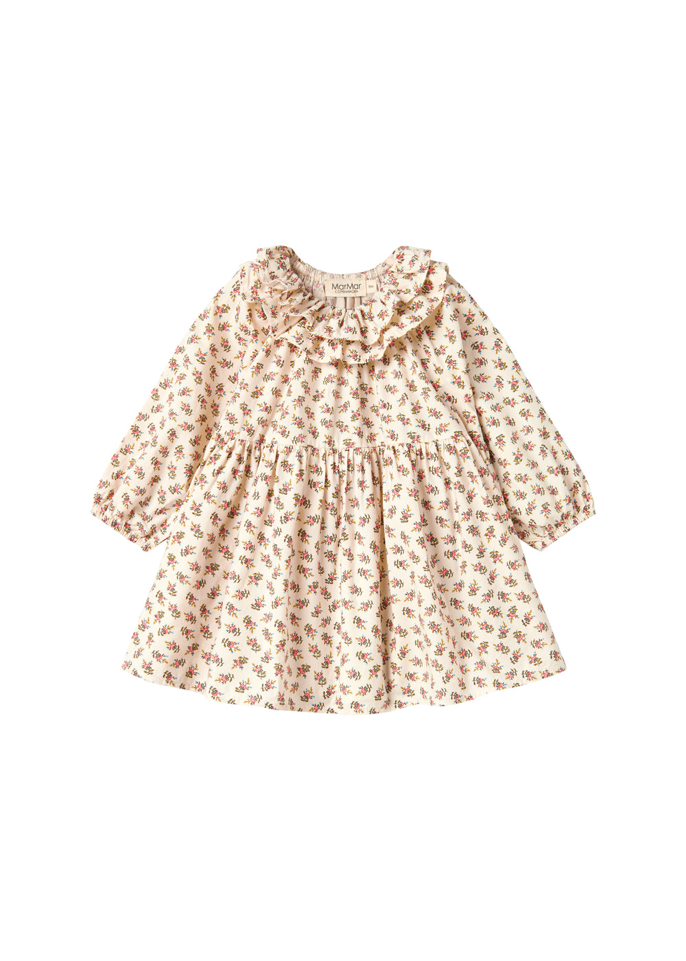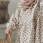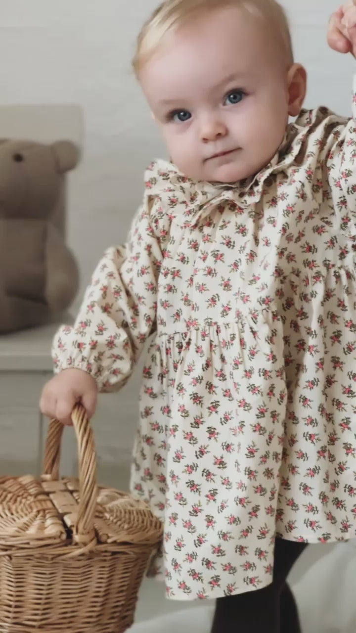 Long-sleeved and loose-fitting dress for the little ones with a delicate hand-drawn floral print and ruffle details. The dress has elastic edges at the neck and sleeves for a comfortable fit. The length of the dress goes above the knees and is both comfortable, light and airy to wear.