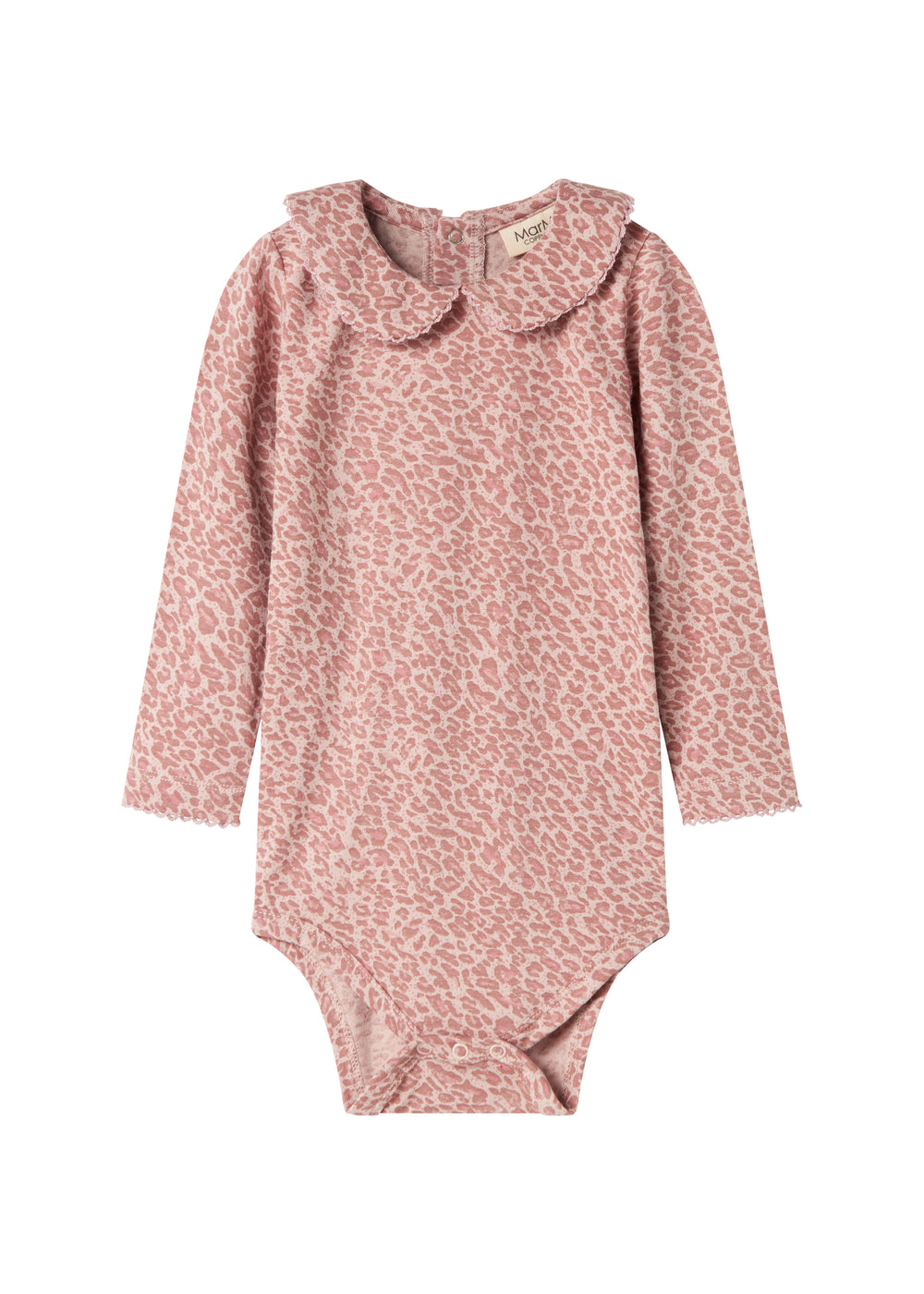 Long-sleeved leopard bodystocking with a small collar and picot edges. The bodystocking is closed with snaps at the back and between the legs for easy diaper changes.