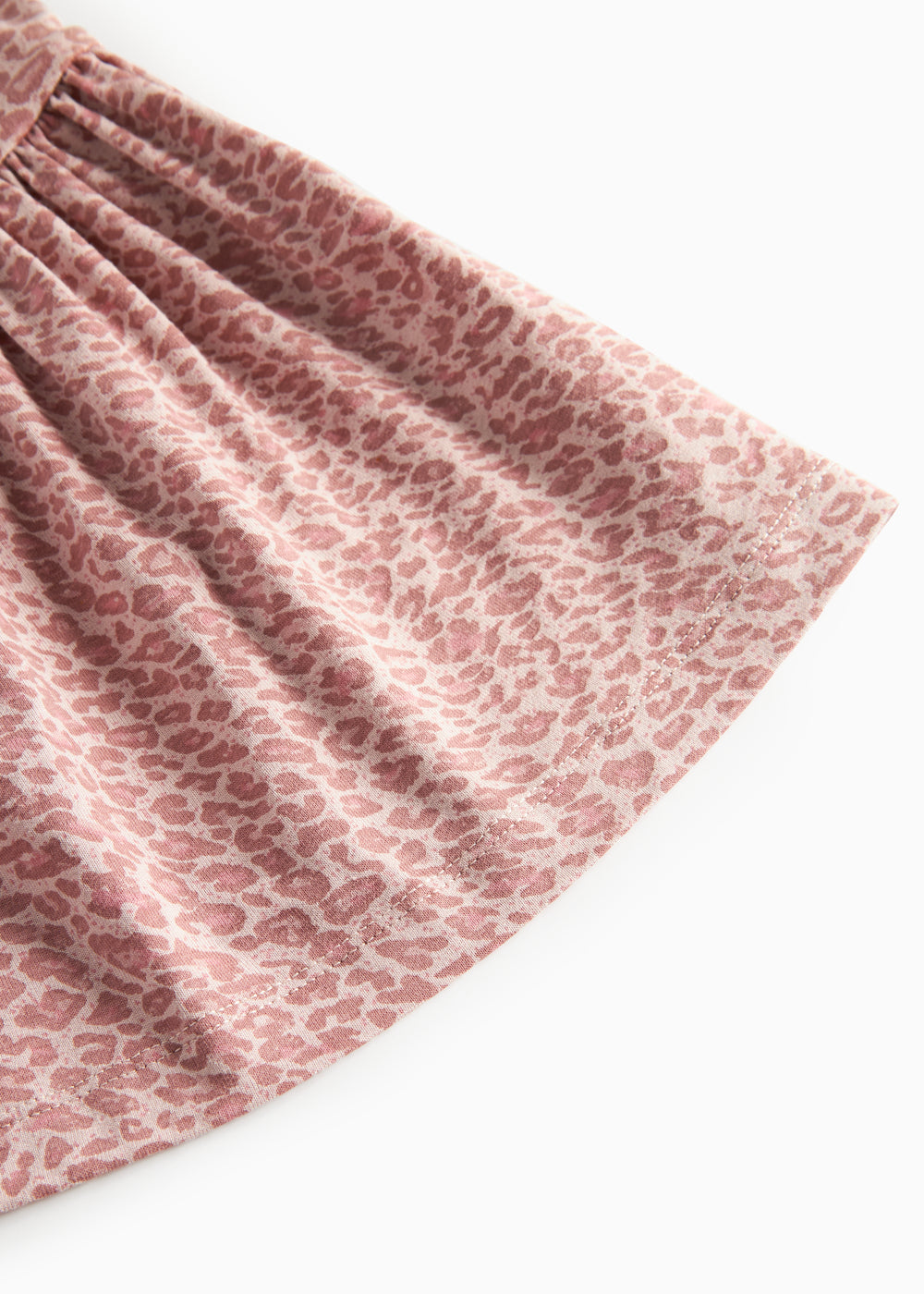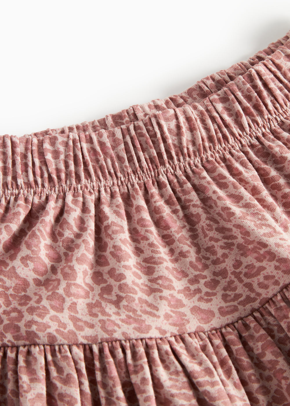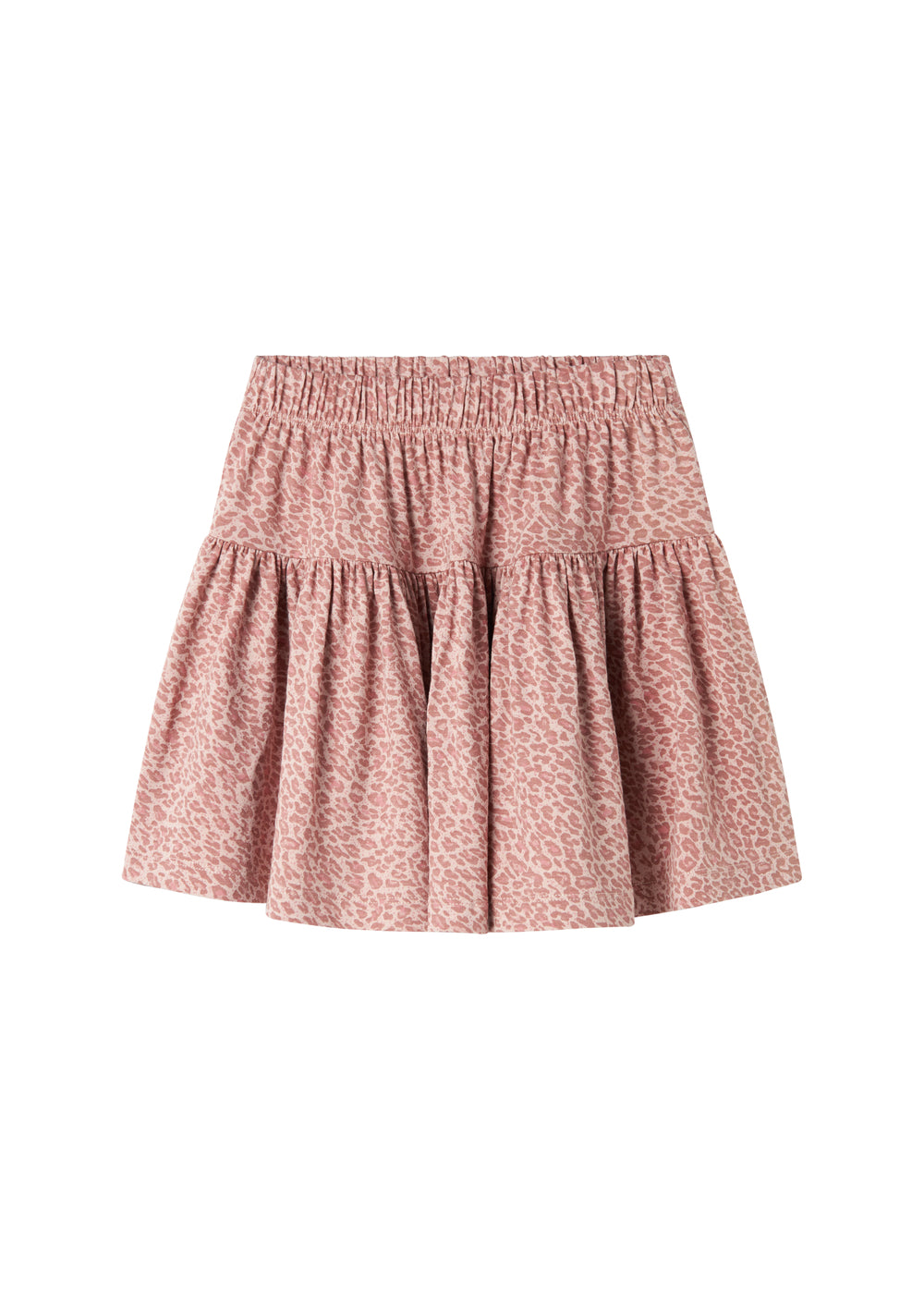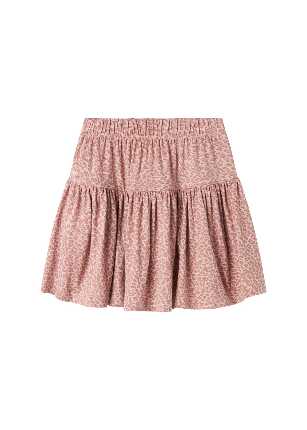 Leopard skirt with a wide, elastic waist and a yoke that creates a nice shape. The length of the skirt goes above the knee. The skirt is very soft, stretchy and comfortable to wear.
