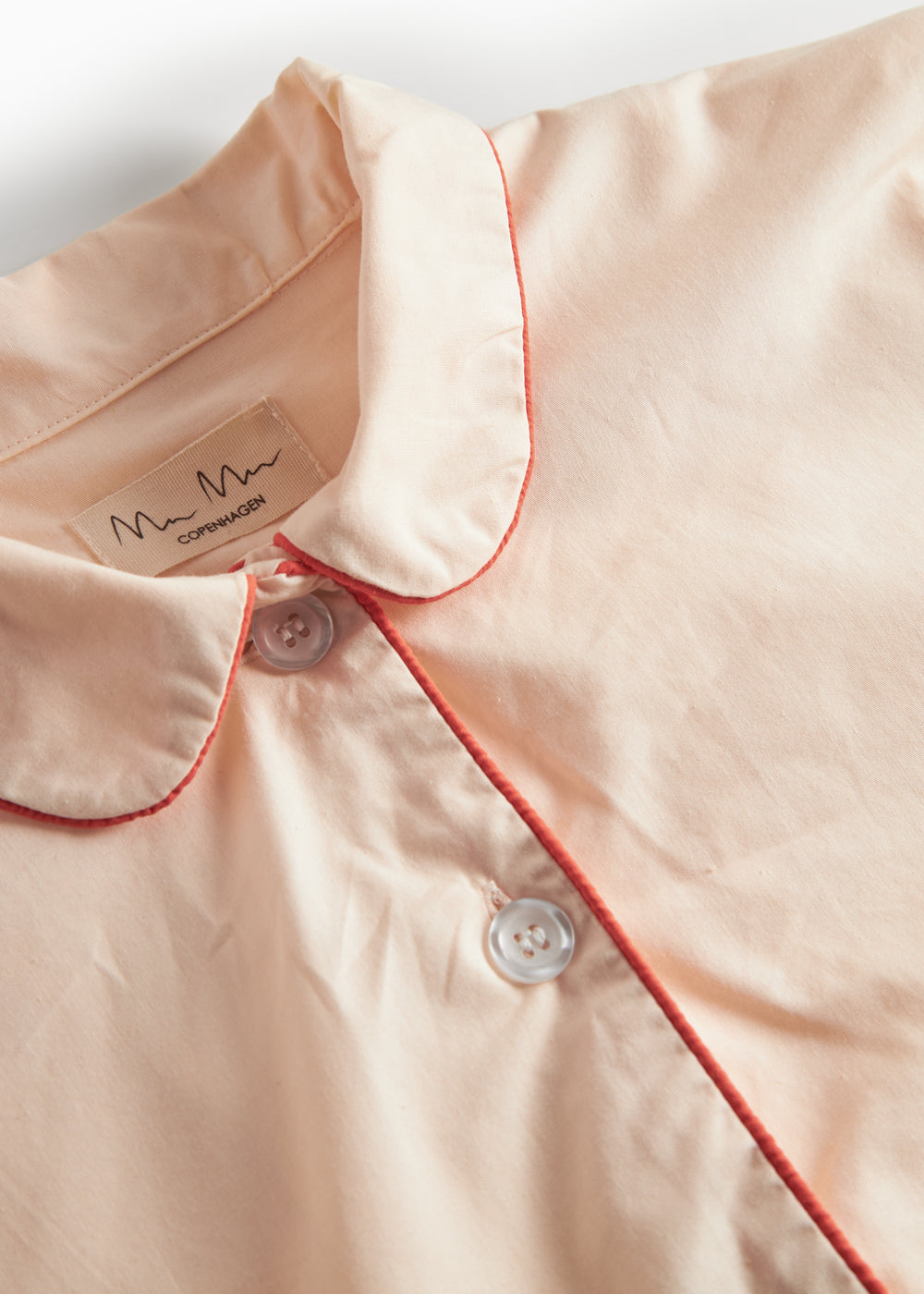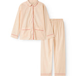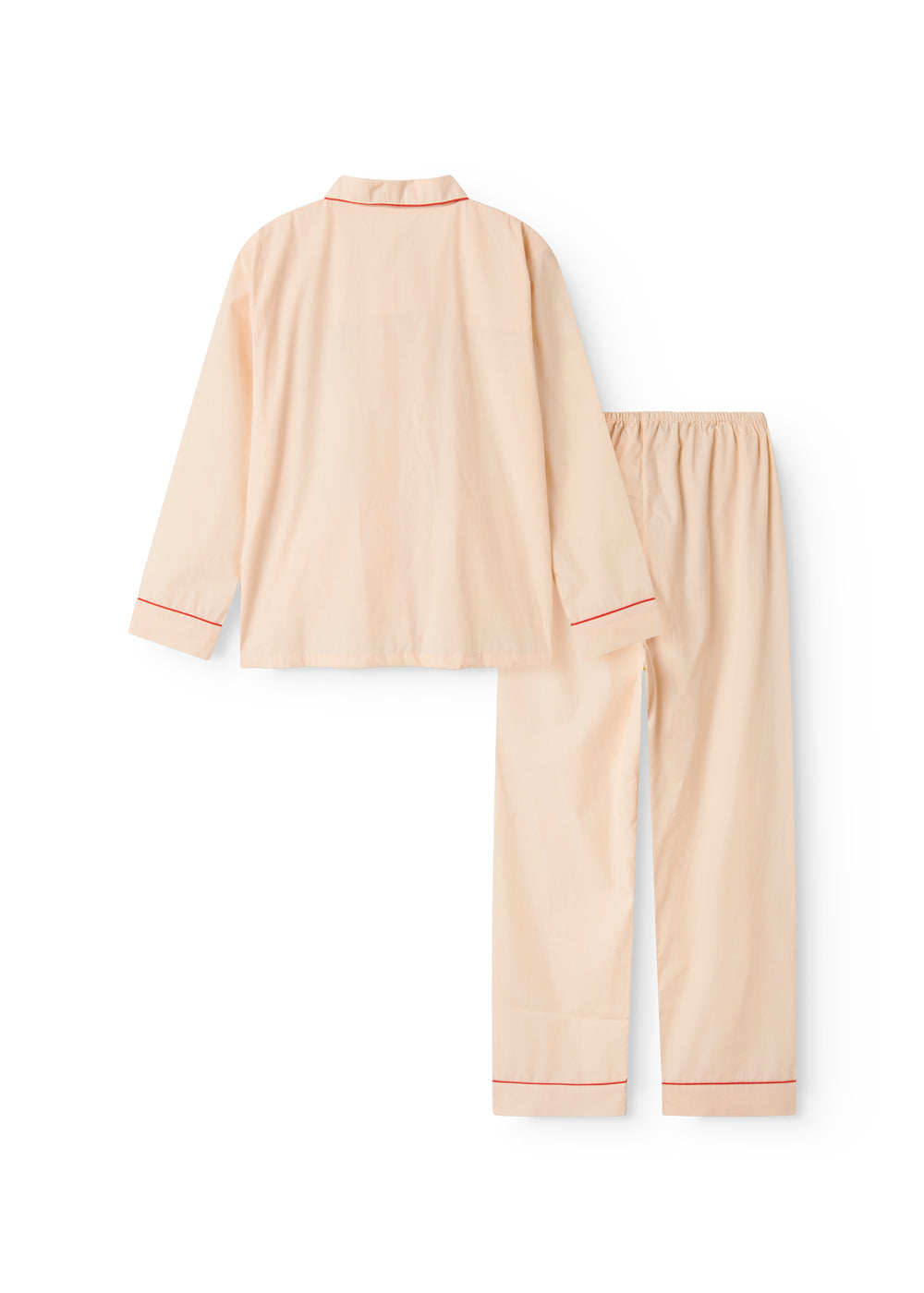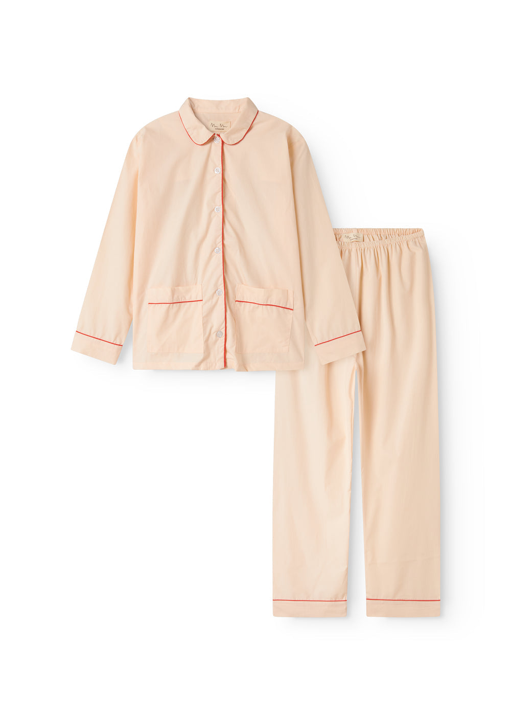 Pajama set for women with a shirt and pants in a loose fit. The shirt has a button closure and two pockets in the front and the pants have an elastic waist. The pajama set has nice contrast piping details.