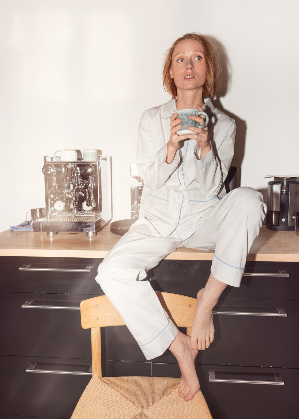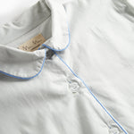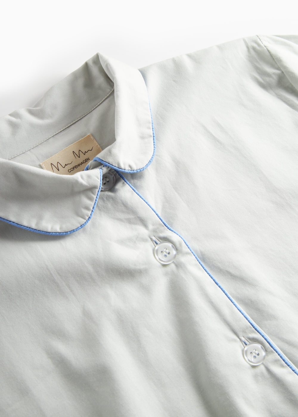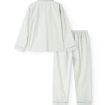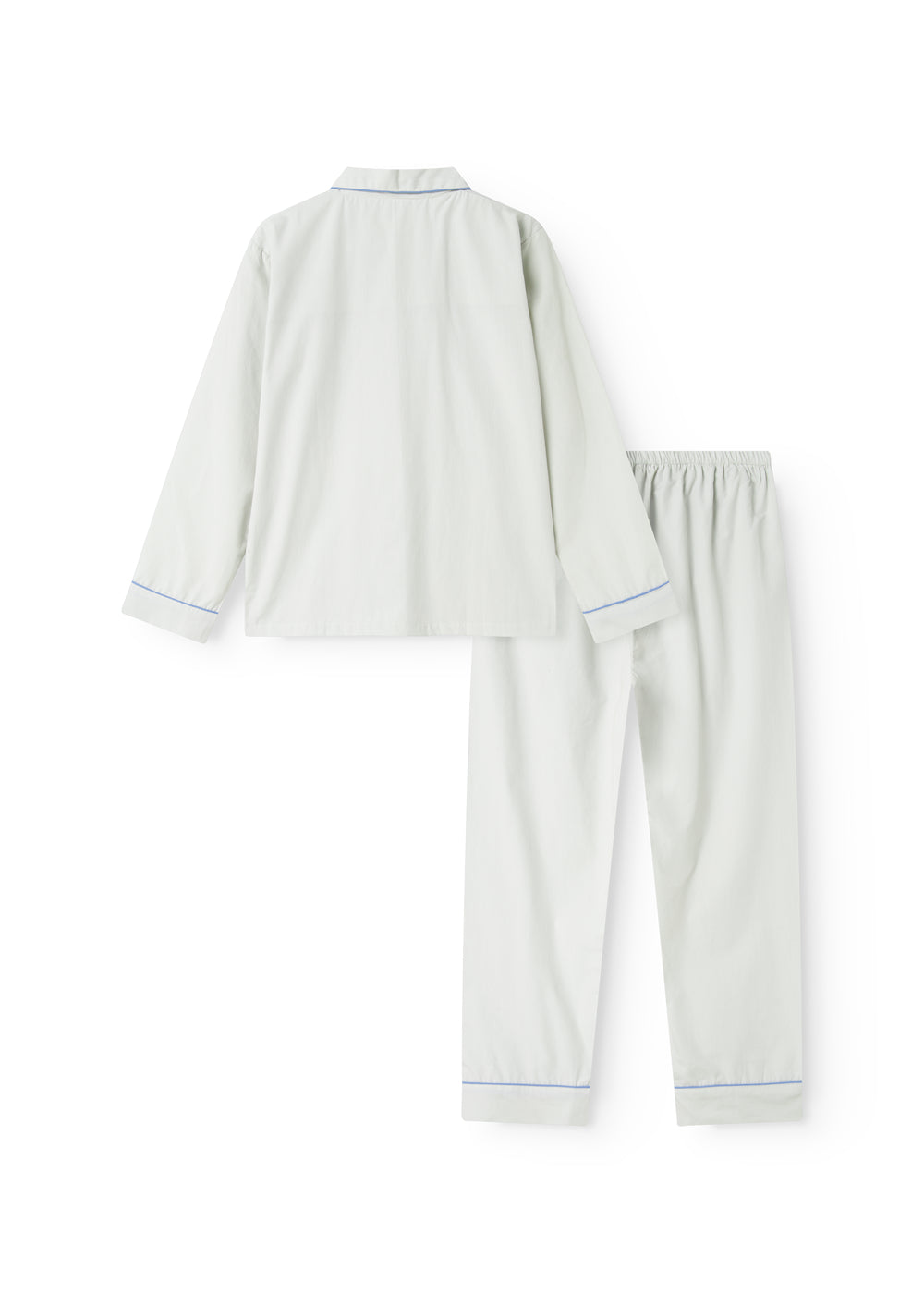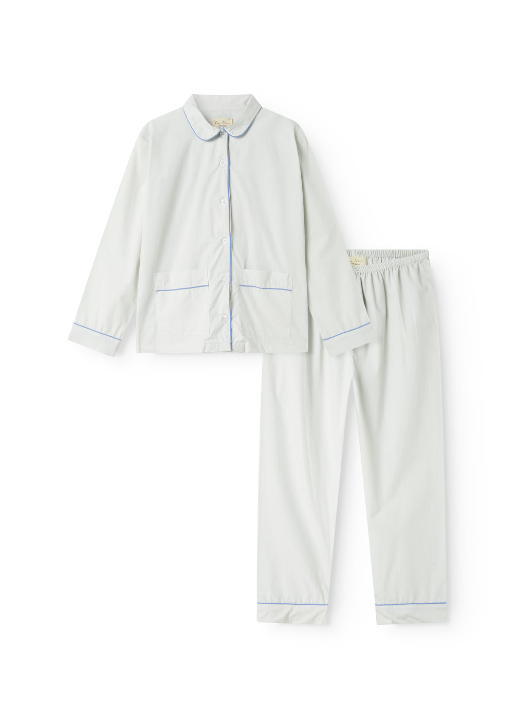 Pajama set for women with a shirt and pants in a loose fit. The shirt has a button closure and two pockets in the front and the pants have an elastic waist. The pajama set has nice contrast piping details.