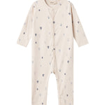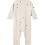 Spacious baby jumpsuit with snap closure all the way from neckline to trouser leg. The jumpsuit can be unbuttoned all the way up one leg for easy diaper changes. The jumpsuit has a nice print and is both soft, stretchy and comfortable to wear.