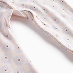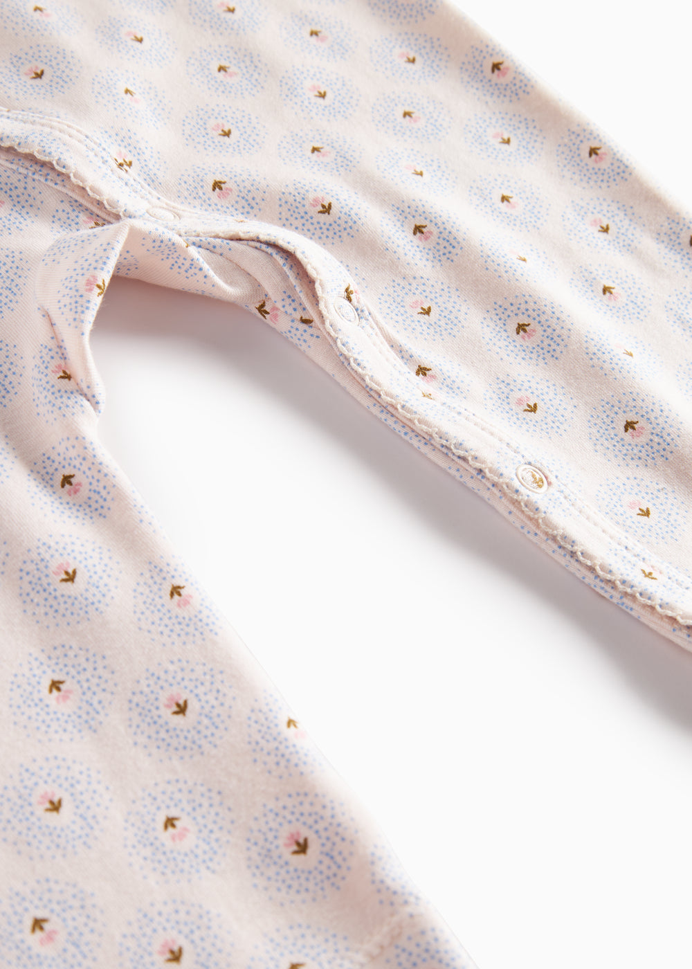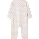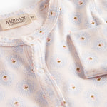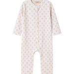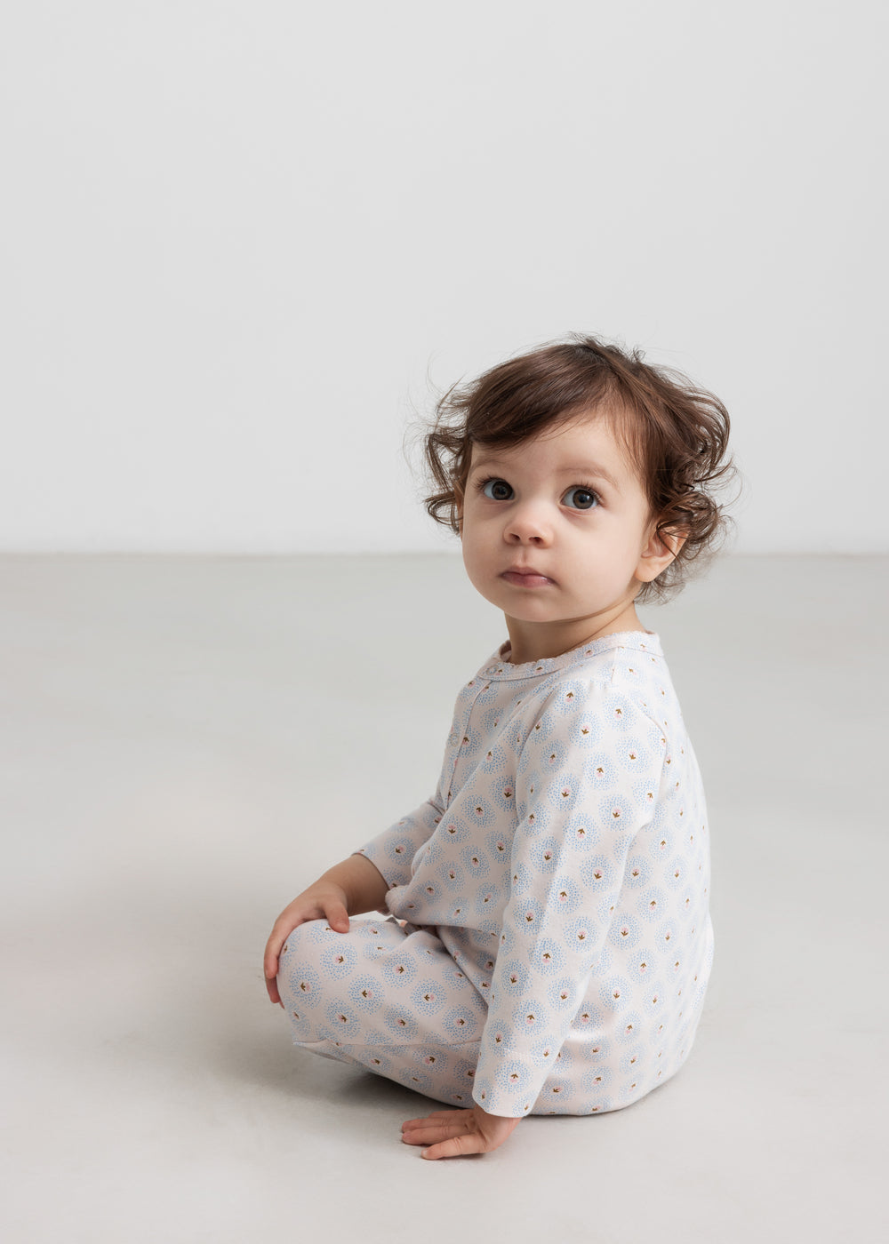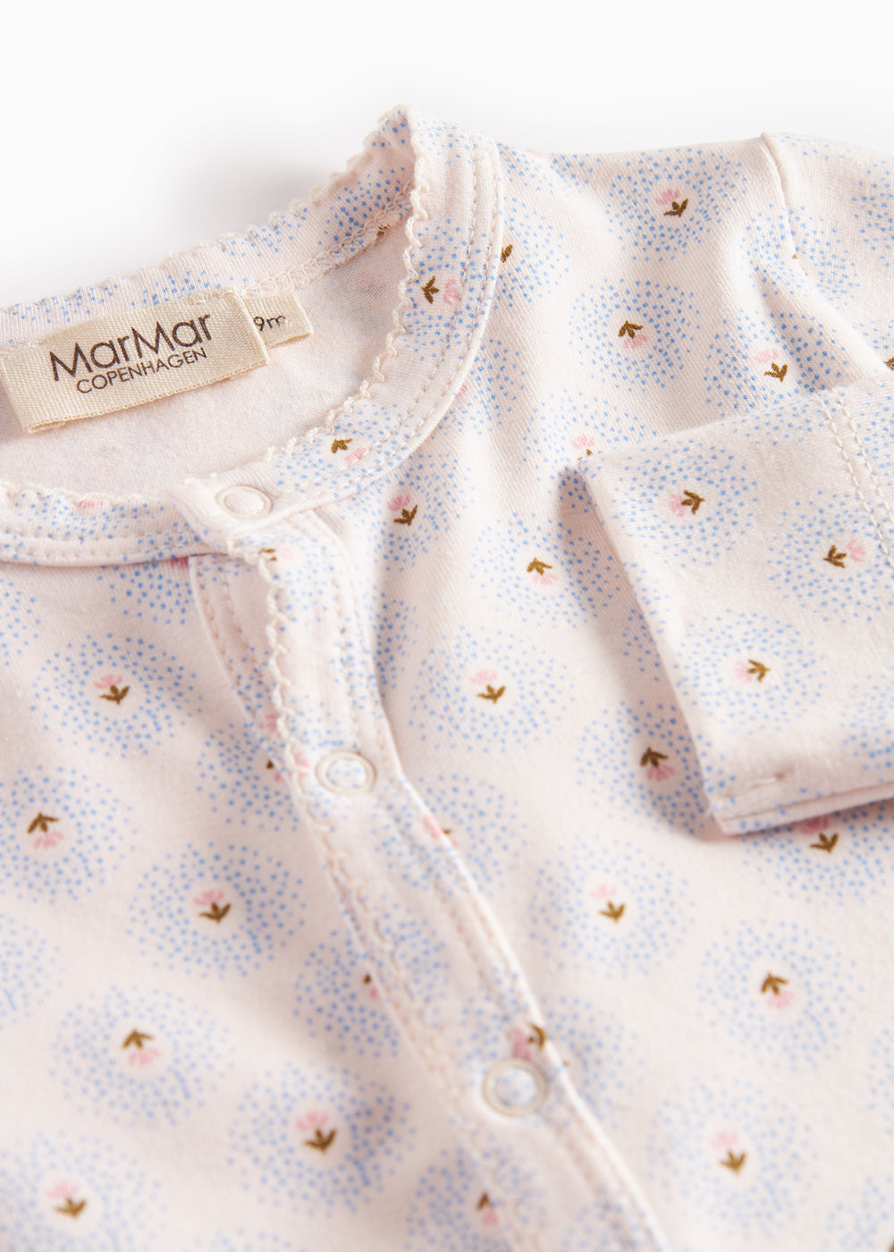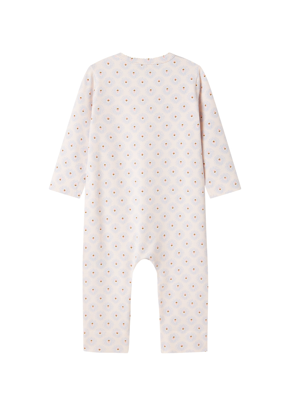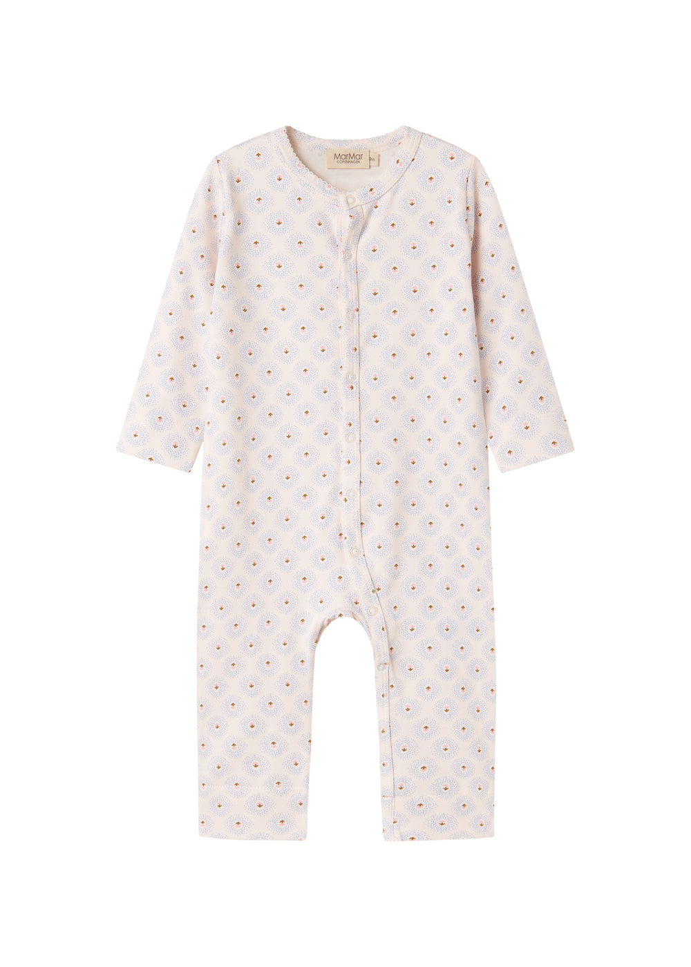 Spacious baby jumpsuit with snap closure all the way from neckline to trouser leg. The jumpsuit can be unbuttoned all the way up one leg for easy diaper changes. The jumpsuit has a nice print and is both soft, stretchy and comfortable to wear.