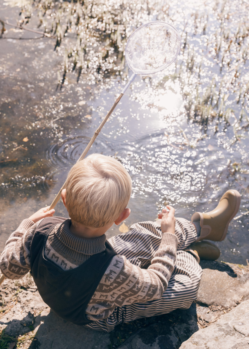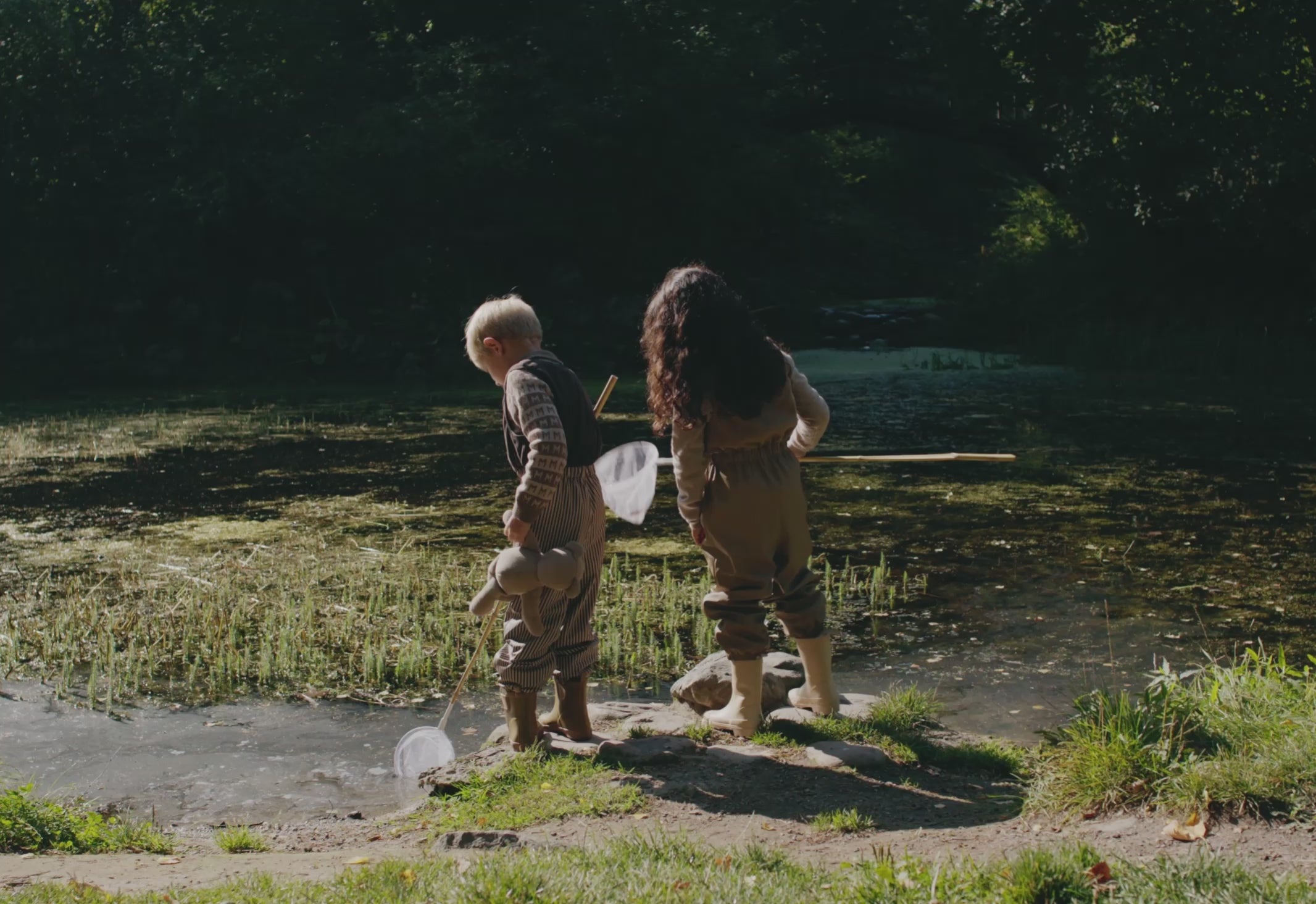 To børn leger ved vand i naturen iført regntøj, et med striber