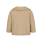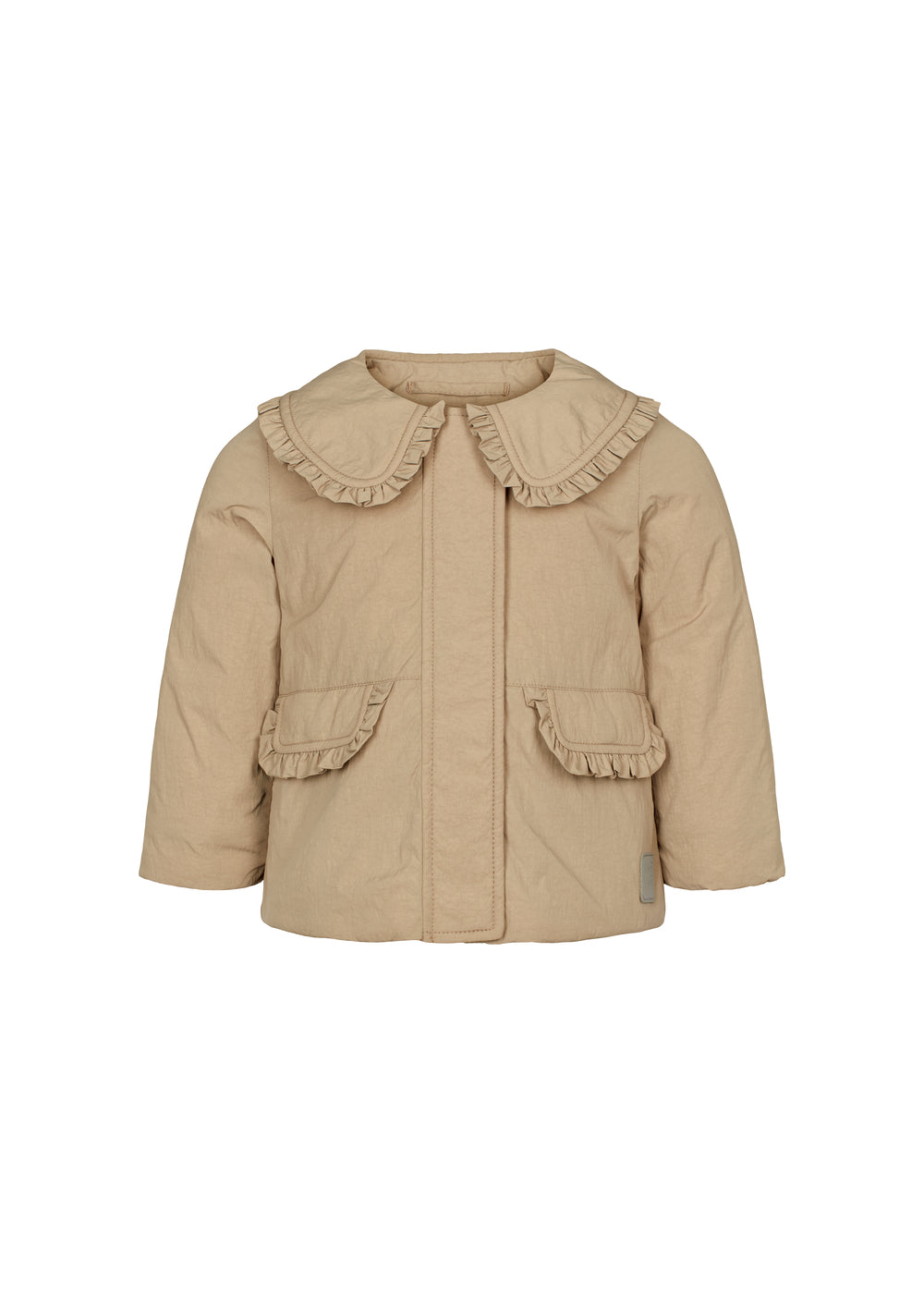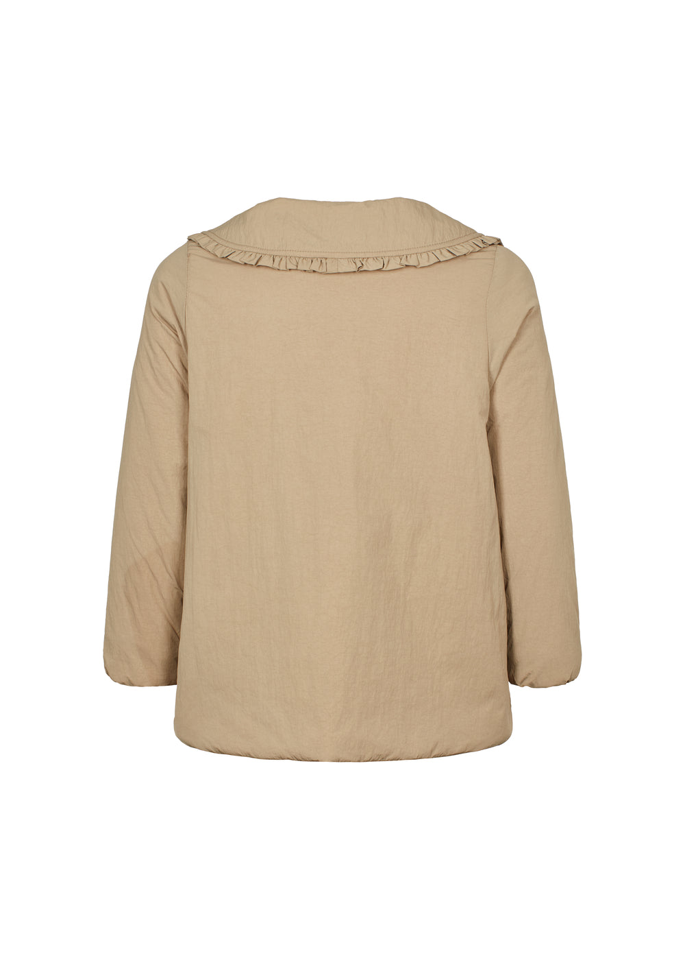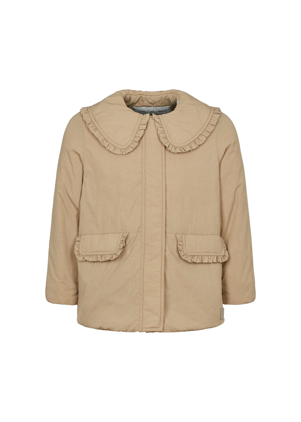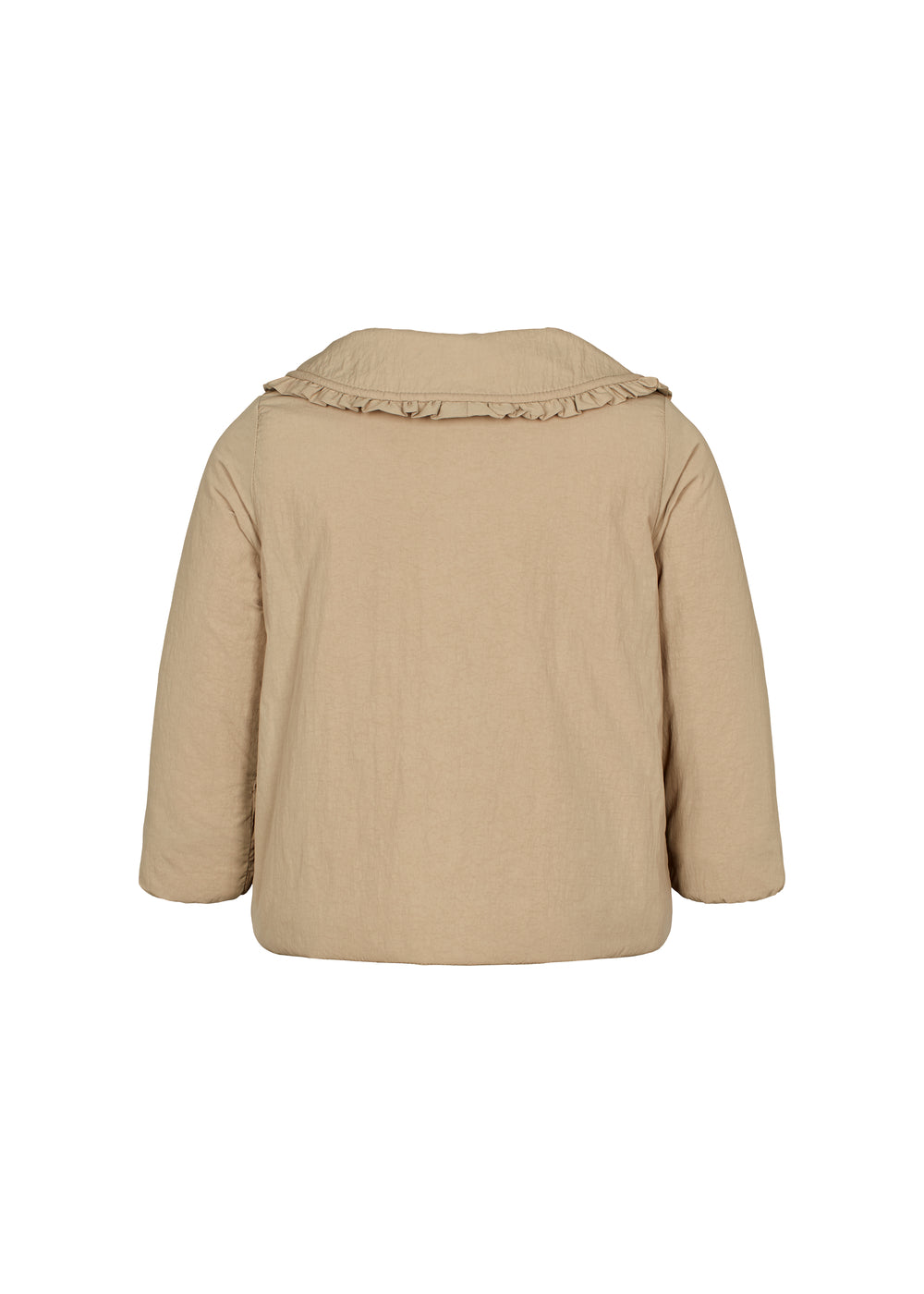 Jacket in thermal fleece with a collar and ruffles for a more feminine look. The jacket has two pockets and the jacket closes with a zipper and buttons at the front.