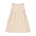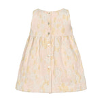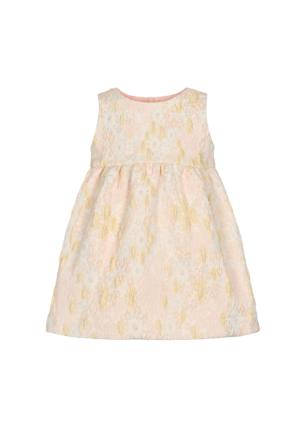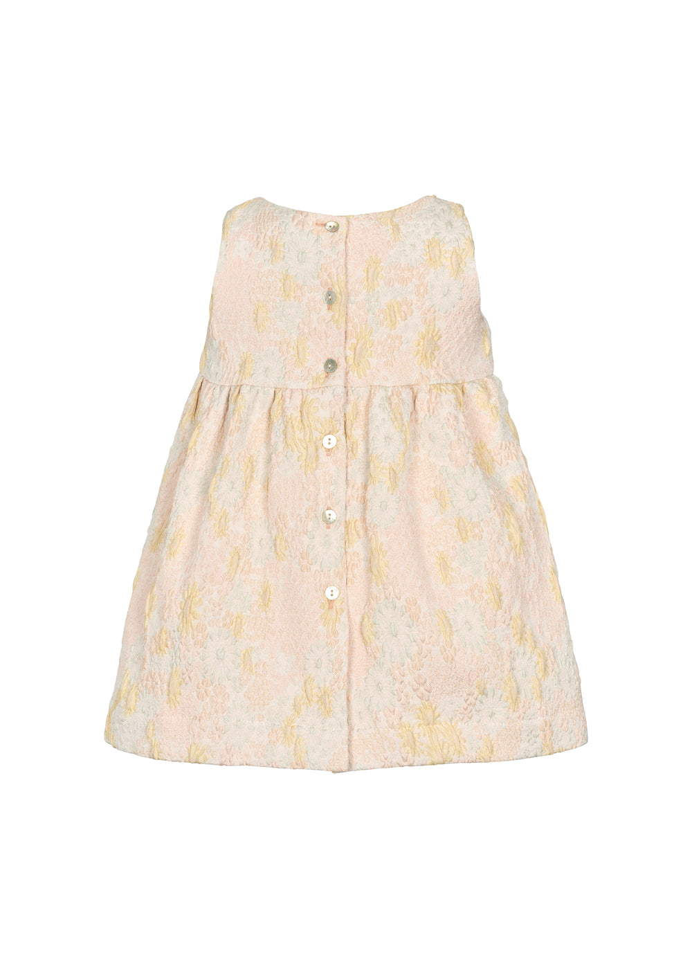 Short-sleeved dress with lots of volume. The dress closes with buttons at the back. The length of the dress goes above the knee.