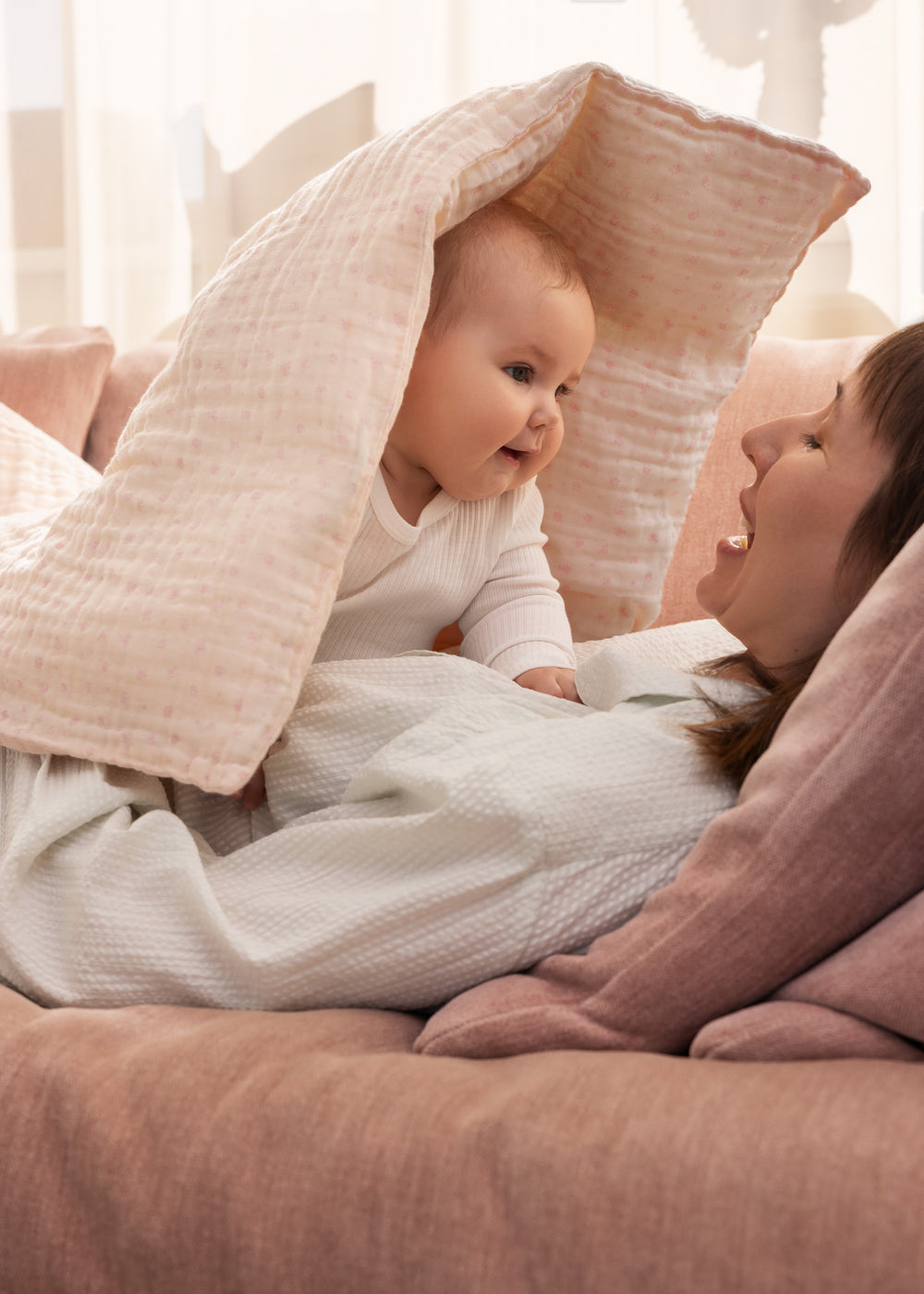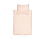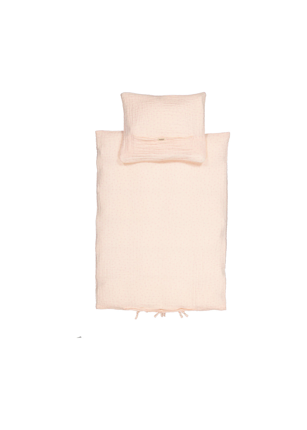 Baby bedding in muslin with duvet and pillowcase. The duvet cover closes with a tie at the foot end.