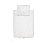 Baby bedding in muslin with duvet and pillowcase. The duvet cover closes with a tie at the foot end.