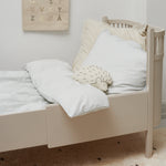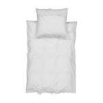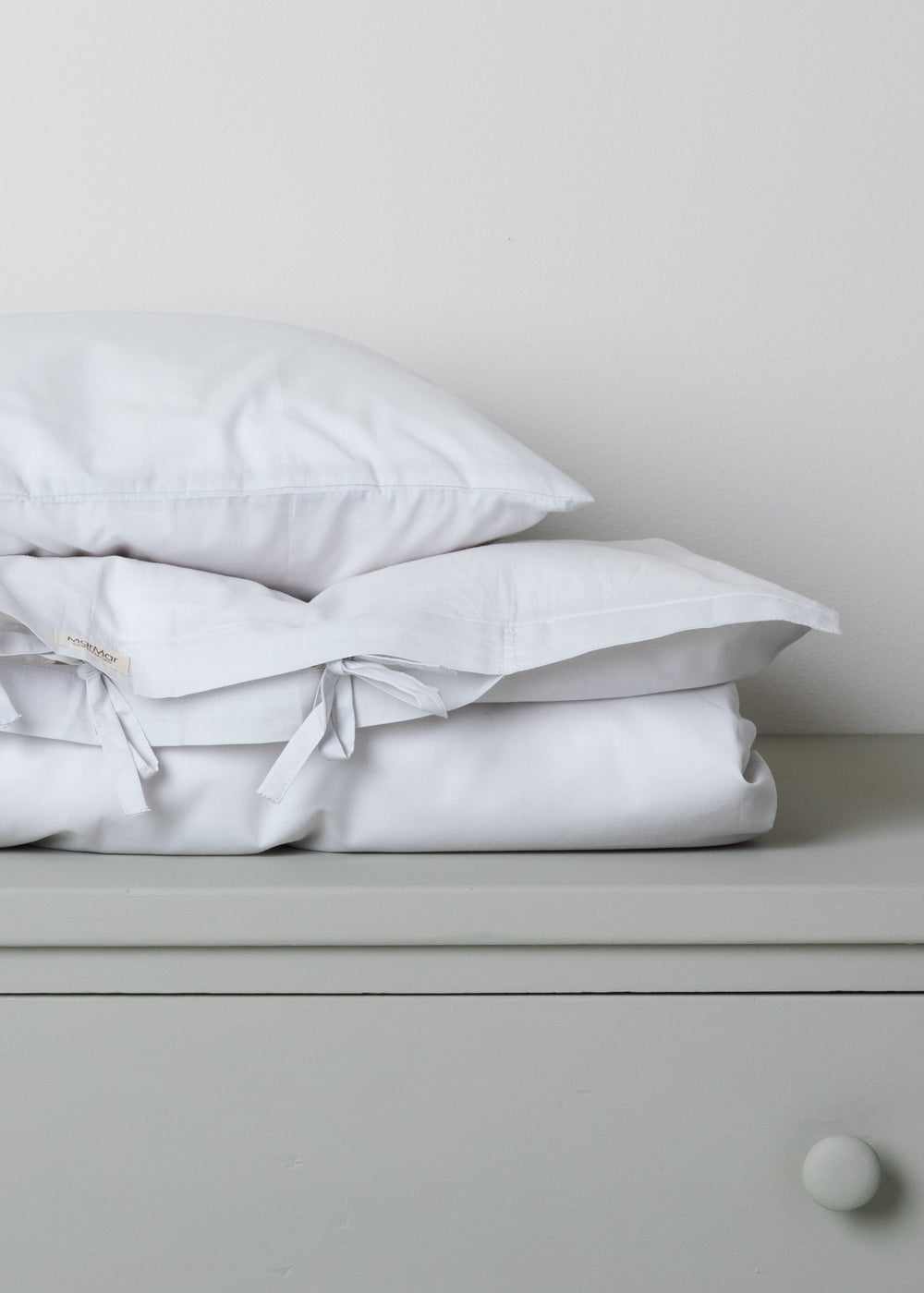 Bedding with duvet and pillowcase. The duvet cover closes with a tie at the foot.