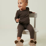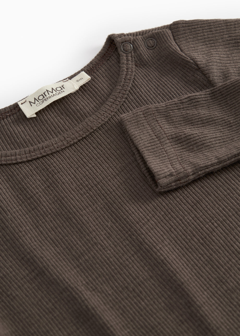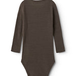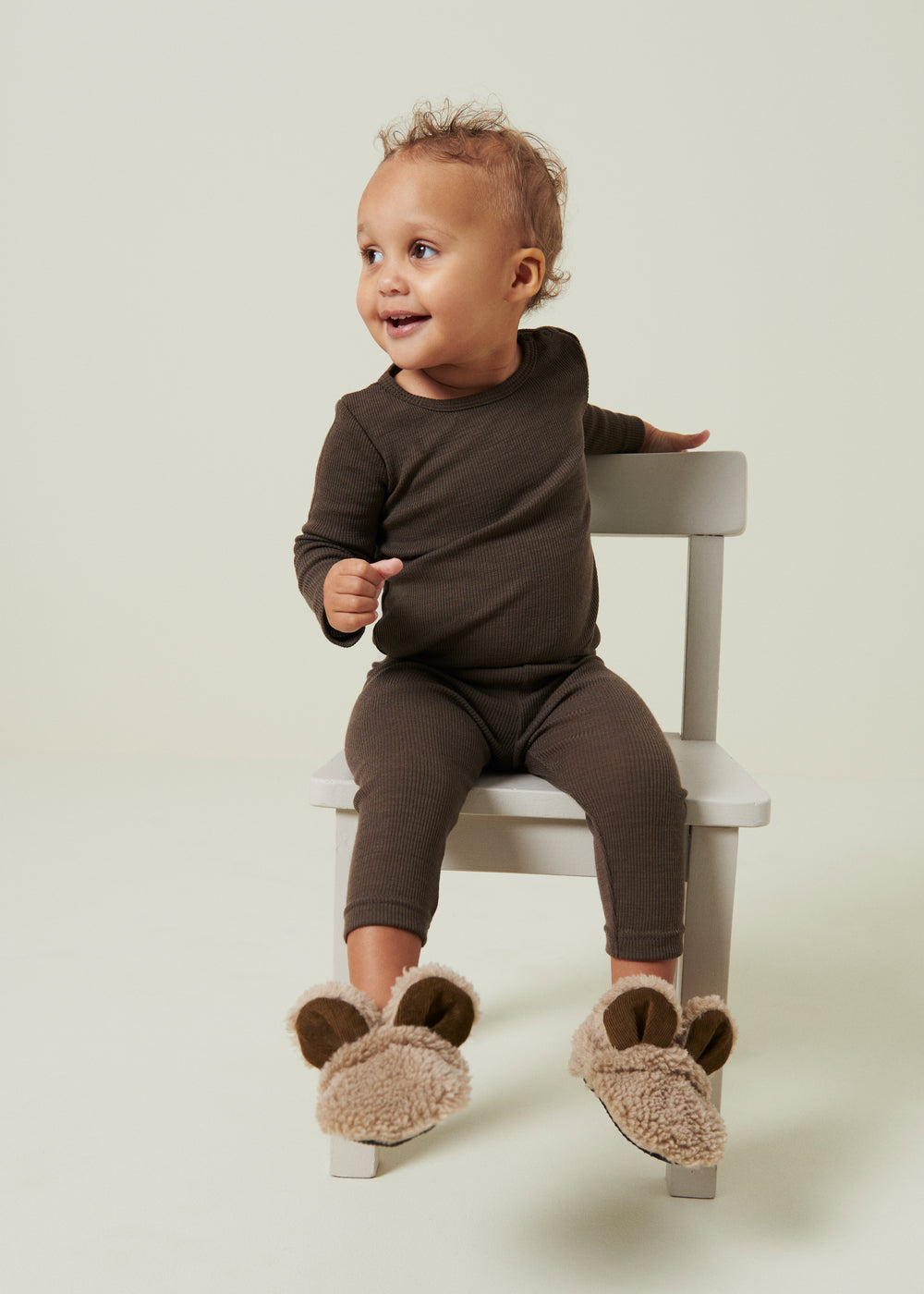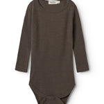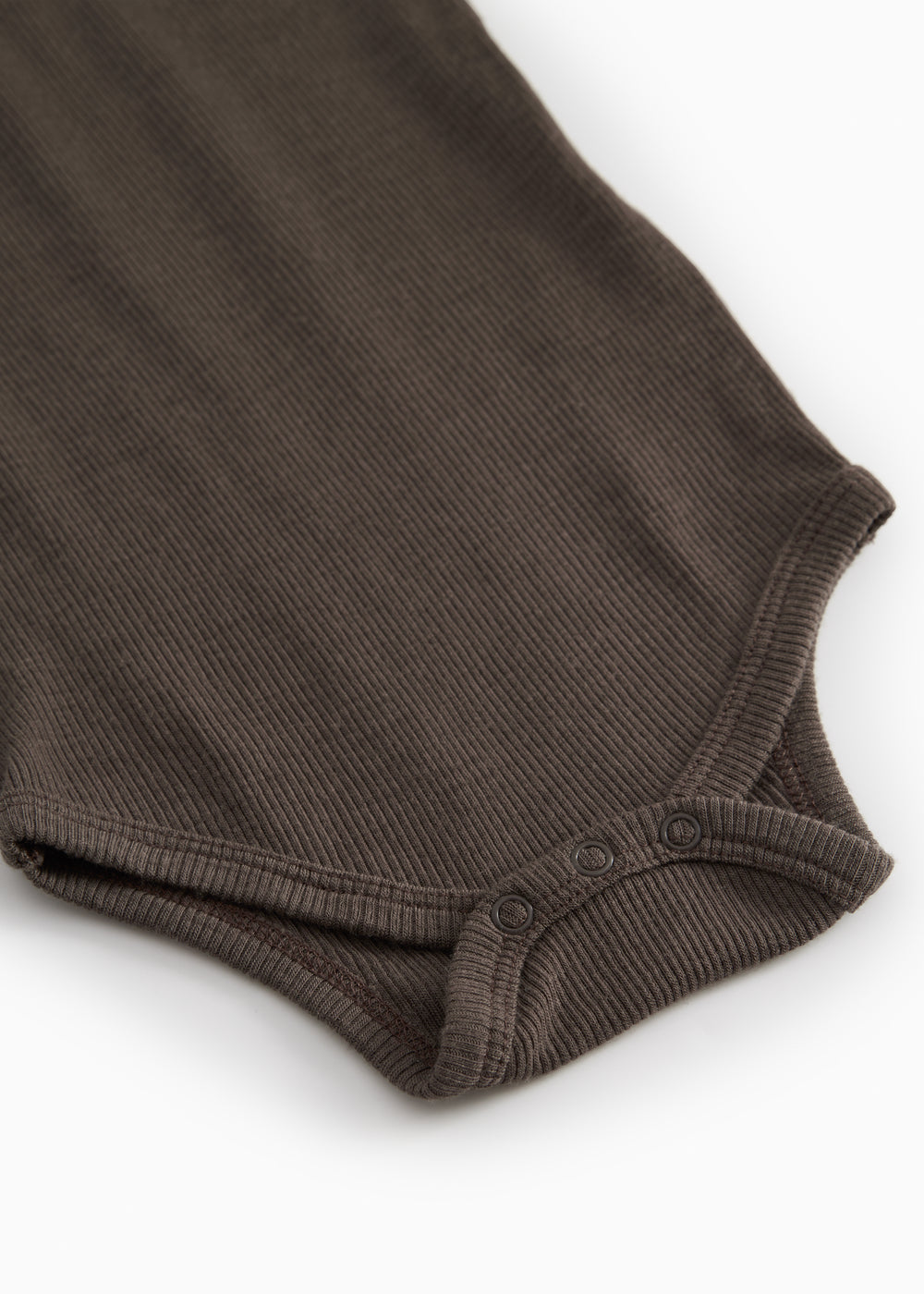 Simple long-sleeved bodystocking that closes with snaps on the left shoulder and between the legs for easy diaper changes.