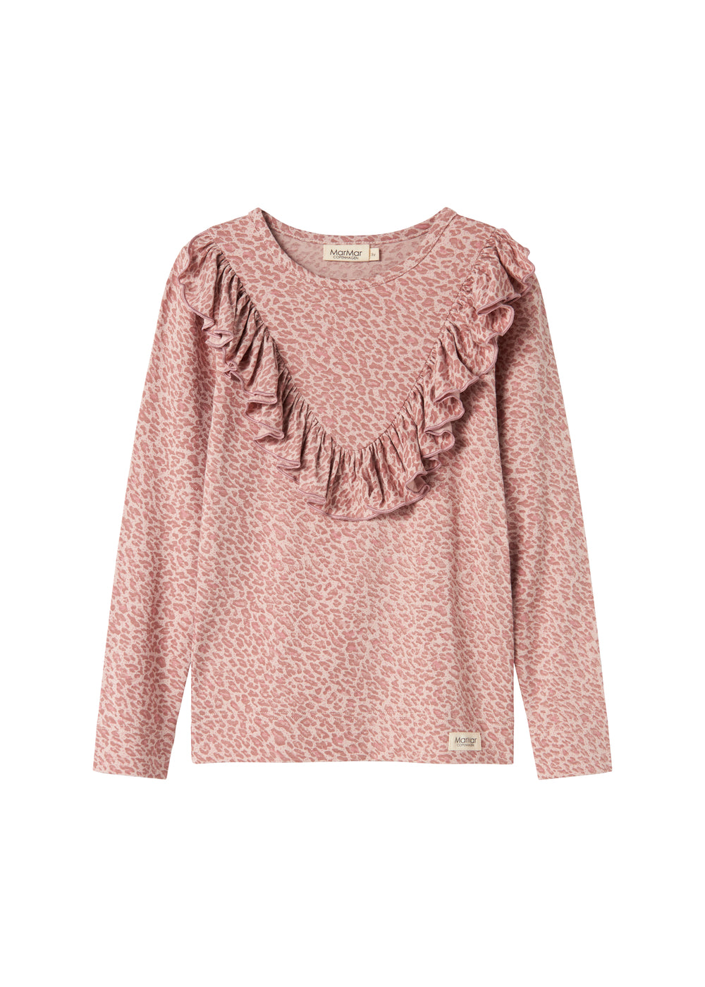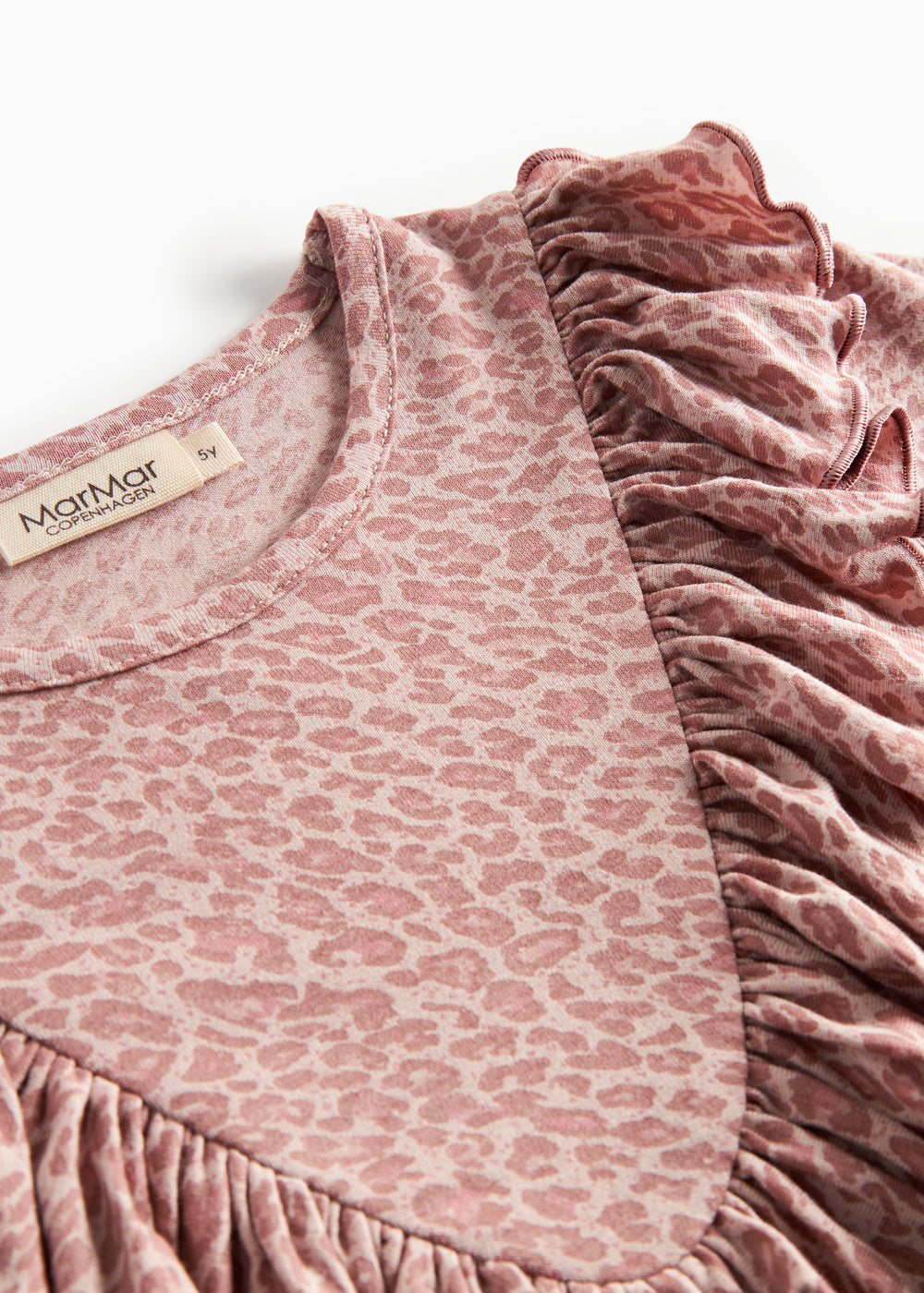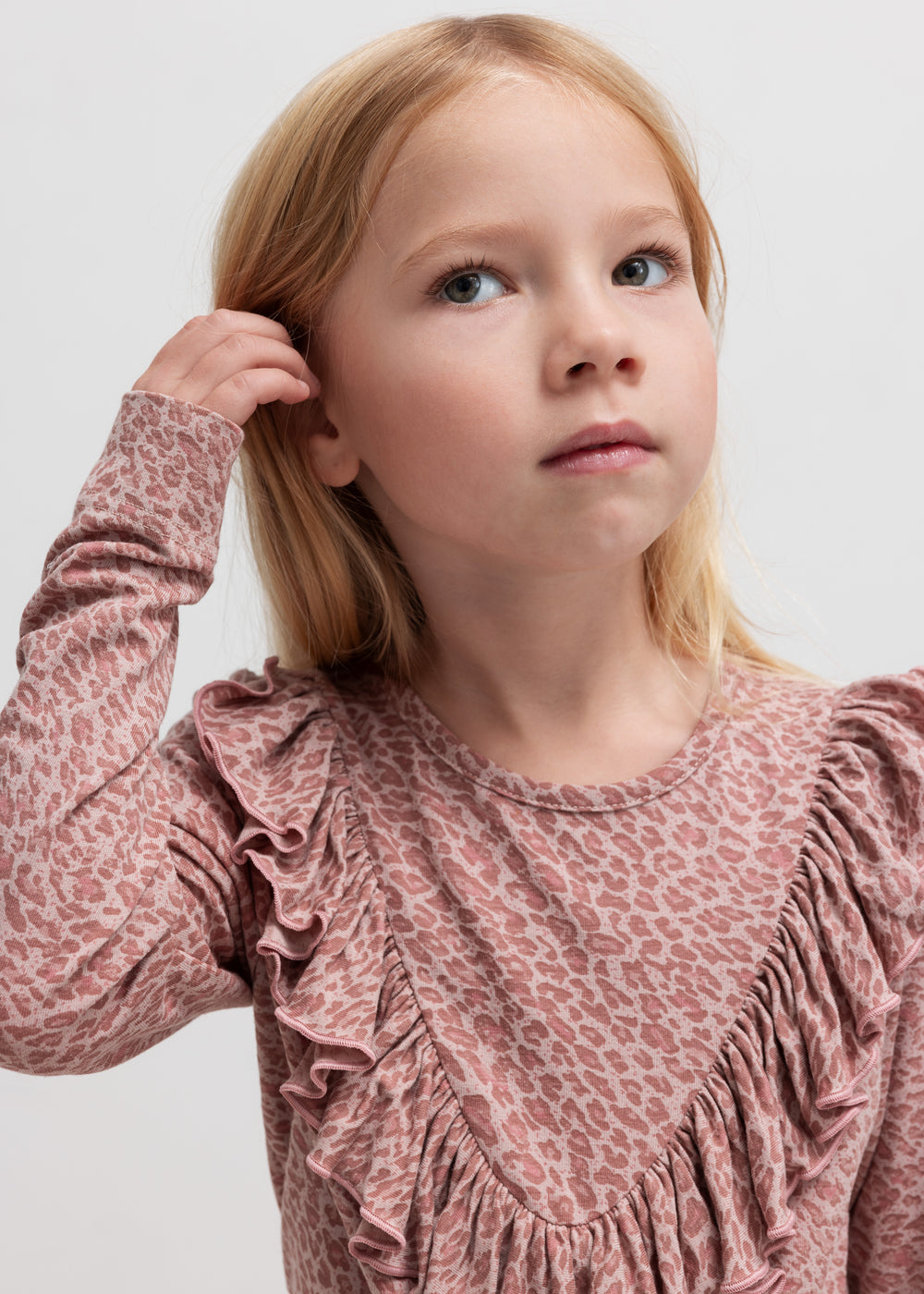 Pige iført lyserød leopardmønstret bluse med flæsedetalje