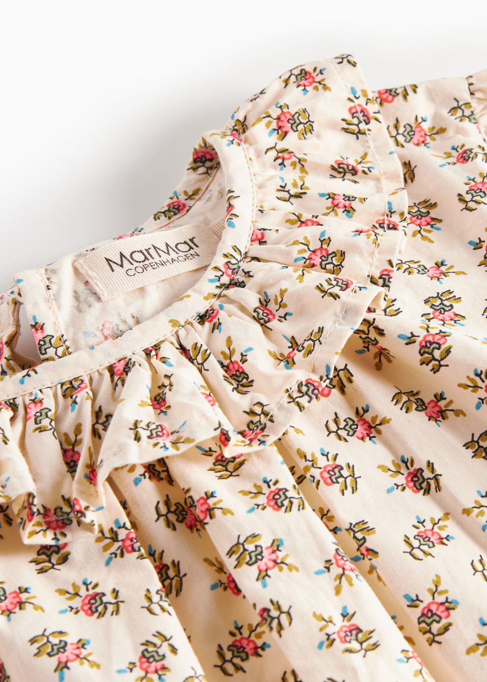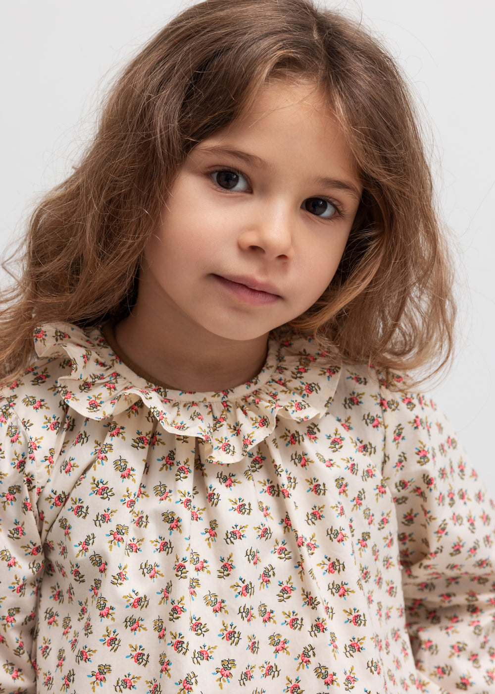 Long-sleeved and loose-fitting blouse for children with a delicate hand-drawn floral print and ruffle detail at the neck. The blouse has a button closure at the back and is both comfortable, light and airy to wear.