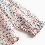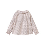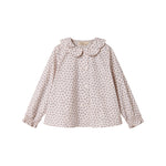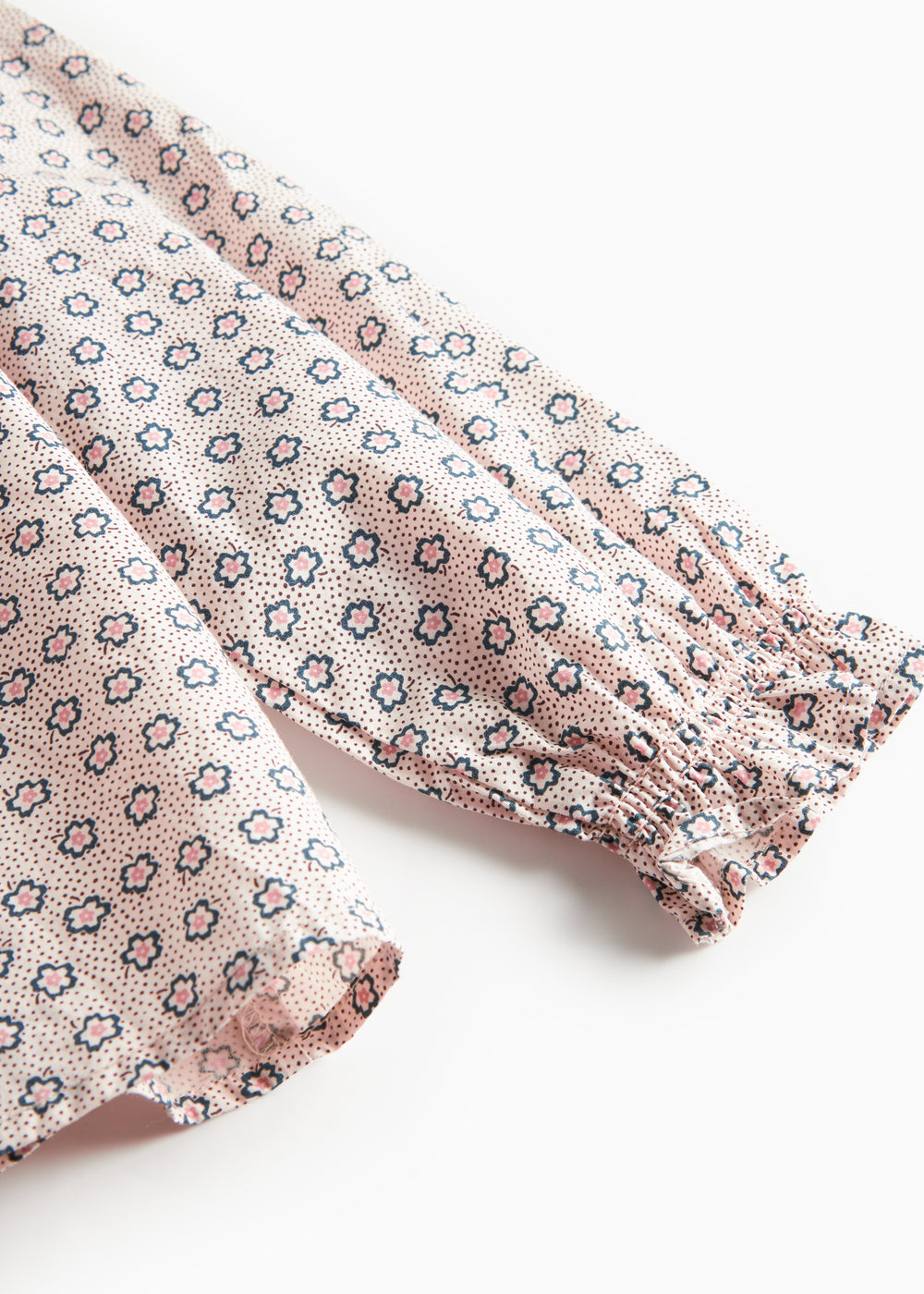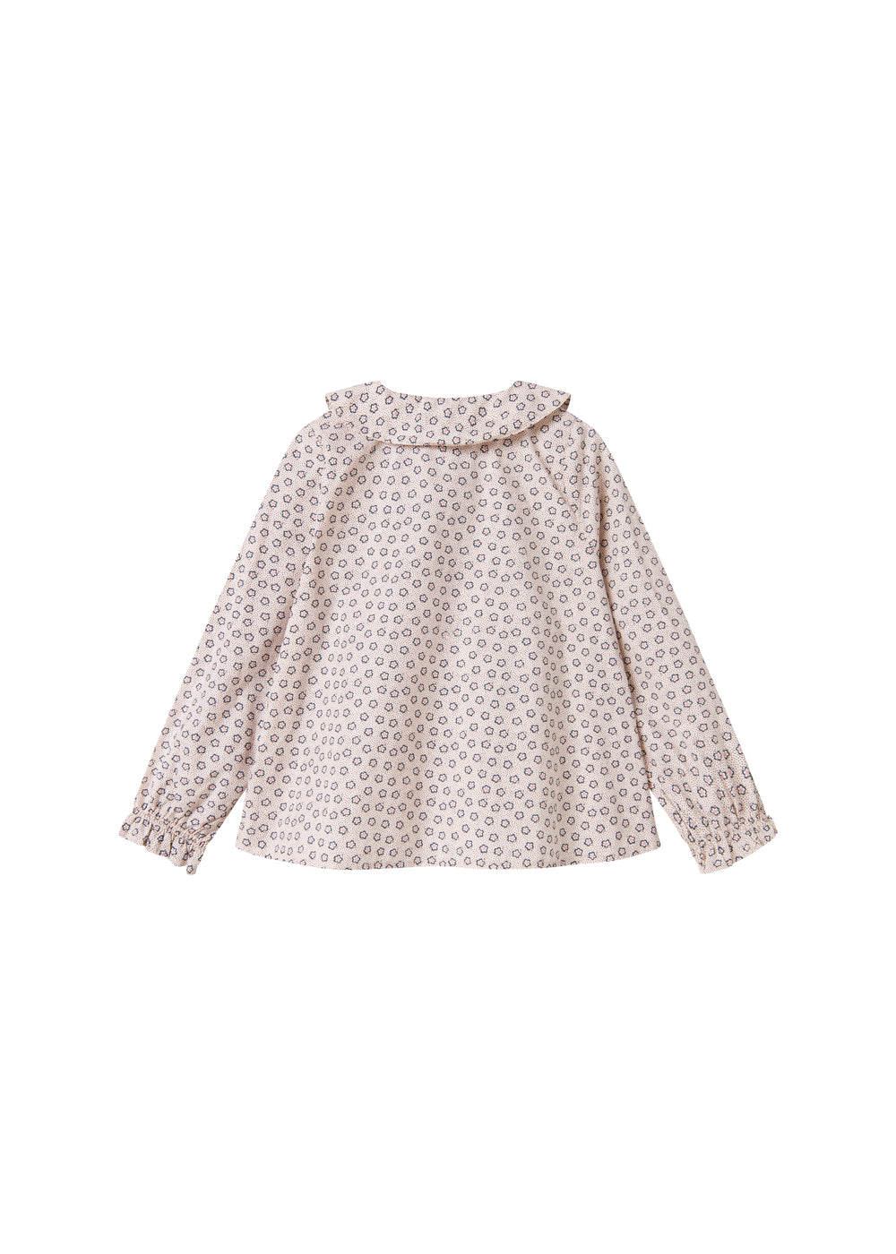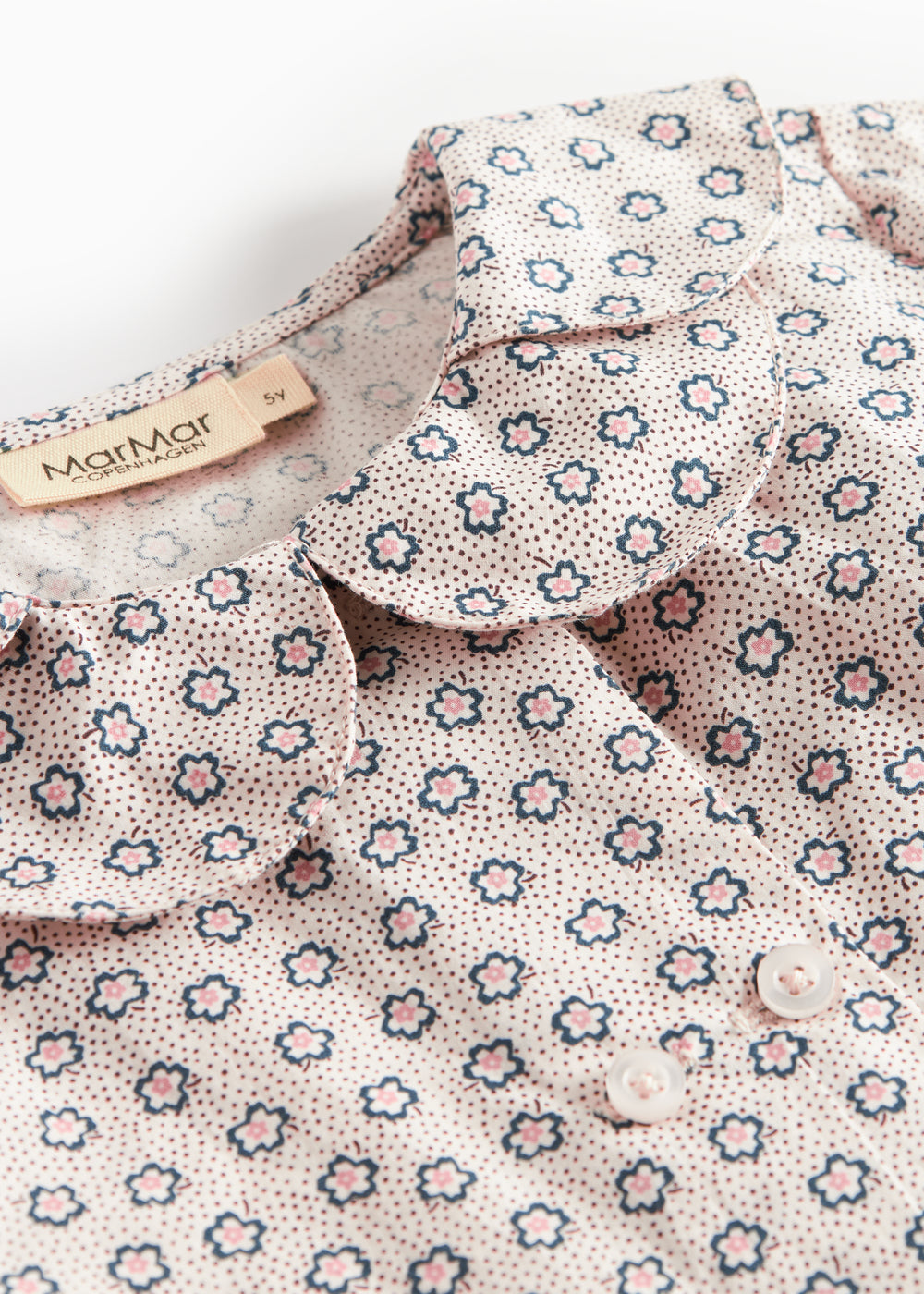 Long-sleeved shirt for children with hand-drawn floral print and a nice collar with wavy edge. The shirt has a double button closure at the front and elastic at the wrists which provides both style and comfort. The shirt is both comfortable, light and airy to wear.