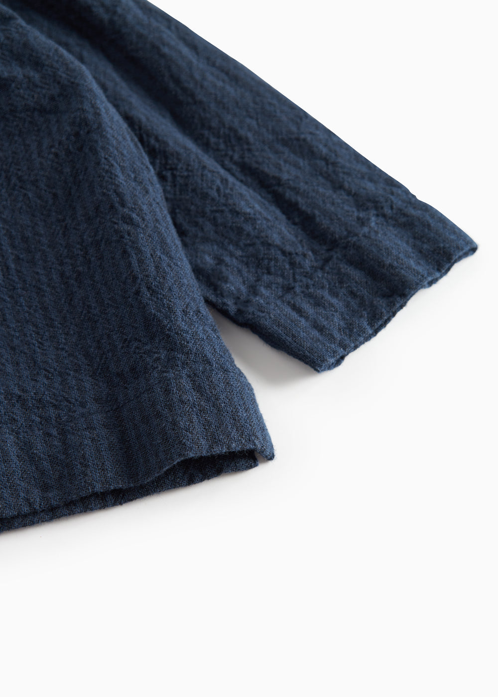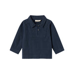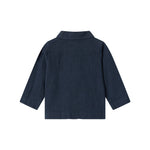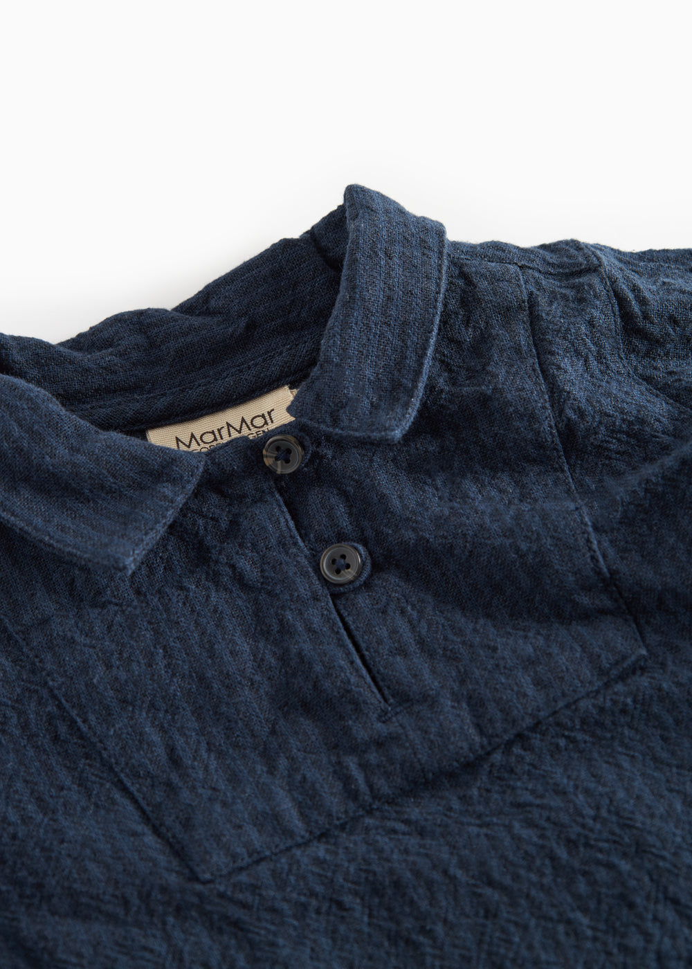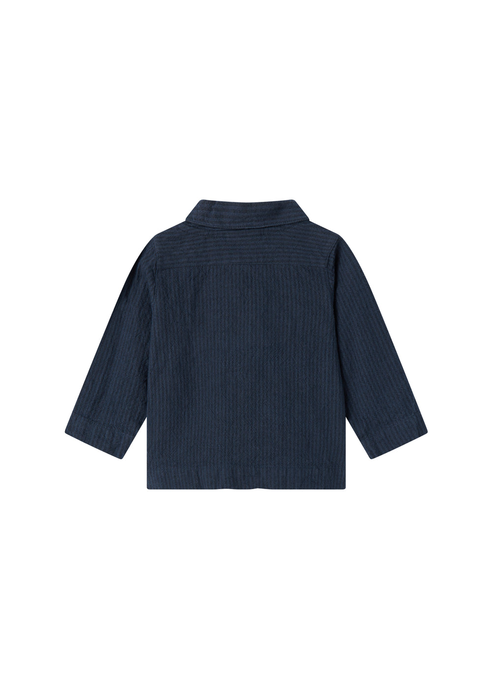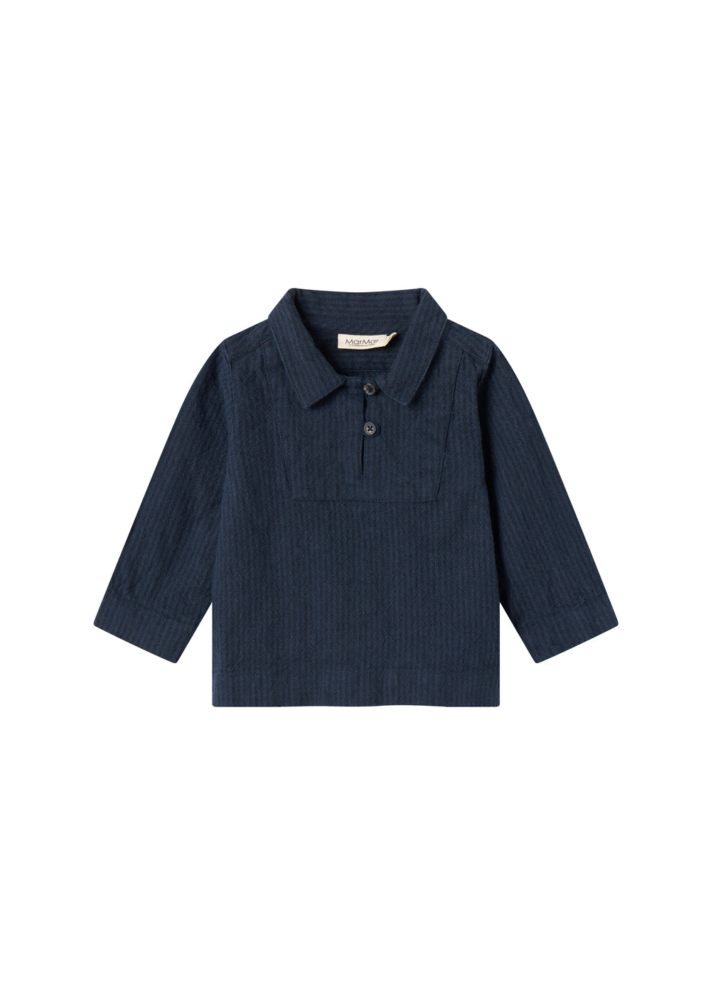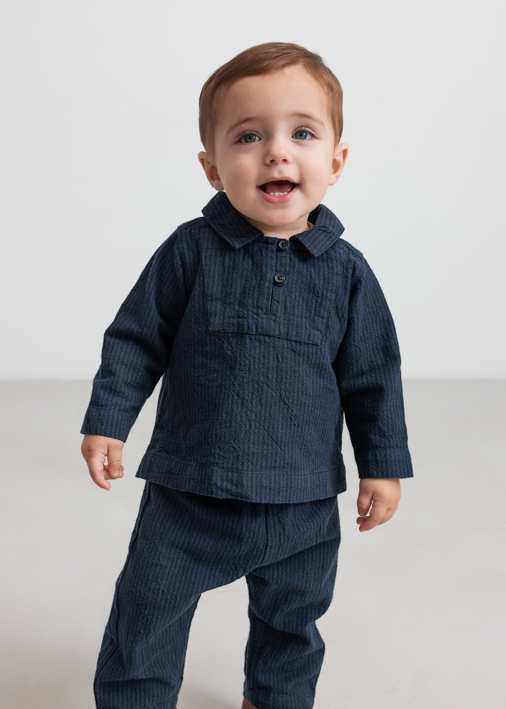 Comfortable long-sleeved baby striped chambray denim shirt with collar and half-front closure with two buttons.
