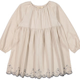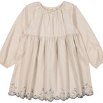 Long-sleeved dress with good volume. The dress has fine wavy edges and embroidered Moomin details at the bottom. The length of the dress goes above the knee.