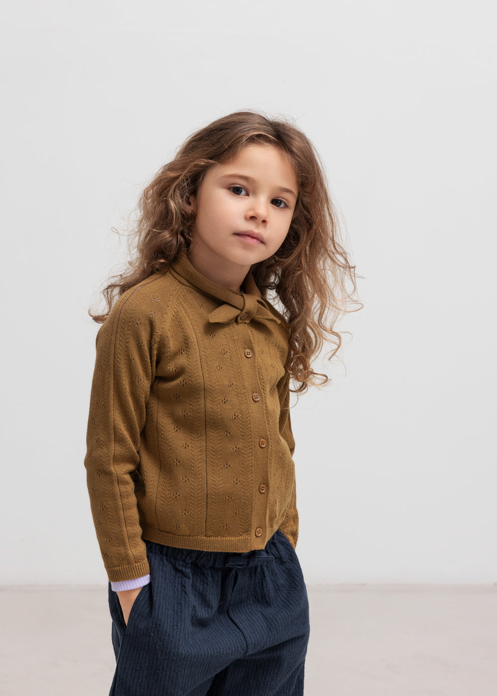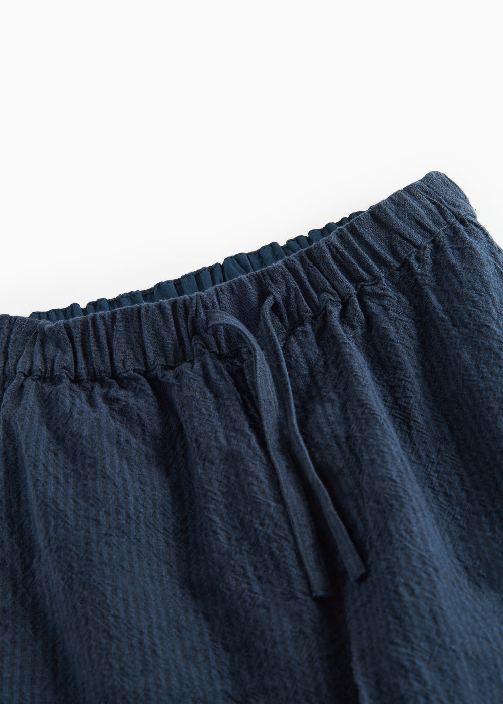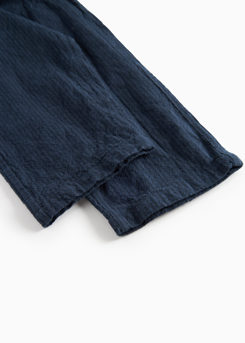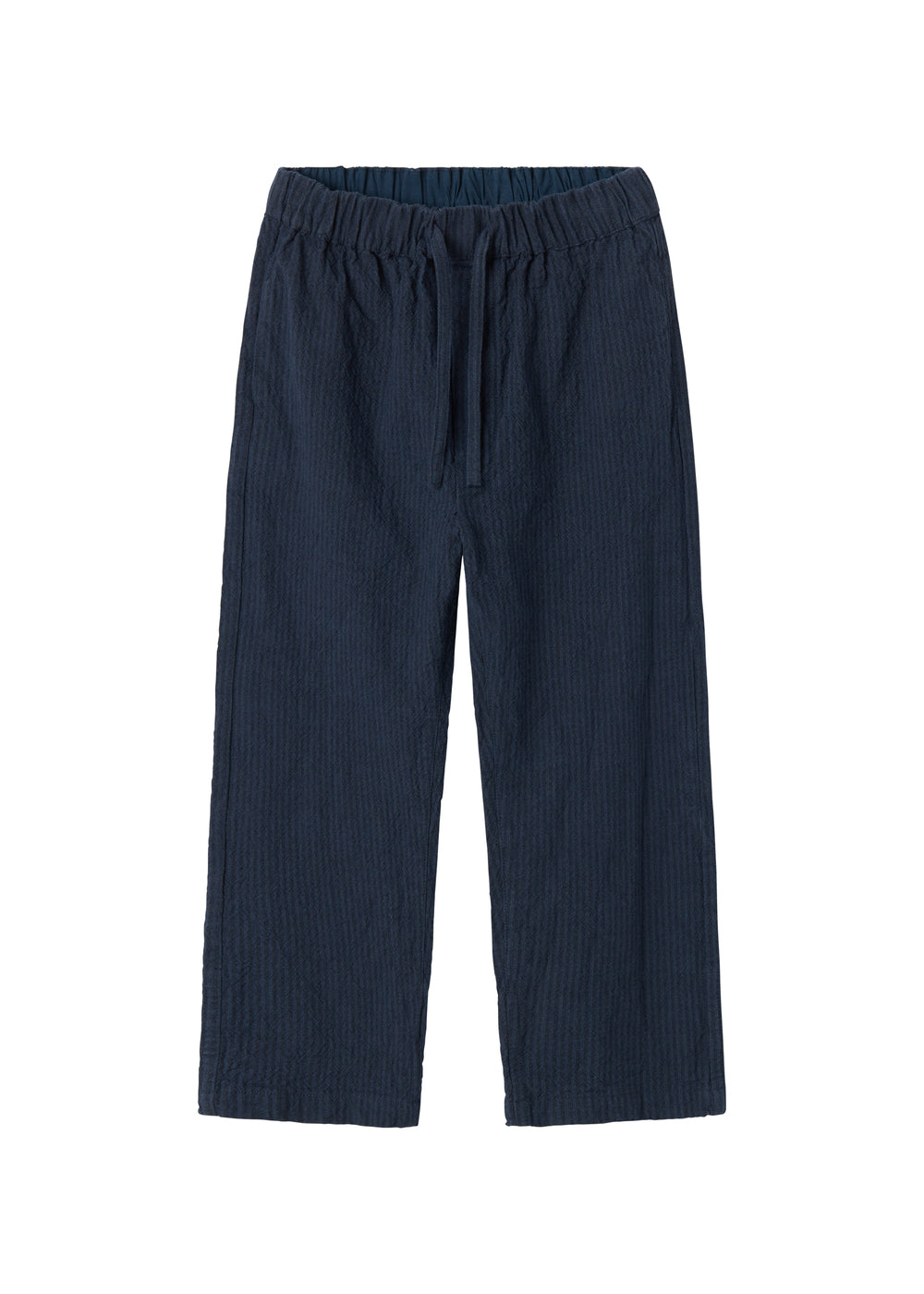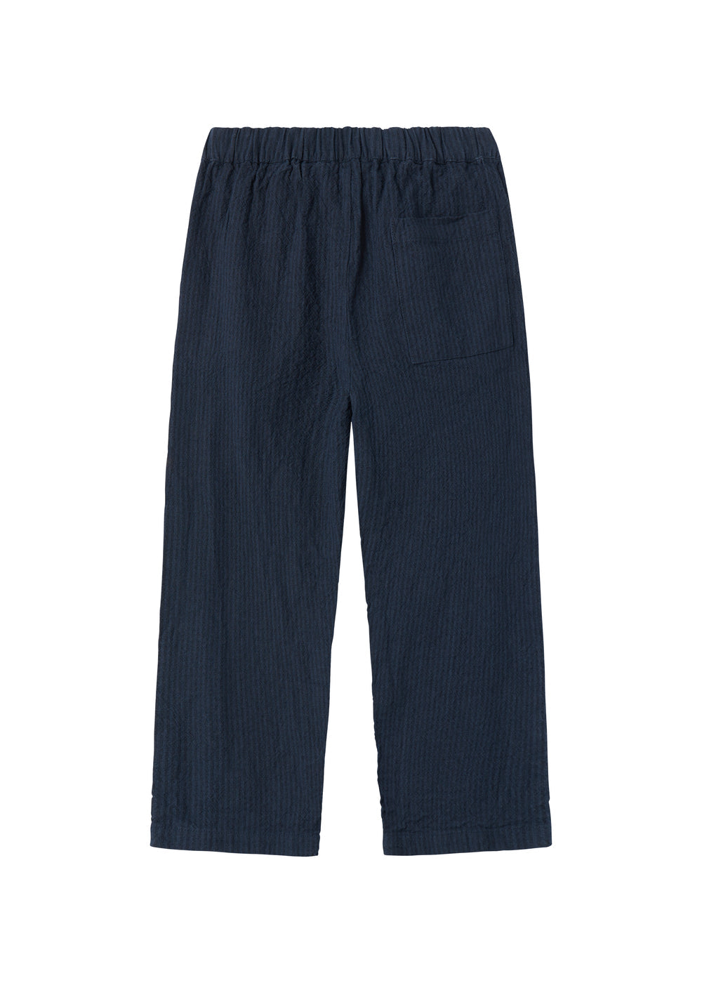 Pants for children in striped chambray denim with a loose fit and a pocket on the back as well as elastic and a drawstring at the waist.