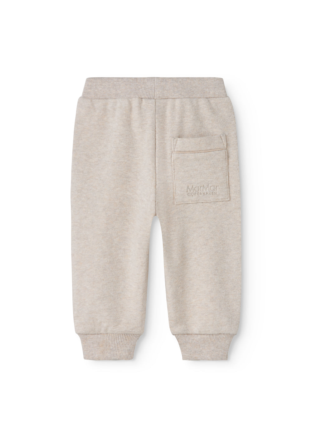 Soft baby sweatpants in a looser fit with elastic at the waist, bottom, two side pockets and one pocket with logo embroidery at the back. The sweatpants are very soft and comfortable to wear.