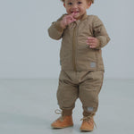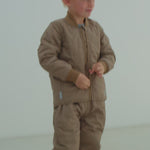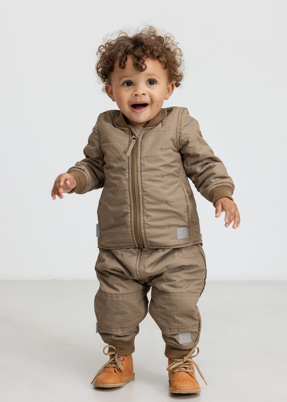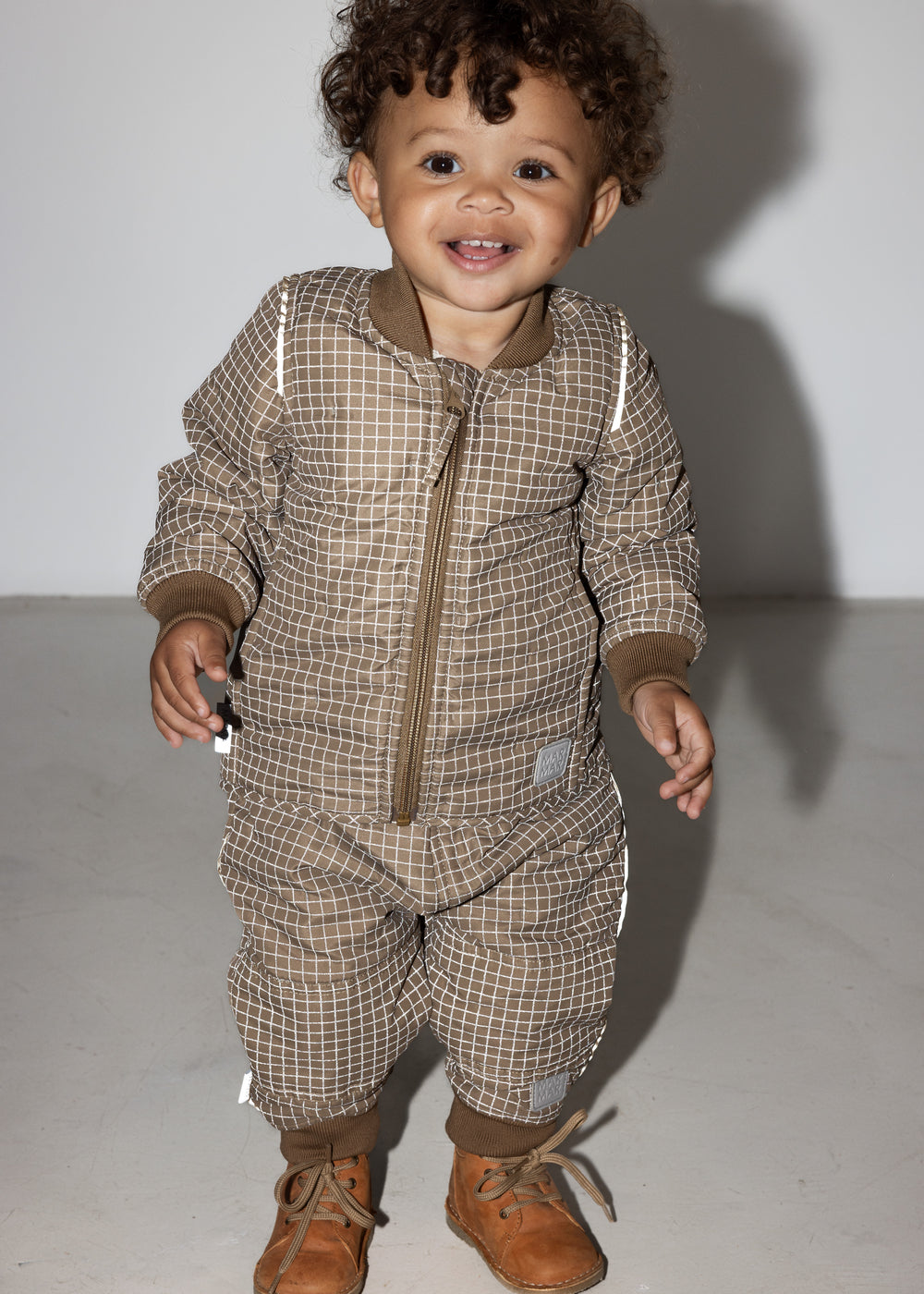 Barn iført brunternet termojakke og matchende bukser, smilende