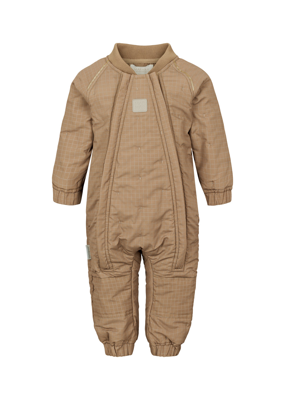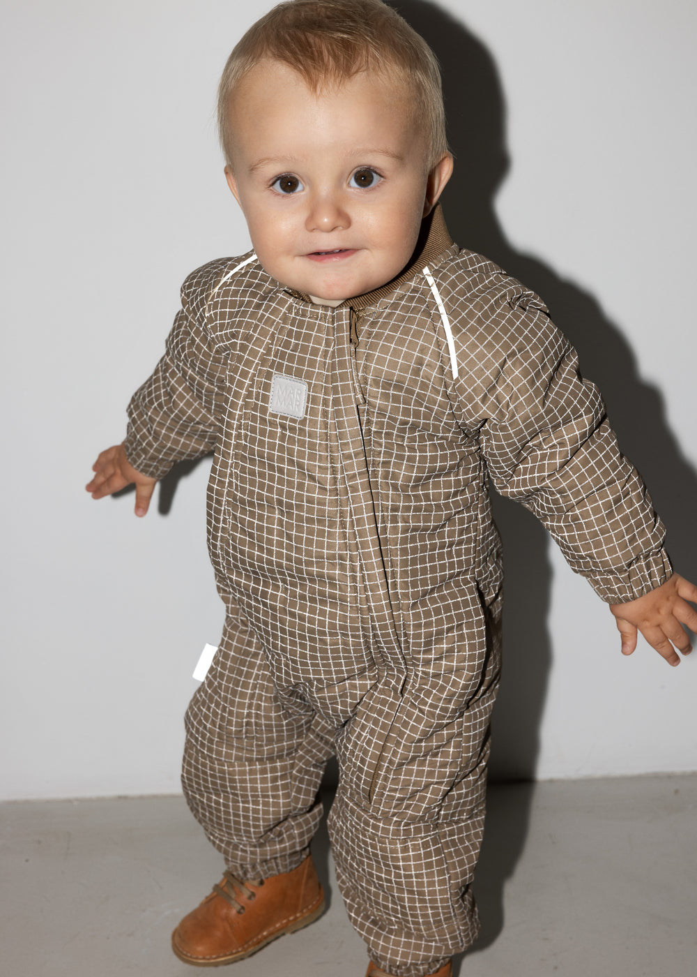 Baby iført brunternet termodragt, smilende og i bevægelse
