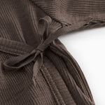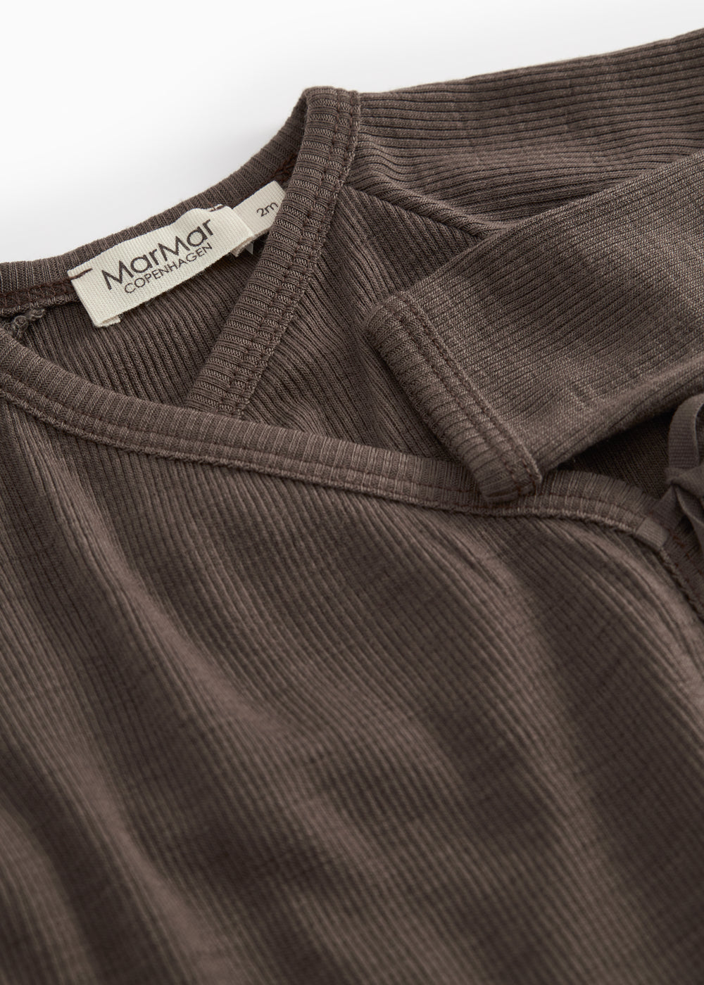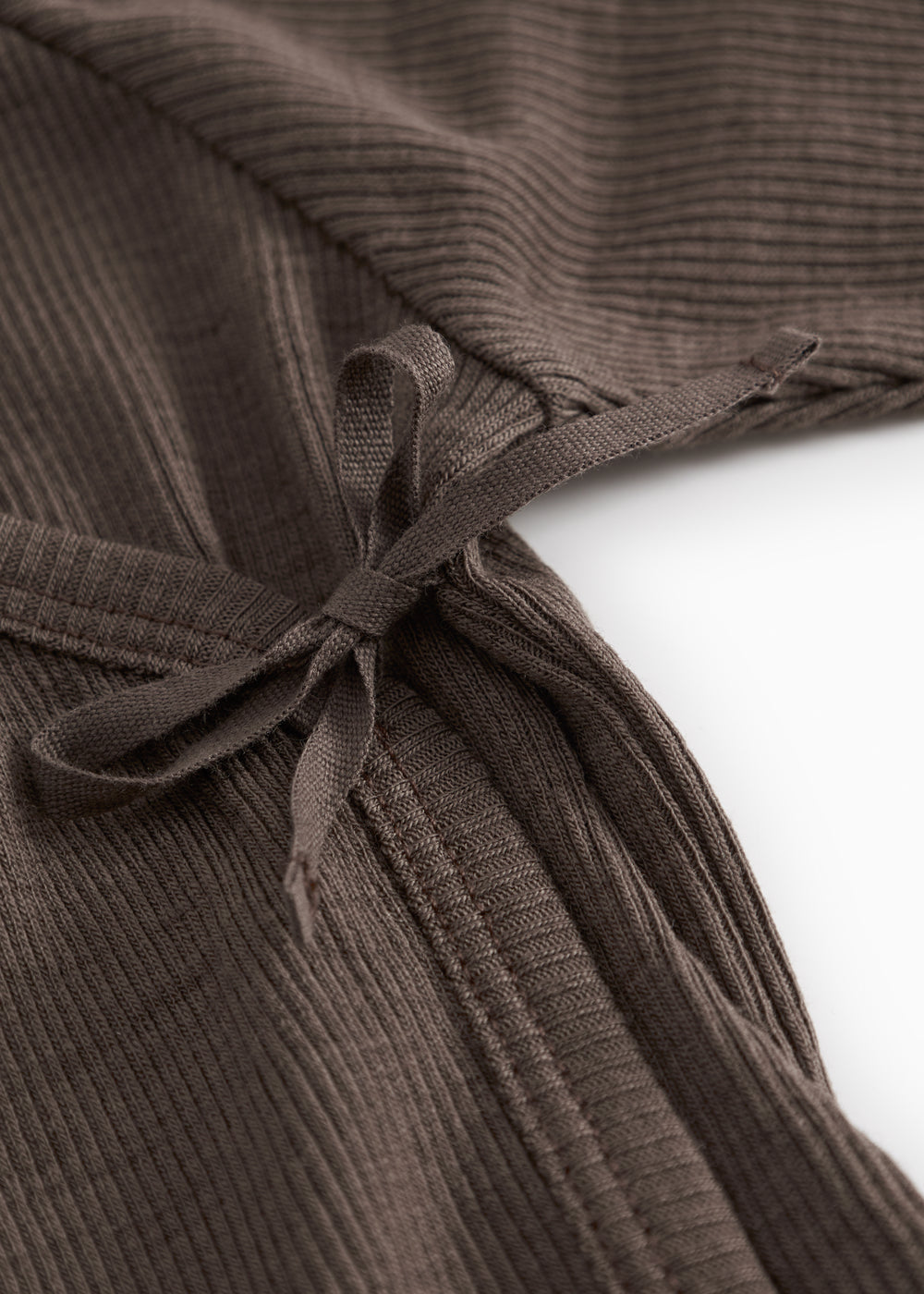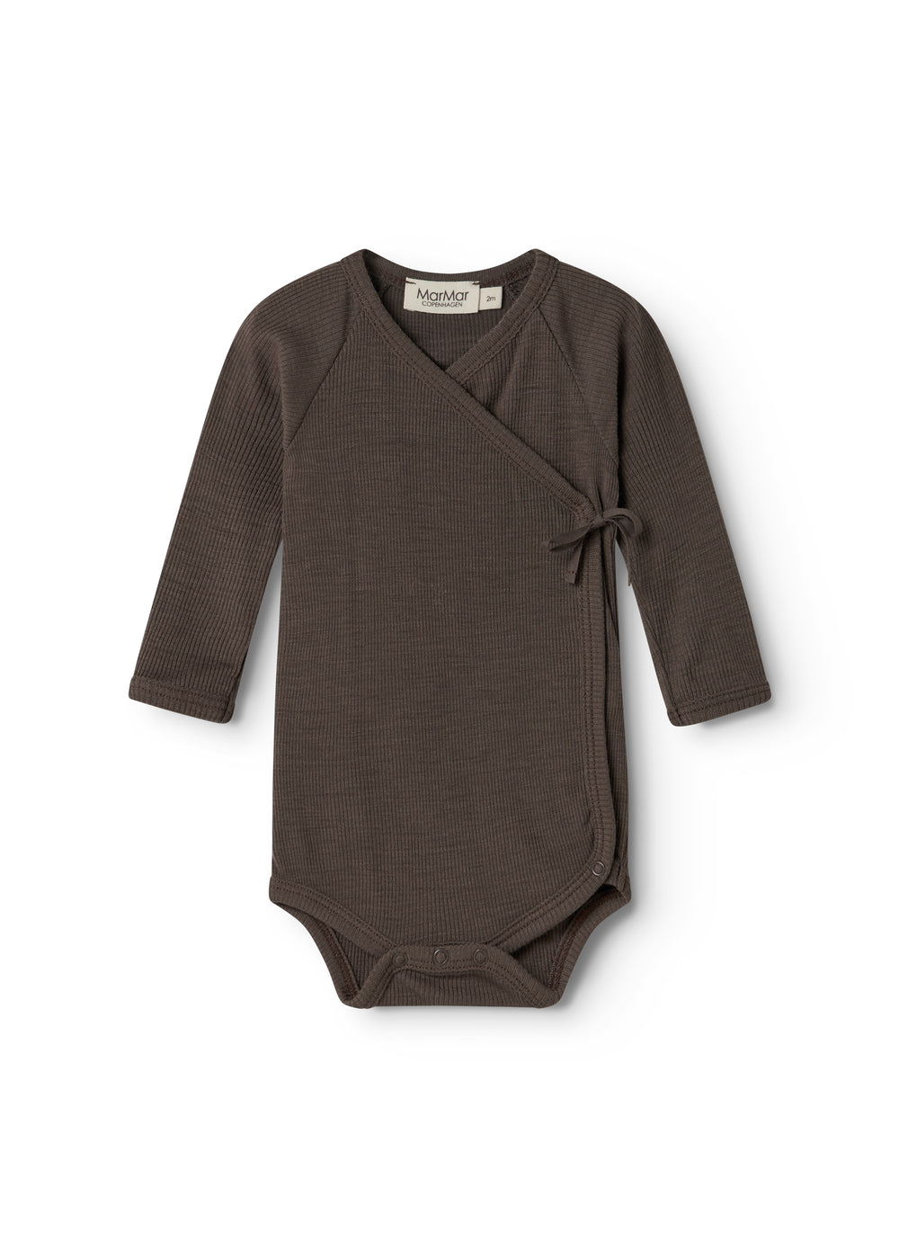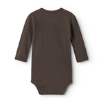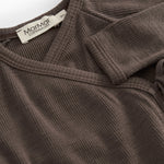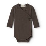 Long-sleeved bodystocking for newborns with wrap-around closure. Closes with snaps and ties.