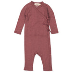 Long-sleeved jumpsuit with wrap-around closure, the suit closes with snaps and ties from the neck down one leg
