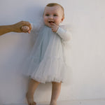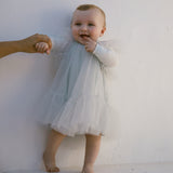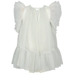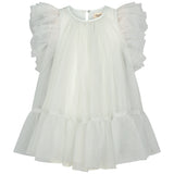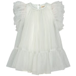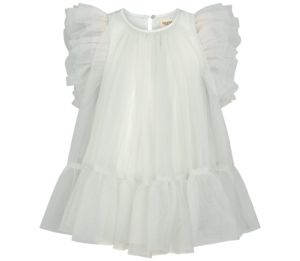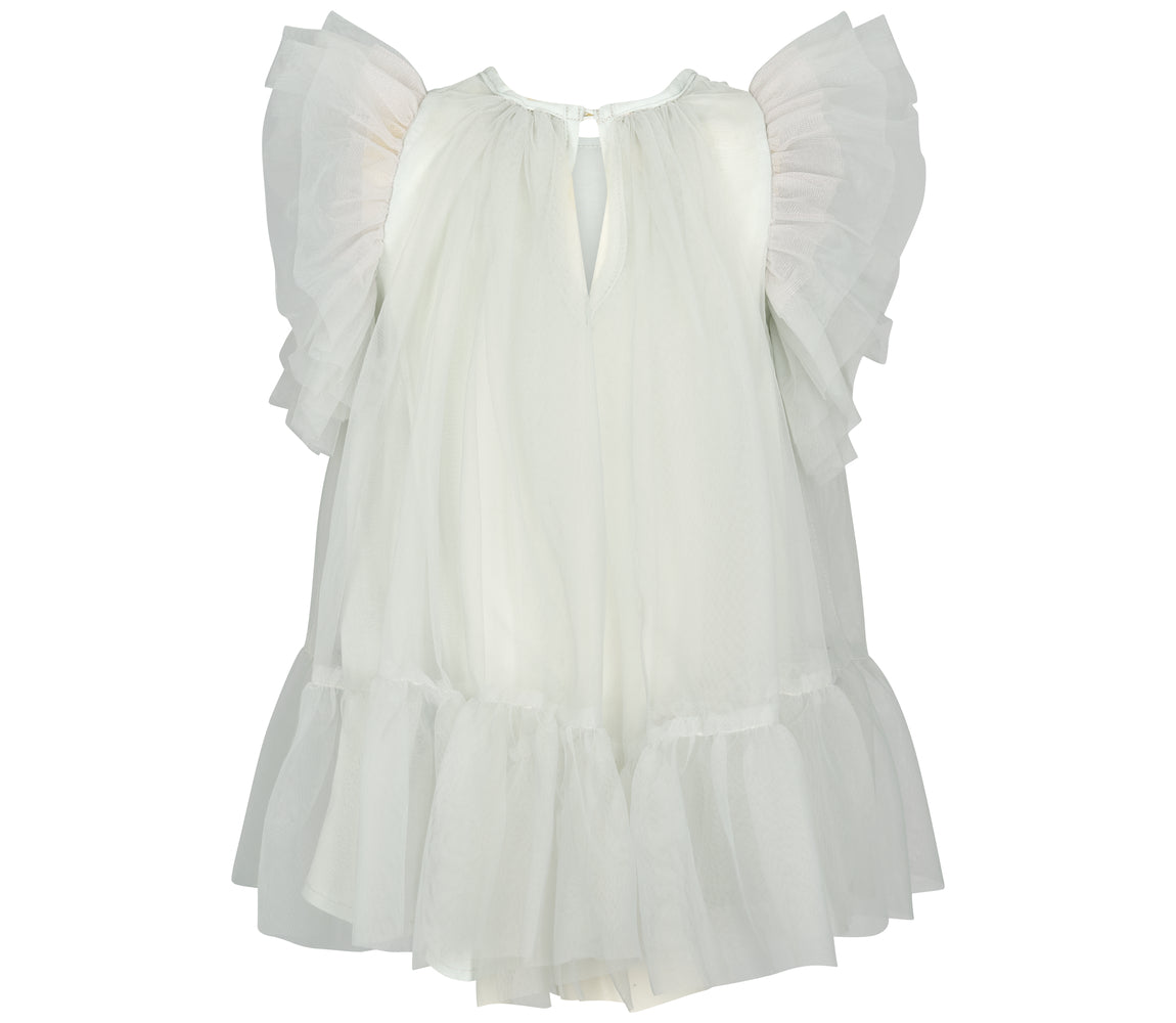 Nice and festive short-sleeved dress with many layers of tulle for volume. The dress has beautiful tulle ruffles on the sleeves and closes with a button closure at the back. The dress length goes above the knees.