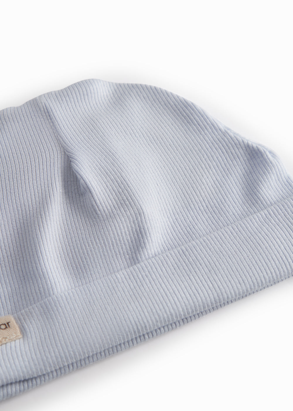 Lyseblå hue til nyfødt med kant der kan foldes ned eller op