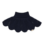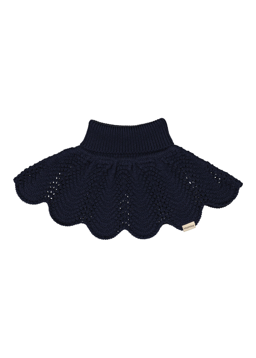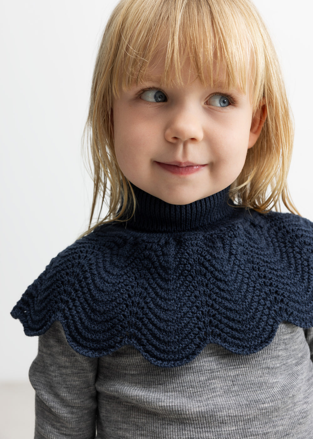 Knitted neck warmer that provides optimal protection against the cold by covering the neck while still fitting comfortably. The neck warmer has decorative wavy edges and a lace pattern at the bottom that adds an elegant and feminine touch. The neck warmer is soft, warm and perfect for the colder days.