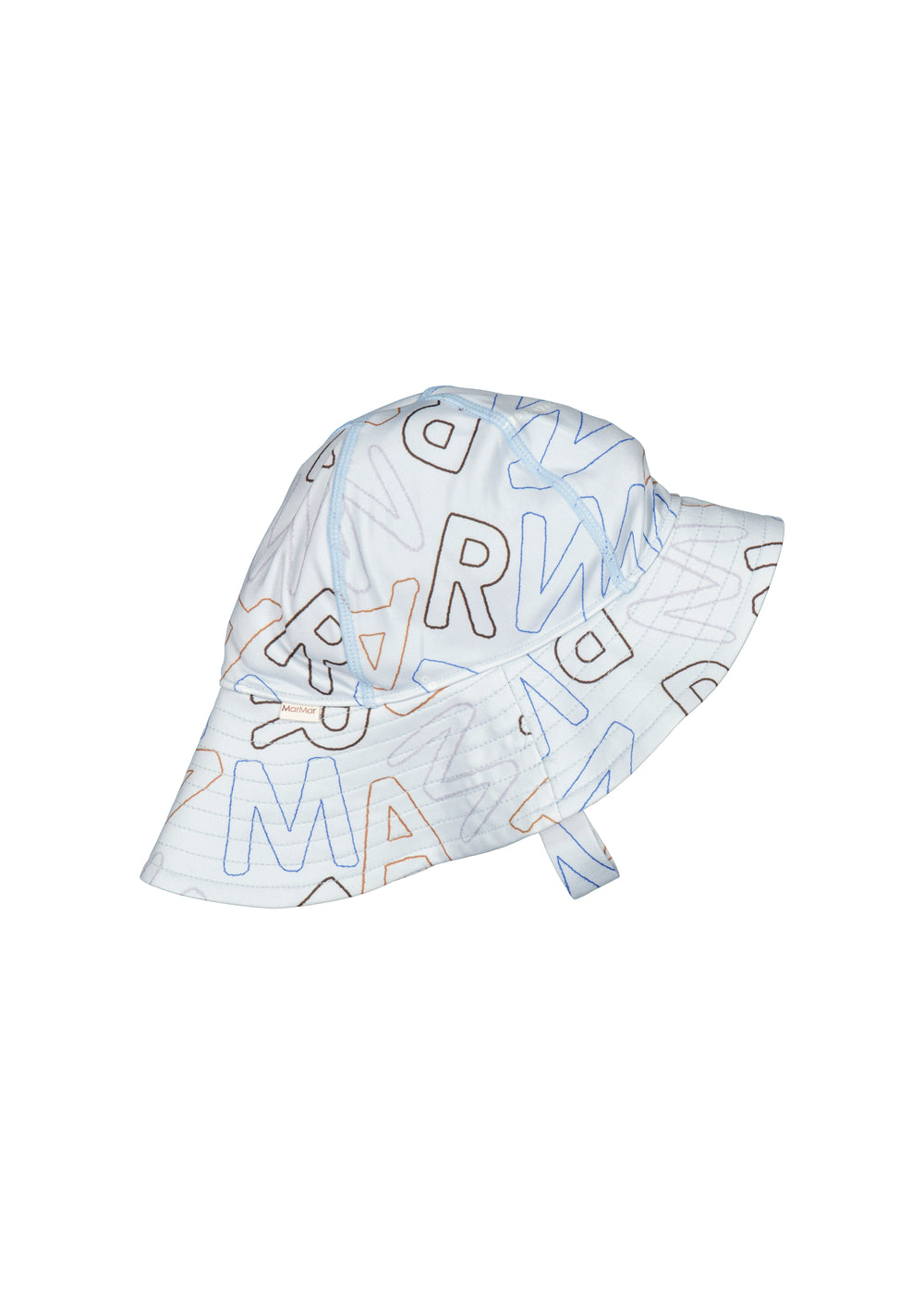 Summer sun hat with wide brim that is longer at the neck. Strap with button closure in 2 lengths