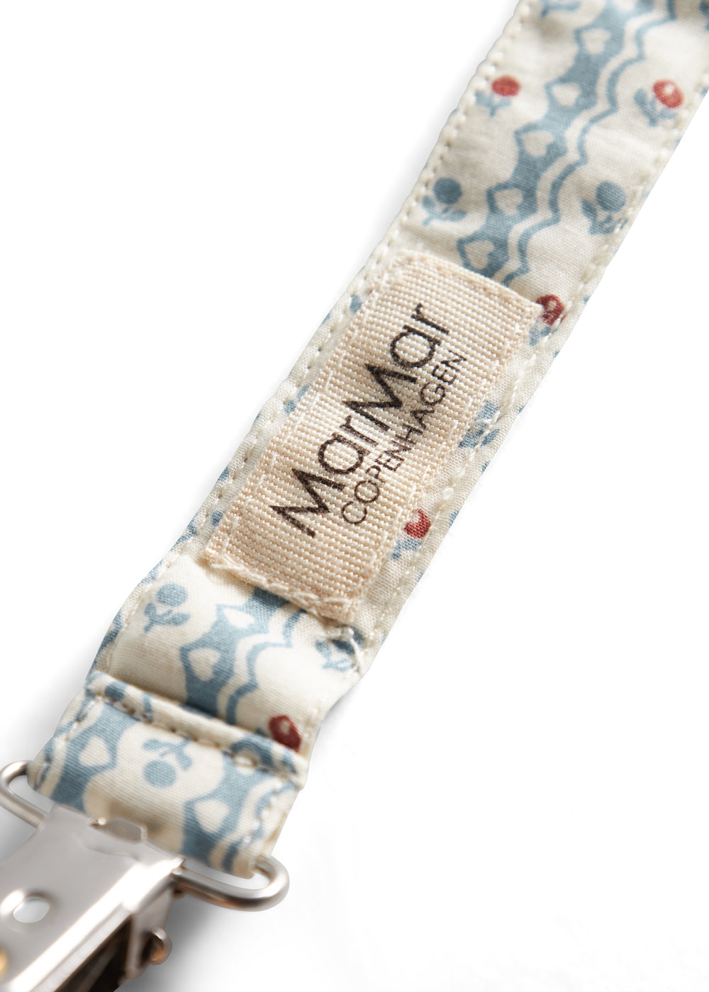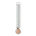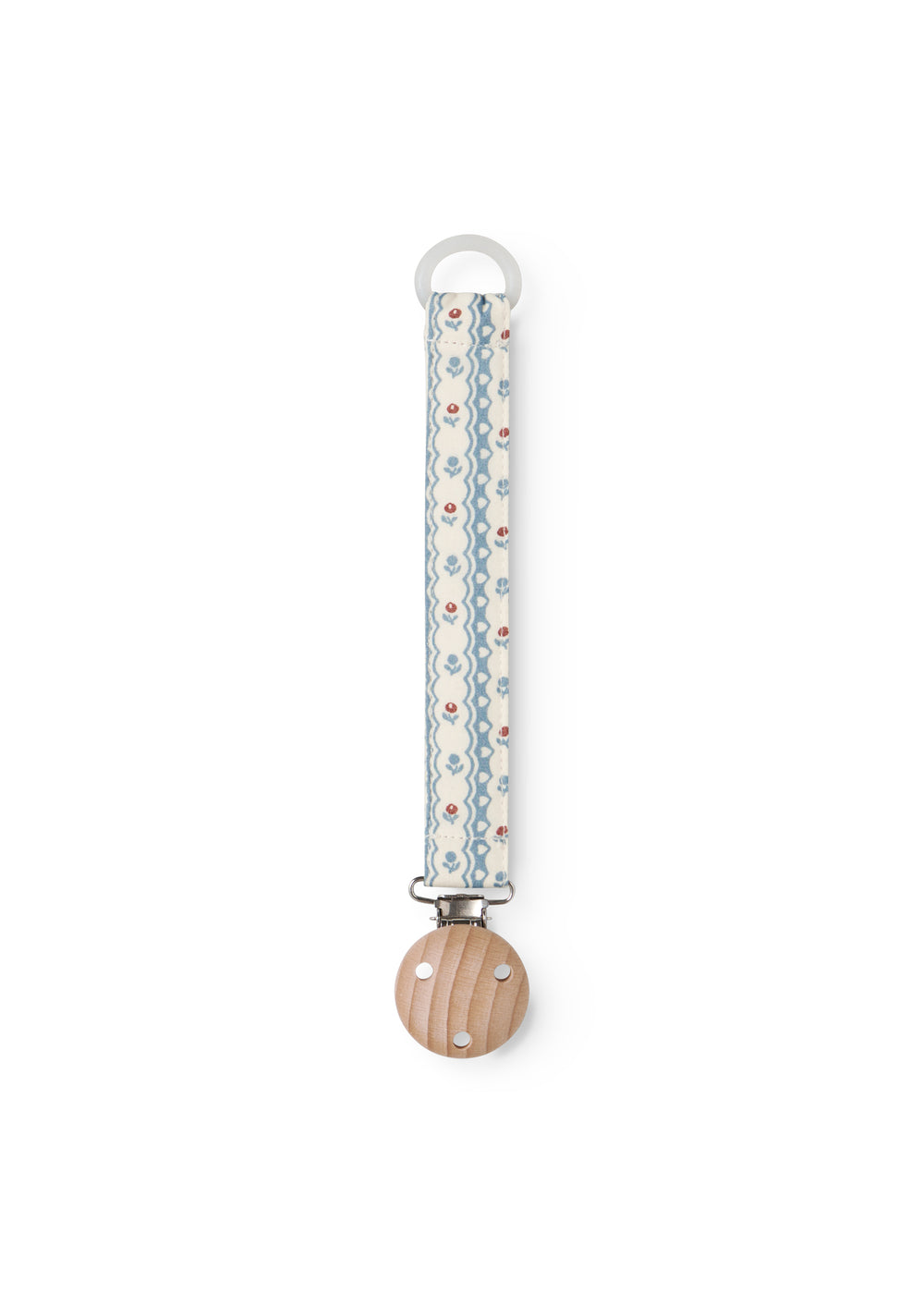 Pacifier cord with rubber ring and wooden/metal clip. Length of cord 19.5 cm.