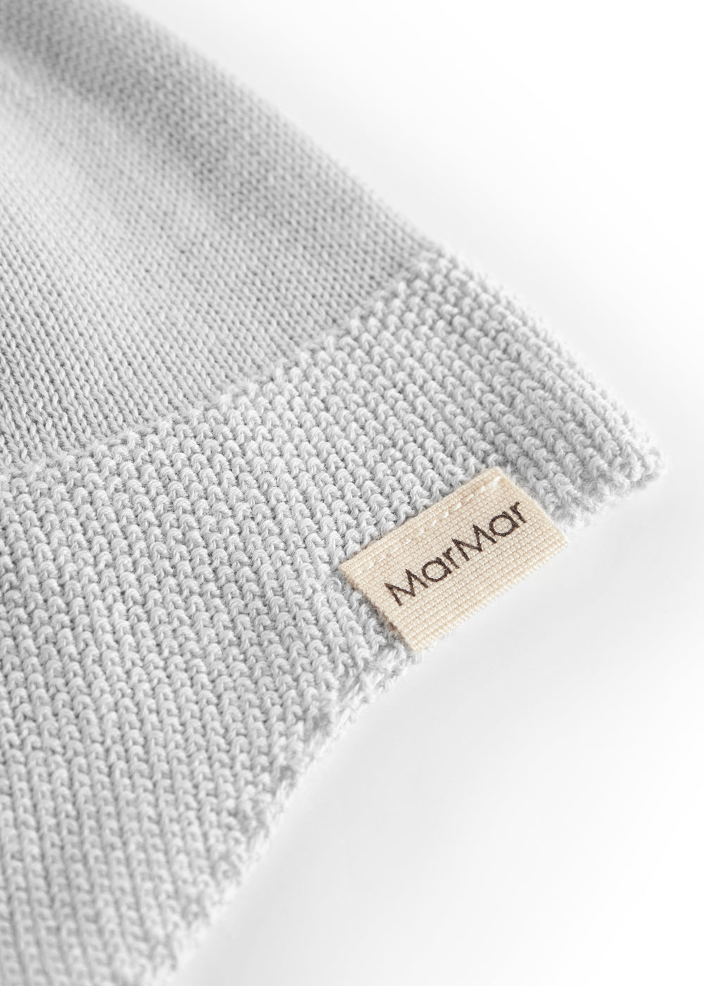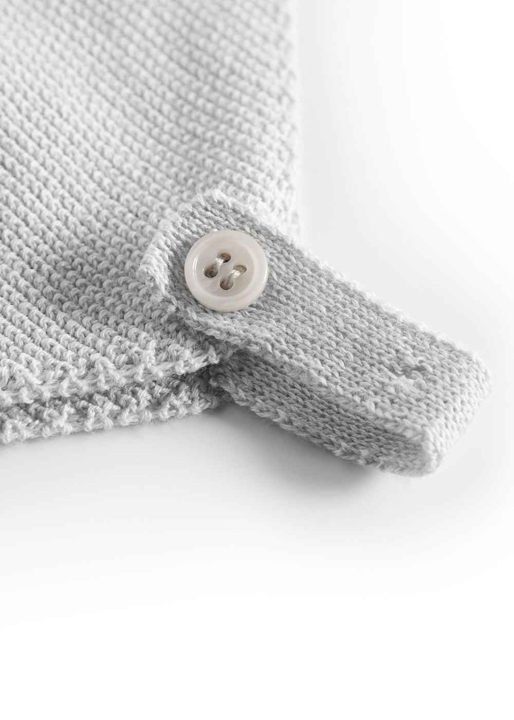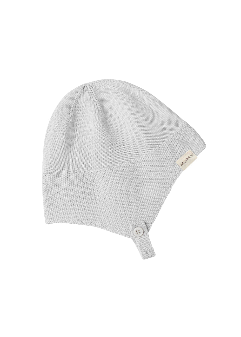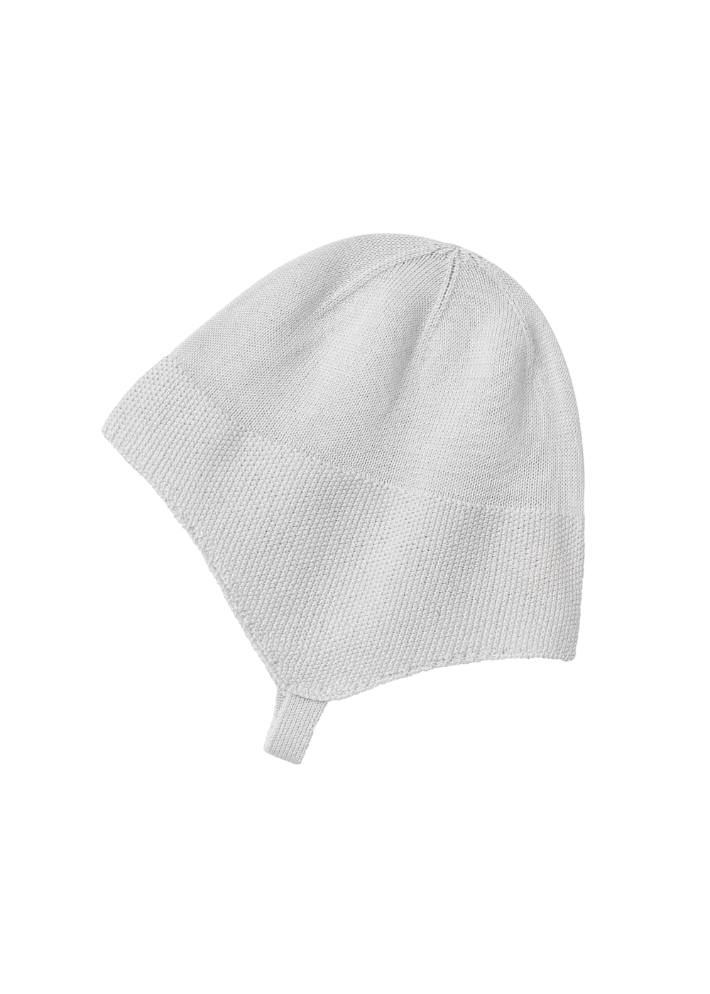 Hat in pearl knit for baby that goes down over the ears, with a strap under the chin that closes with button in two lengths. The hat is both soft, warm and comfortable to wear.