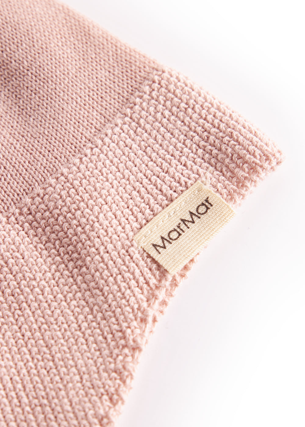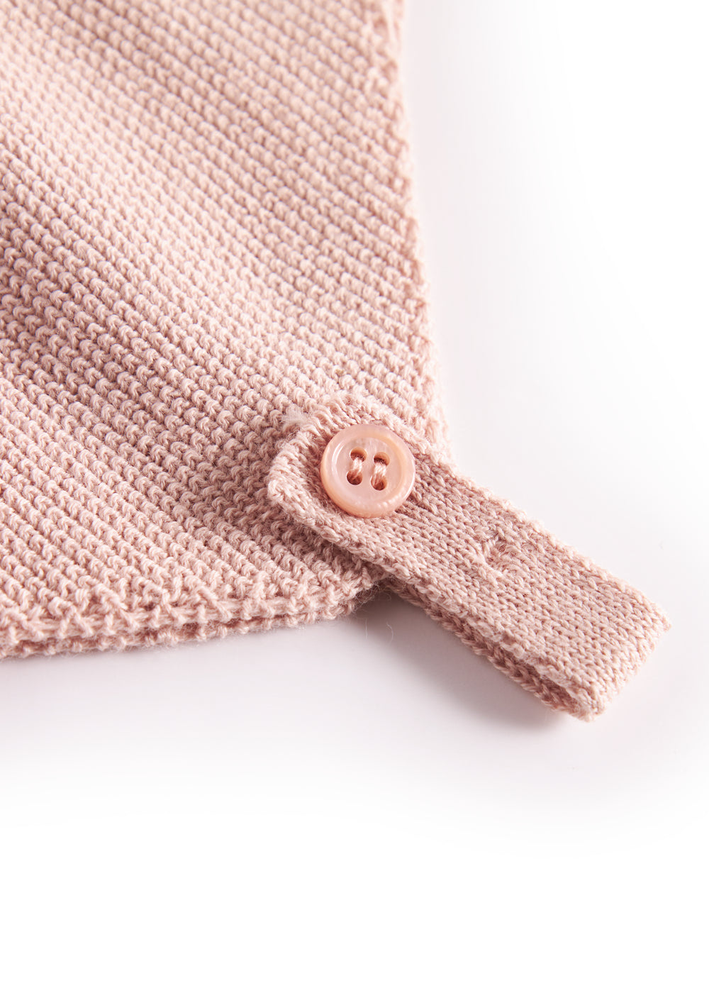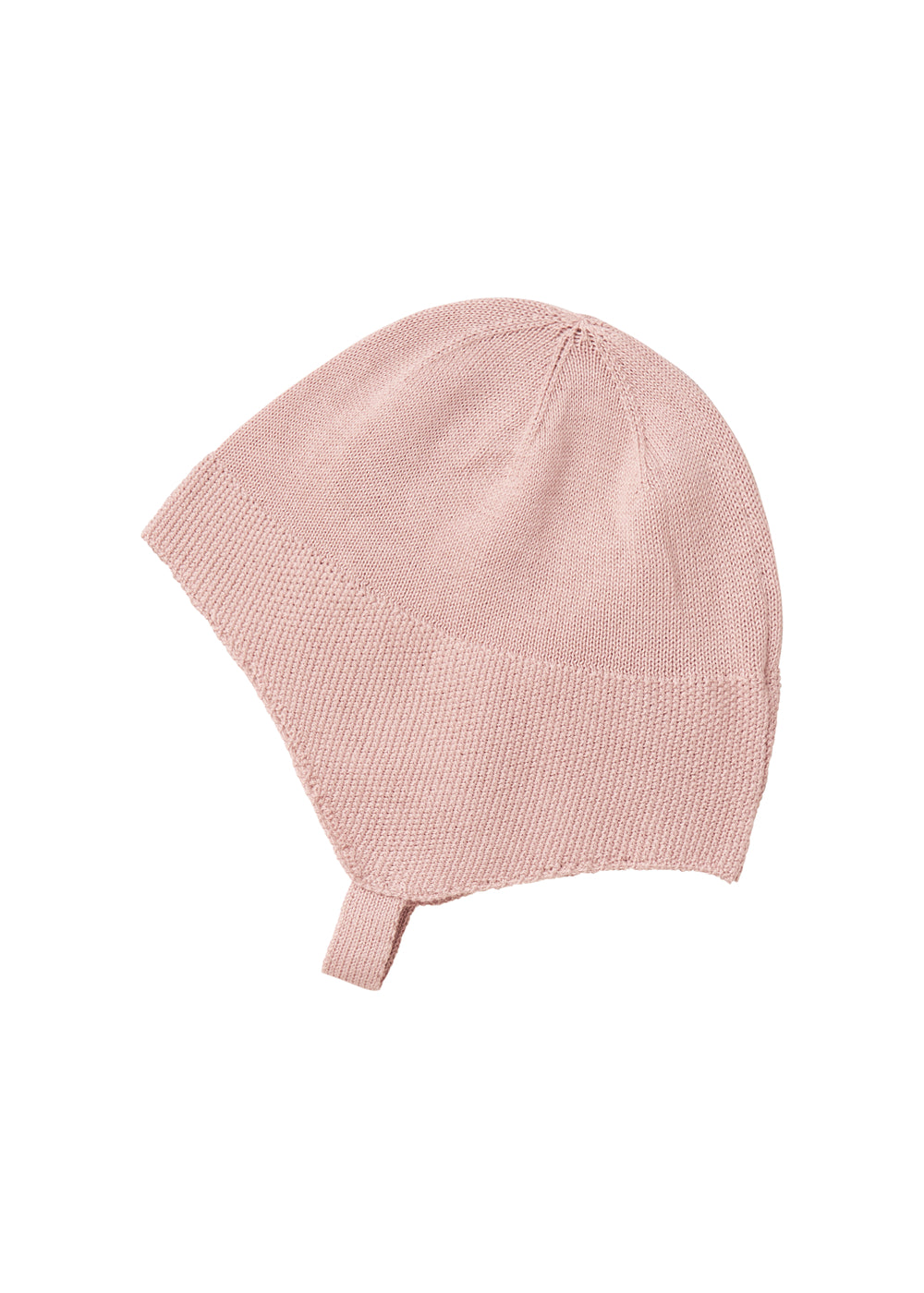 Hat in pearl knit for baby that goes down over the ears, with a strap under the chin that closes with button in two lengths. The hat is both soft, warm and comfortable to wear.