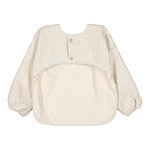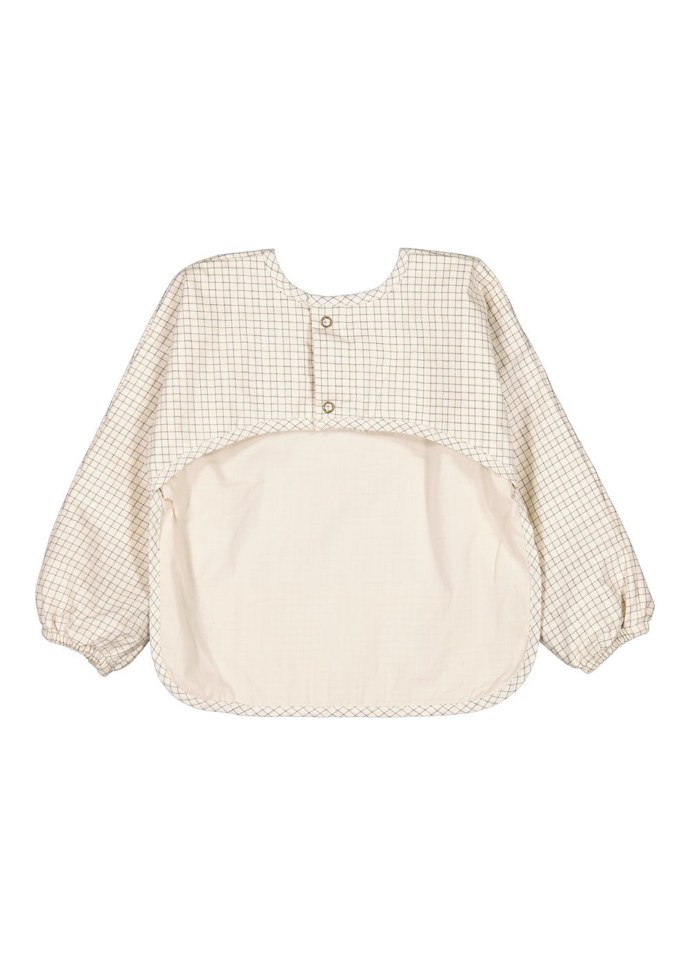 Long-sleeved apron with button closure at the back. The apron has a water-repellent coating so it is easy to wipe off.