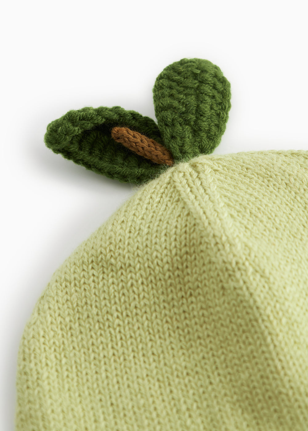Knitted hat for children shaped like a pear with a small stem on top. The knitted hat is soft, warm and comfortable to wear.