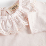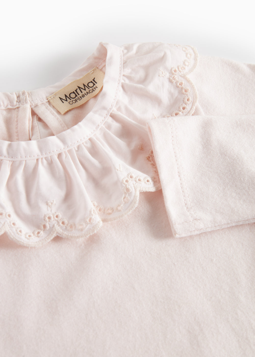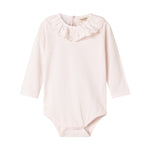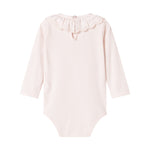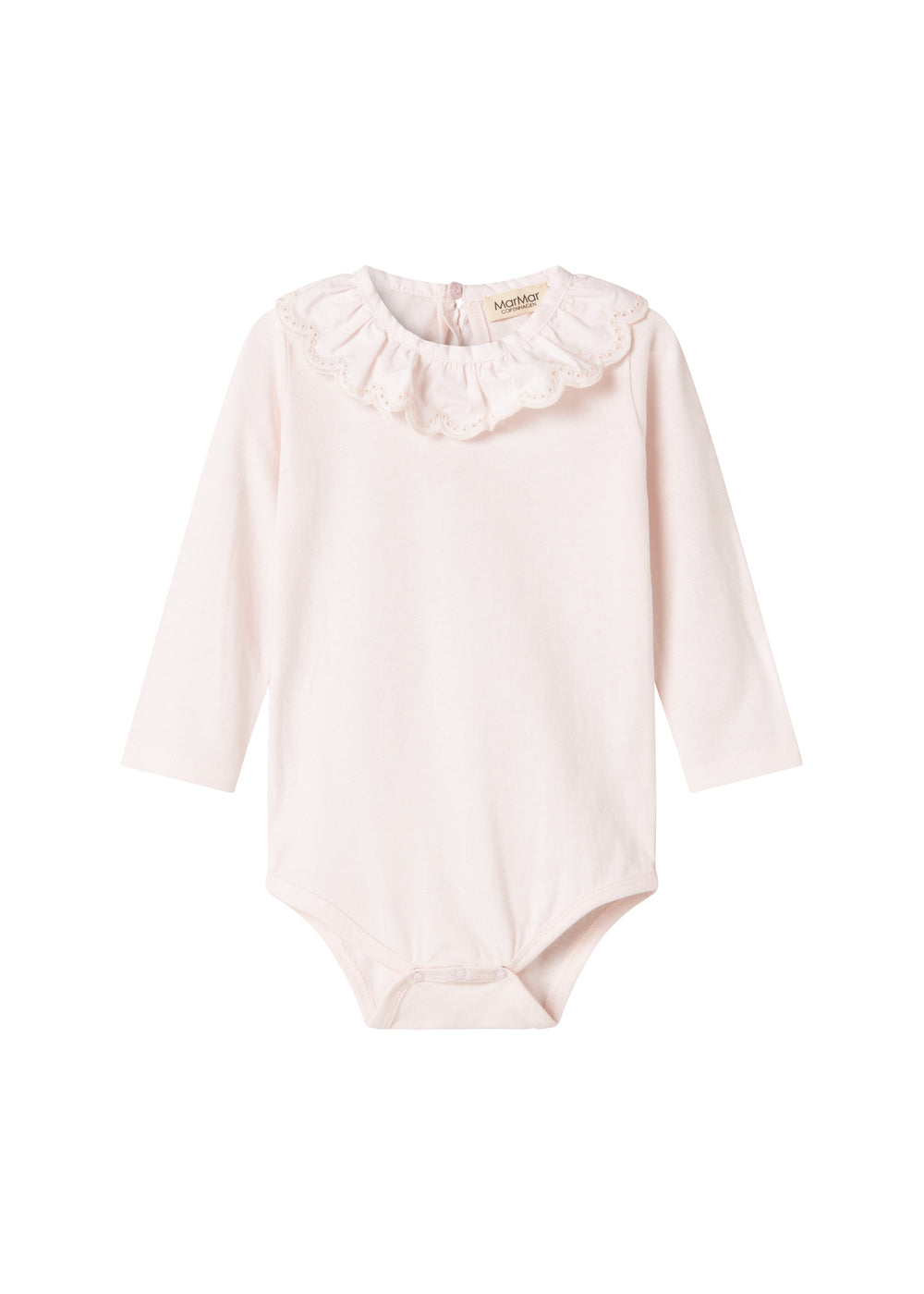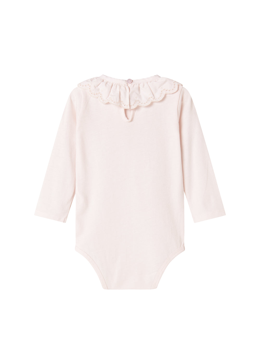 Long-sleeved bodystocking with a round collar and lace pattern details. The bodystocking closes with a button closure at the back. The bodystocking is soft, stretchy and comfortable to wear.