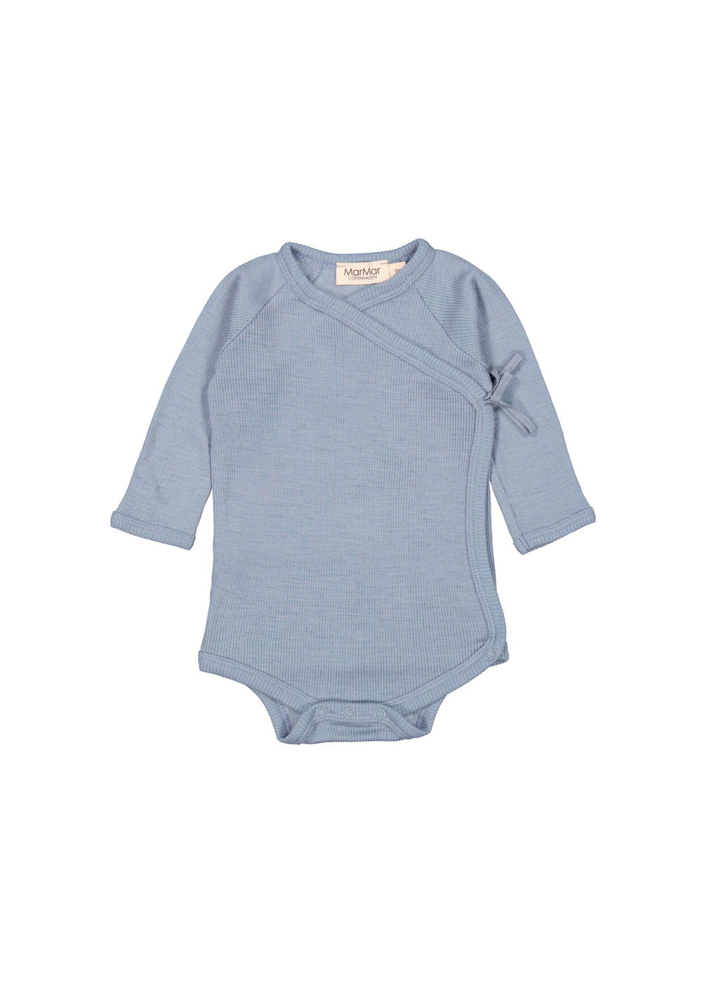Long-sleeved bodystocking for newborns with wrap-around closure. Closes with snaps and ties