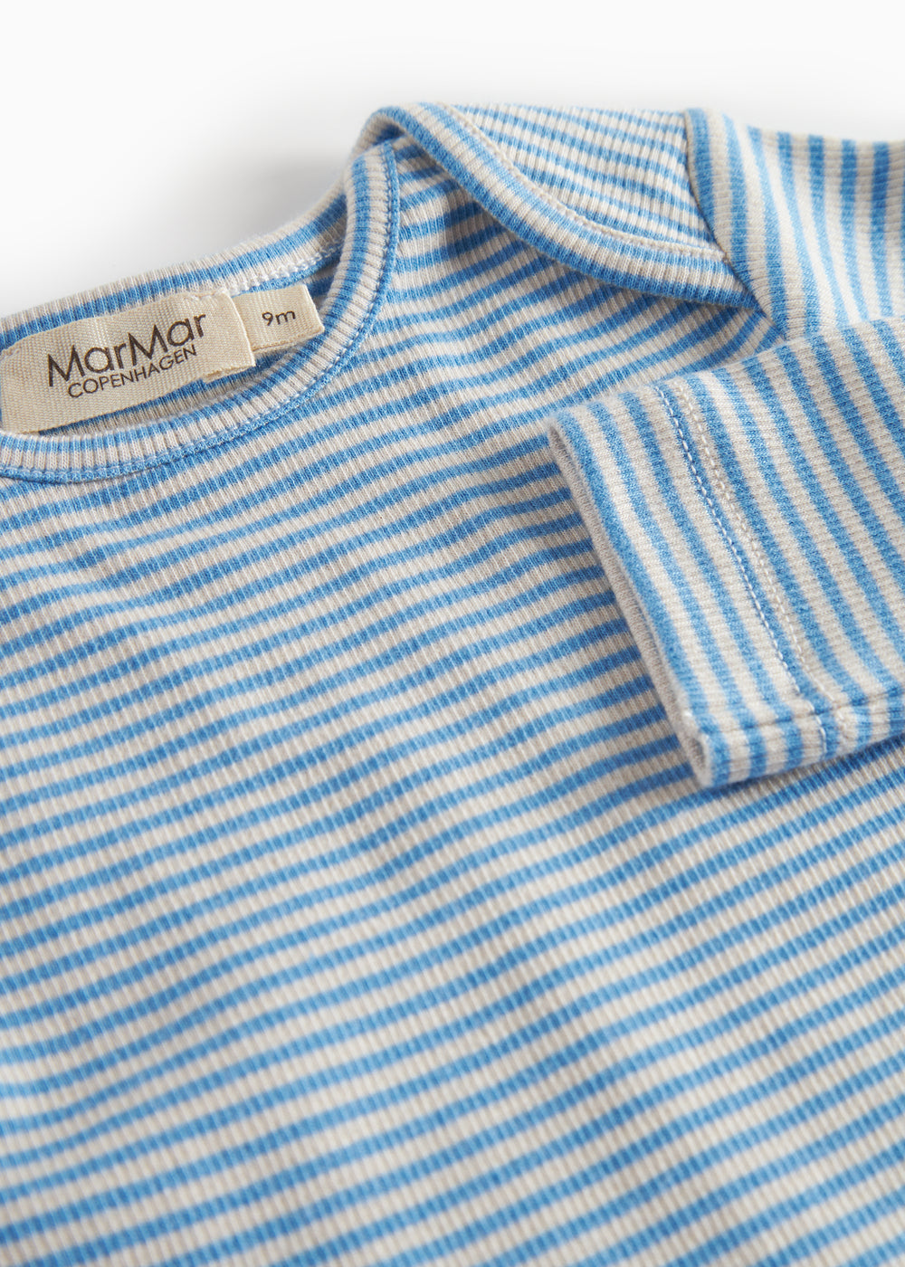 Long-sleeved bodystocking for baby with fine stripes and a smart neck opening that can be easily pulled down the body. The bodystocking closes with snaps between the legs for easy diaper changes. The bodystocking is both soft, holds its shape and color and has elastane in it, which makes it stretchy and comfortable to wear.