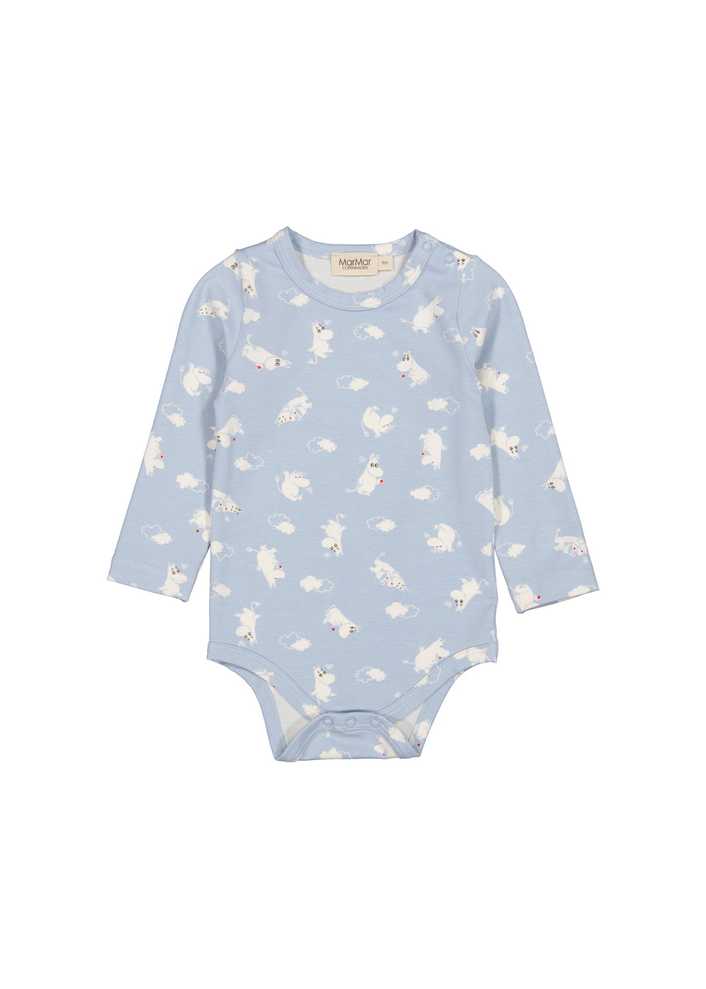 Simple long-sleeved bodystocking with Moomin print, which is closed with snaps on the left shoulder and between the legs for easy diaper changes. The bodystocking is soft, stretchy and comfortable to wear.