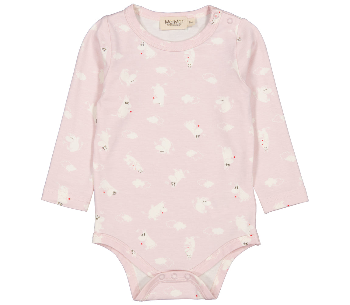 Simple long-sleeved bodystocking with Moomin print, which is closed with snaps on the left shoulder and between the legs for easy diaper changes. The bodystocking is soft, stretchy and comfortable to wear.