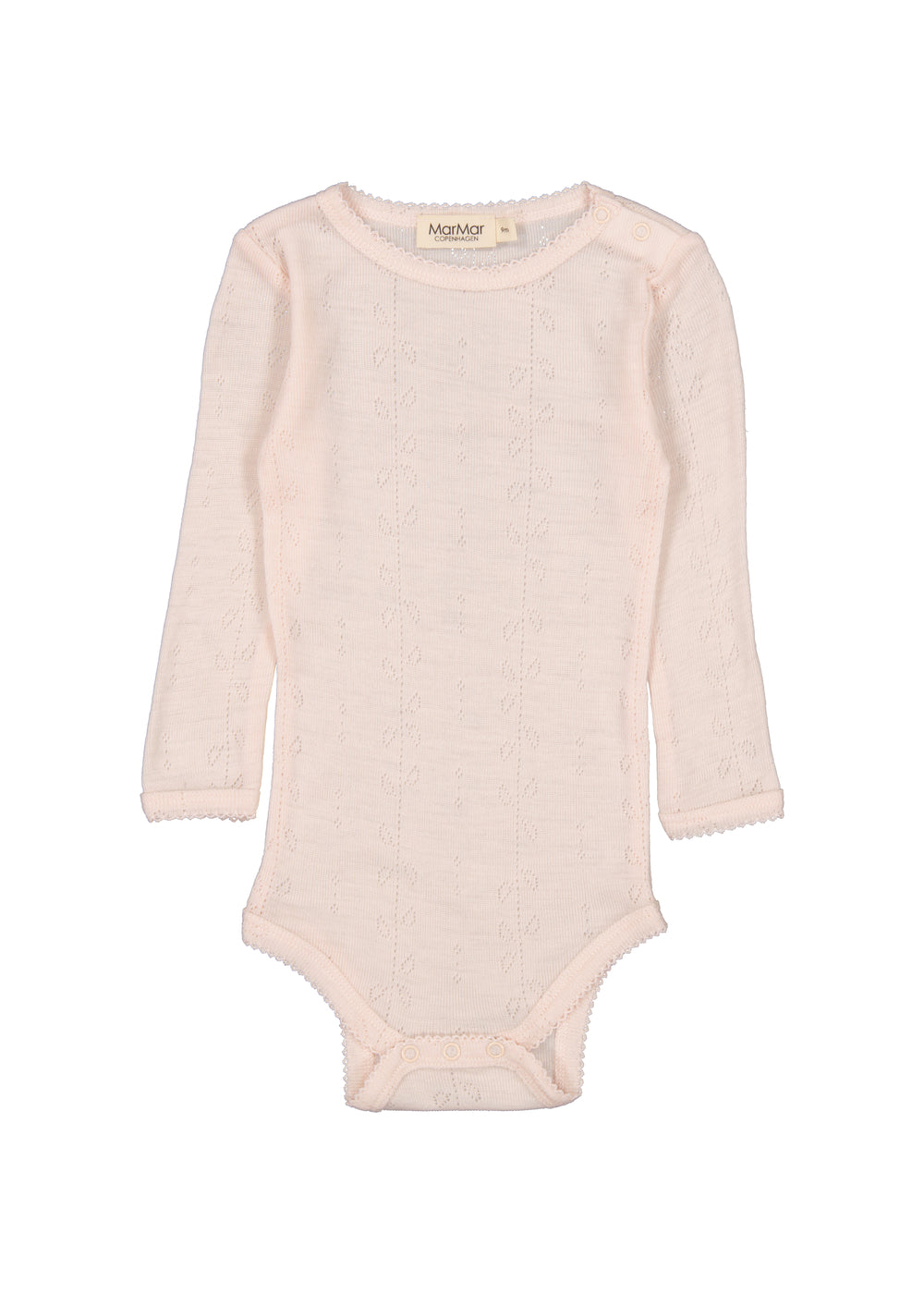 Simple long-sleeved bodystocking that closes with snaps on the left shoulder and between the legs for easy diaper changes. The bodystocking has fine pointelle details and picot edges.