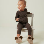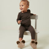 Simple long-sleeved bodystocking that closes with snaps on the left shoulder and between the legs for easy diaper changes.