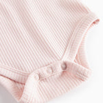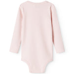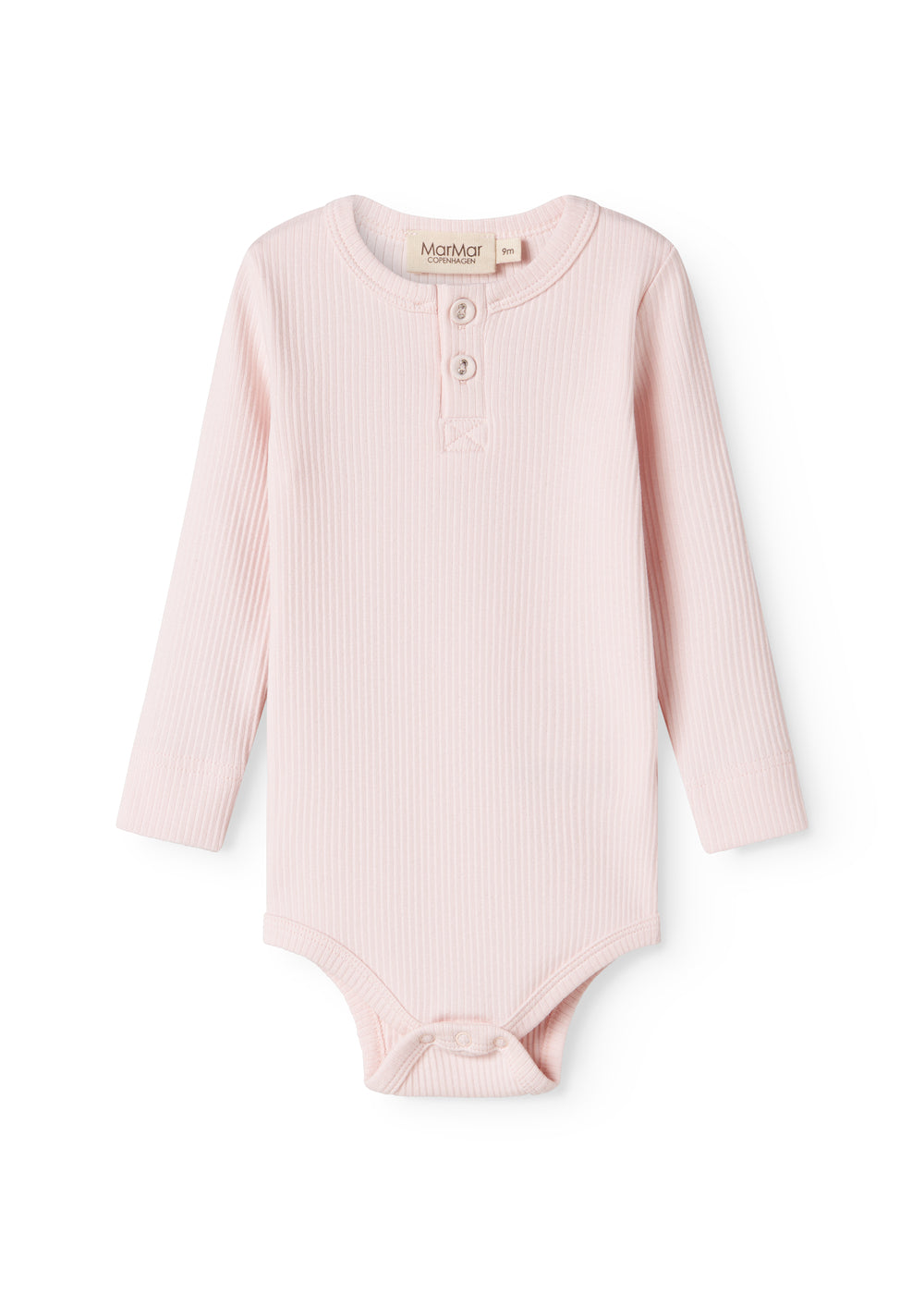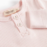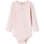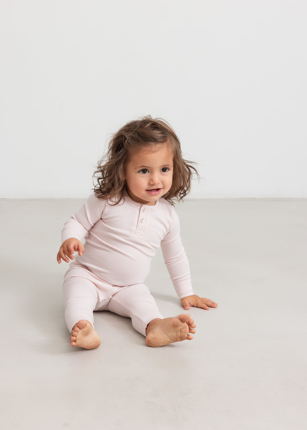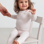 Long-sleeved baby modal bodystocking with placket button closure that is closed with snaps between the legs for easy diaper changes.