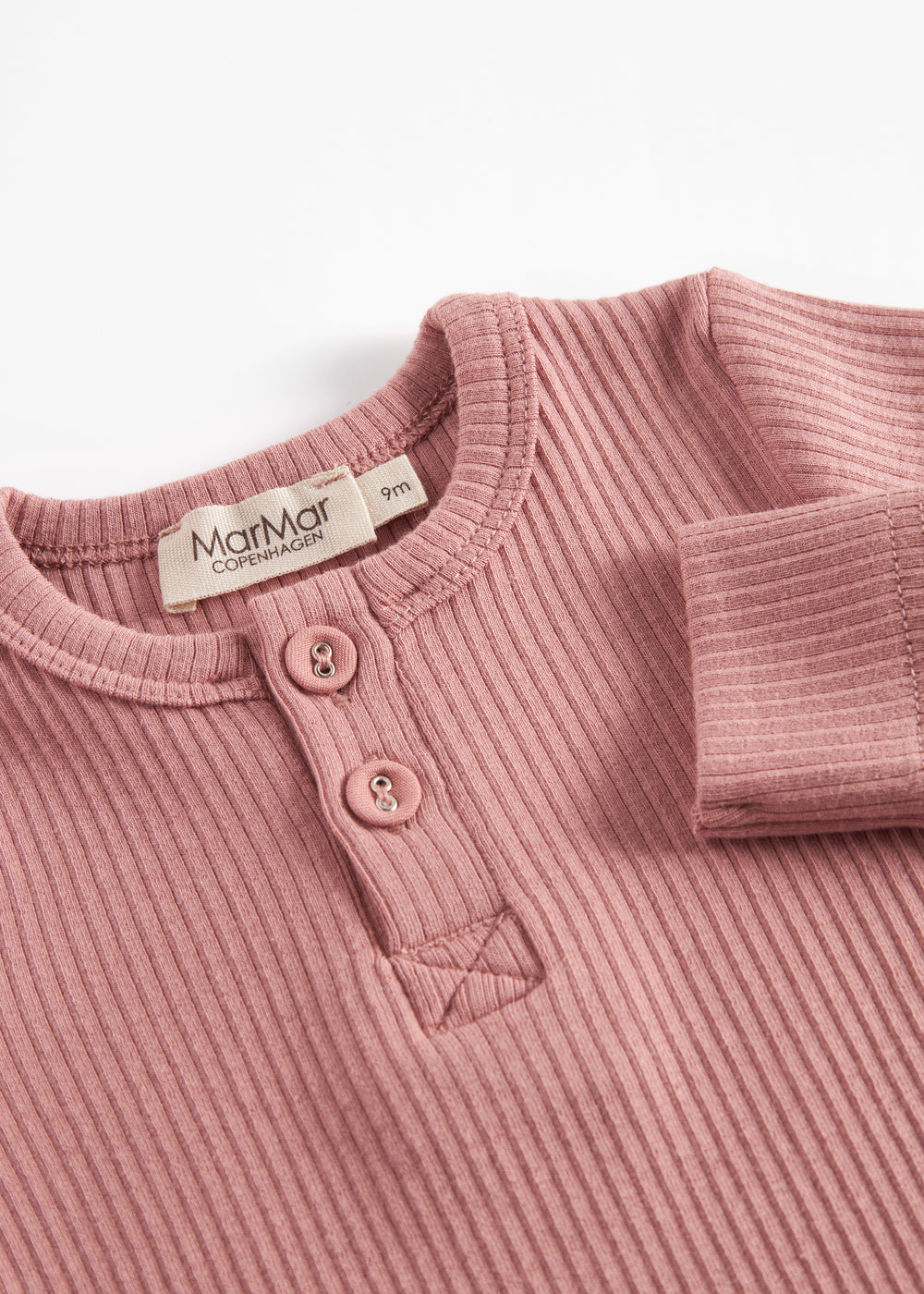 Long-sleeved baby modal bodystocking with placket button closure, which is closed with snaps between the legs for easy diaper changes. The bodystocking is ribbed, soft, holds its shape and color and has elastane in it, which makes it stretchy and comfortable to wear.